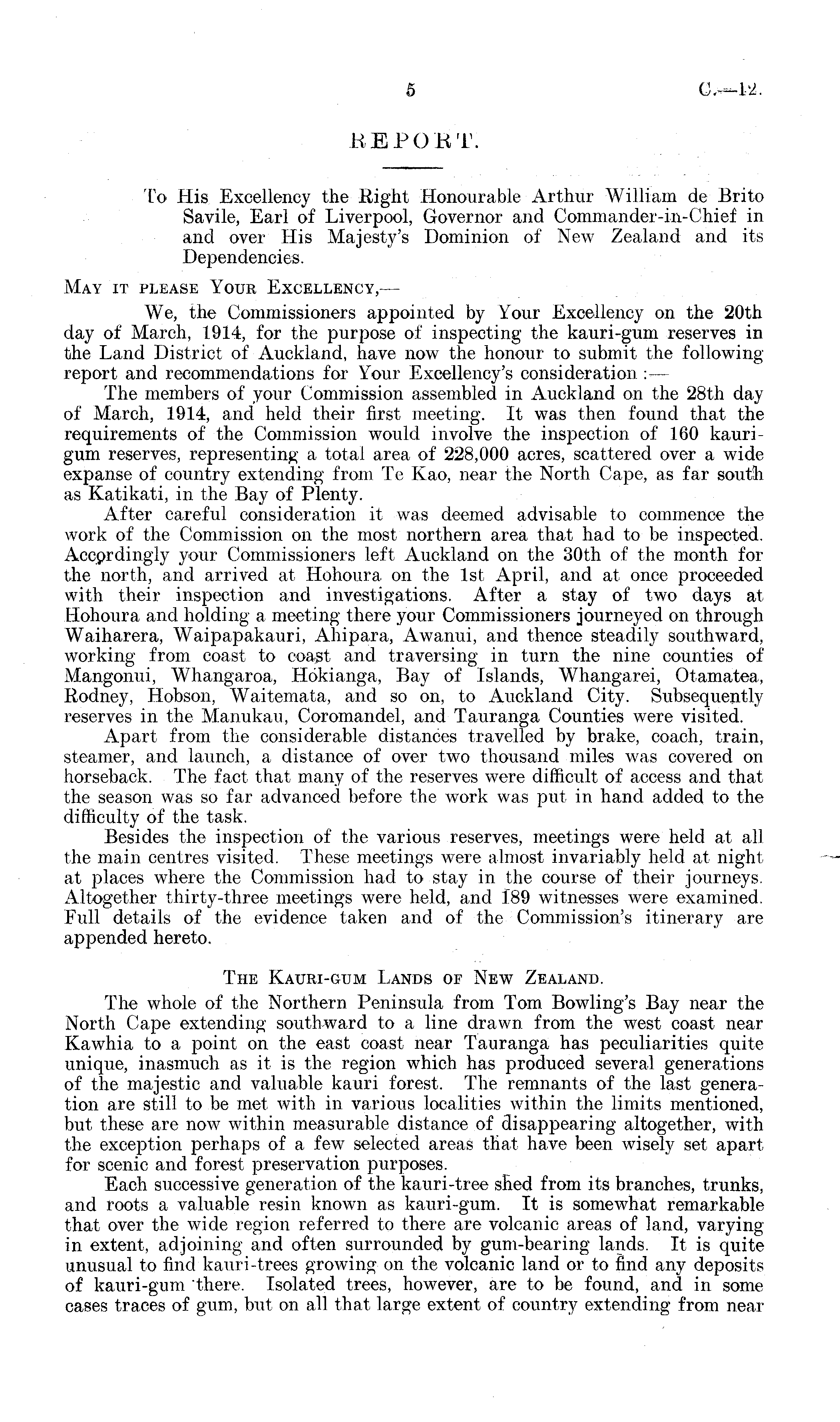 rbpobt; To His Excellency the Right Honourable Arthur William de Brito Savile, Earl of Liverpool, Governor and Commander-in-Chief in and over His Majesty's Dominion of New Zealand and its Dependencies. May it please Your Excellency,— We, the Commissioners appointed by Your Excellency on the 20th day of March, 1914, for the purpose of inspecting the kauri-gum reserves in the Land District of Auckland, have now the honour to submit the following report and recommendations for Your Excellency's consideration : — The members of your Commission assembled in Auckland on the 28th day of March, 1914, and held their first meeting. It was then found that the requirements of the Commission would involve the inspection of 160 kaurigum reserves, representing a total area of 228,000 acres, scattered over a wide expanse of country extending from Te Kao, near the North Cape, as far south as Katikati, in the Bay of Plenty. After careful consideration it was deemed advisable to commence the work of the Commission on the most northern area that had to be inspected. Accordingly your Commissioners left Auckland on the 30th of the month for the north, and arrived at Hohoura on the Ist April, and at once proceeded with their inspection and investigations. After a stay of two days at Hohoura and holding a meeting there your Commissioners journeyed on through Waiharera, Waipapakauri, Ahipara, Awanui, and thence steadily southward, working from coast to coast and traversing in turn the nine counties of Mangonui, Whangaroa, Hokianga, Bay of Islands, Whangarei, Otamatea, Rodney, Hobson, Waitemata, and so on, to Auckland City. Subsequently reserves in the Manukau, Coromandel, and Tauranga Counties were visited. Apart from the considerable distances travelled by brake, coach, train, steamer, and launch, a distance of over two thousand miles was covered on horseback. The fact that many of the reserves were difficult of access and that the season was so far advanced before the work was put in hand added to the difficulty of the task. Besides the inspection of the various reserves, meetings were held at all the main centres visited. These meetings were almost invariably held at night at places where the Commission had to stay in the course of their journeys. Altogether thirty-three meetings were held, and 189 witnesses were examined. Full details of the evidence taken and of the Commission's itinerary are appended hereto. The Kauri-gum Lands of New Zealand. The whole of the Northern Peninsula from Tom Bowling's Bay near the North Cape extending southward to a line drawn from the west coast near Kawhia to a point on the east coast near Tauranga has peculiarities quite unique, inasmuch as it is the region which has produced several generations of the majestic and valuable kauri forest. The remnants of the last generation are still to be met with in various localities within the limits mentioned, but these are now within measurable distance of disappearing altogether, with the exception perhaps of a few selected areas that have been wisely set apart for scenic and forest preservation purposes. Each successive generation of the kauri-tree shed from its branches, trunks, and roots a valuable resin known as kauri-gum. It is somewhat remarkable that over the wide region referred to there are volcanic areas of land, varying in extent, adjoining and often surrounded by gum-bearing lands. It is quite unusual to find kauri-trees growing on the volcanic land or to find any deposits of kauri-gum "there. Isolated trees, however, are to be found, and in some cases traces of gum, but on all that large extent of country extending from near