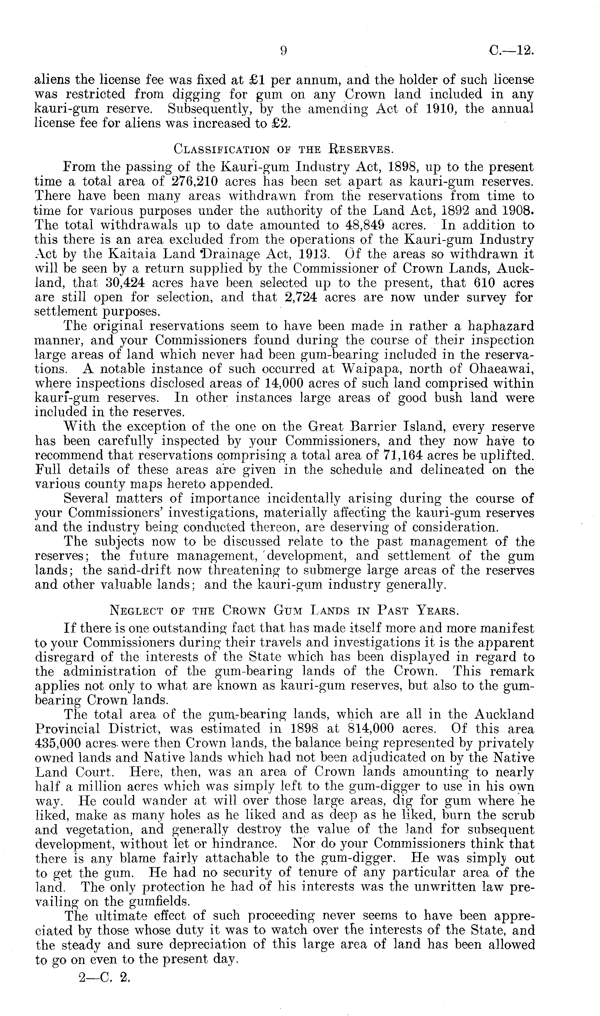 aliens the license fee was fixed at £1 per annum, and the holder of such license was restricted from digging for gum on any Crown land included in any kauri-gum reserve. Subsequently, by the amending Act of 1910, the annual license fee for aliens was increased to £2. Classification of the Reserves. From the passing of the Kauri-gum Industry Act, 1898, up to the present time a total area of 276,210 acres has been set apart as kauri-gum reserves. There have been many areas withdrawn from the reservations from time to time for various purposes under the authority of the Land Act, 1892 and 1908. The total withdrawals up to date amounted to 48,849 acres. In addition to this there is an area excluded from the operations of the Kauri-gum Industry Act by the Kaitaia Land 'Drainage Act, 1913. Of the areas so withdrawn it will be seen by a return supplied by the Commissioner of Crown Lands, Auckland, that 30,424 acres have been selected up to the present, that 610 acres are still open for selection, and that 2,724 acres are now under survey for settlement purposes. The original reservations seem to have been made in rather a haphazard manner, and your Commissioners found during the course of their inspection large areas of land which never had been gum-bearing included in the reservations. A notable instance of such occurred at Waipapa, north of Ohaeawai, where inspections disclosed areas of 14,000 acres of such land comprised within kauri-gum reserves. In other instances large areas of good bush land were included in the reserves. With the exception of the one on the Great Barrier Island, every reserve has been carefully inspected by your Commissioners, and they now have to recommend that reservations comprising a total area of 71,164 acres be uplifted. Full details of these areas are given in the schedule and delineated on the various county maps hereto appended. Several masters of importance incidentally arising during the course of your Commissioners' investigations, materially affecting the kauri-gum reserves and the industry being conducted thereon, are deserving of consideration. The subjects now to be discussed relate to the past management of the reserves; the future management, development, and settlement of the gum lands; the sand-drift now threatening to submerge large areas of the reserves and other valuable lands; and the kauri-gum industry generally. Neglect of the Crown Gum Lands in Past Years. If there is one outstanding fact that has made itself more and more manifest to your Commissioners during their travels and investigations it is the a.pparent disregard of the interests of the State which has been displayed in regard to the administration of the gum-bearing lands of the Crown. This remark applies not only to what are known as kauri-gum reserves, but also to the gumbearing Crown lands. The total area of the gum-bearing lands, which are all in the Auckland Provincial District, was estimated in 1898 at 814,000 acres. Of this area 435,000 acres were then Crown lands, the balance being represented by privately owned lands and Native lands which had not been adjudicated on by the Native Land Court, Here, then, was an area of Crown lands amounting to nearly half a million acres which was simply left to the gum-digger to use in his own way. He could wander at will over those large areas, dig for gum where he liked, make as many holes as he liked and as deep as he liked, burn the scrub and vegetation, and generally destroy the value of the land for subsequent development, without let or hindrance. Nor do your Commissioners think that there is any blame fairly attachable to the gum-digger. He was simply out to get the gum. He had no security of tenure of any particular area of the land. The only protection he had of his interests was the unwritten law prevailing on the gumfields. The ultimate effect of such proceeding never seems to have been appreciated by those whose duty it was to watch over the interests of the State, and the steady and sure depreciation of this large area of land has been allowed to go on even to the present day.