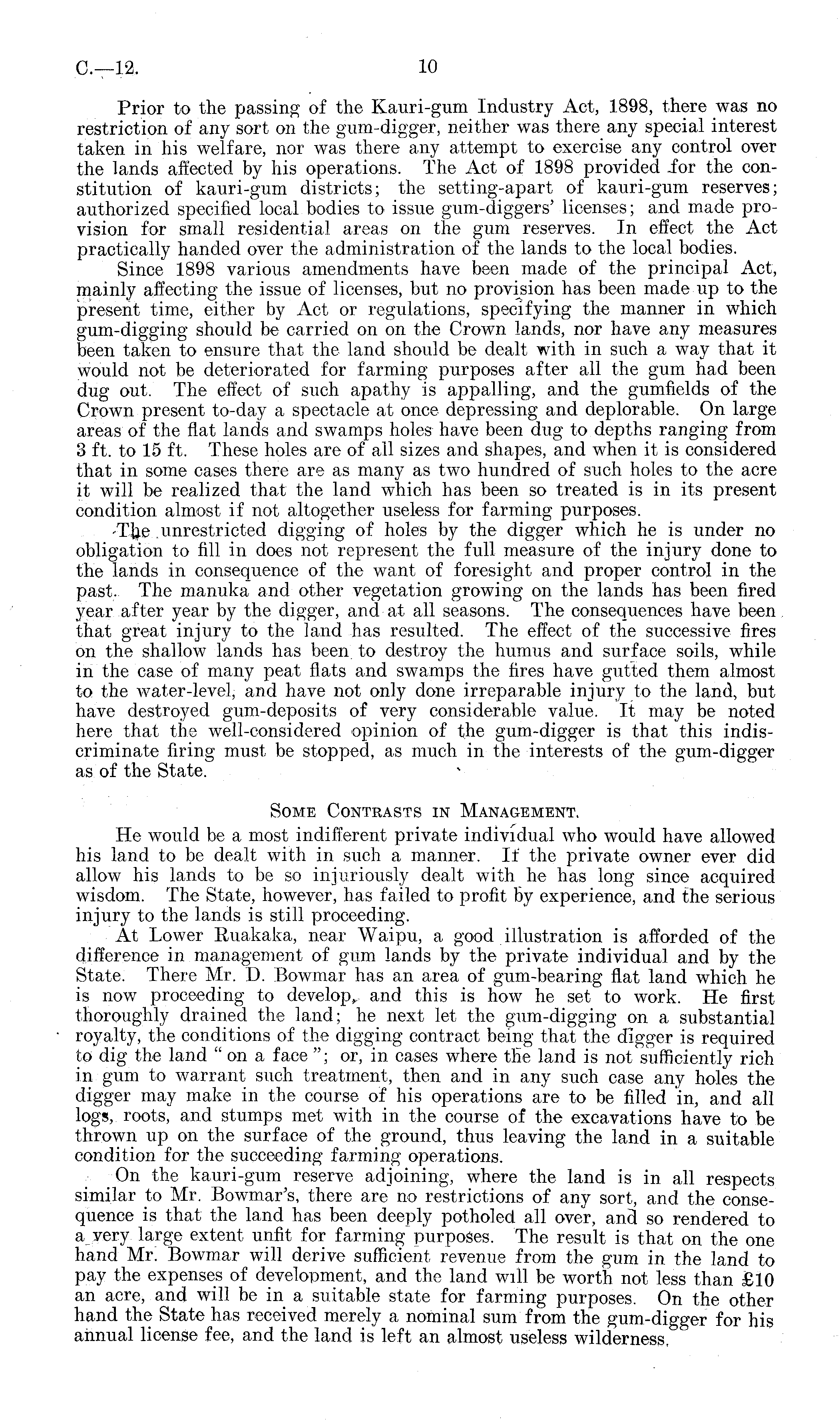Prior to the passing of the Kauri-gum Industry Act, 1898, there was no restriction of any sort on the gum-digger, neither was there any special interest taken in his welfare, nor was there any attempt to exercise any control over the lands affected by his operations. The Act of 1898 provided for the constitution of kauri-gum districts; the setting-apart of kauri-gum reserves; authorized specified local bodies to issue gum-diggers' licenses; and made provision for small residential areas on the gum reserves. In effect the Act practically handed over the administration of the lands to the local bodies. Since 1898 various amendments have been made of the principal Act, mainly affecting the issue of licenses, but no provision has been made up to the present time, either by Act or regulations, specifying the manner in which gum-digging should be carried on on the Crown lands, nor have any measures been taken to ensure that the land should be dealt with in such a way that it would not be deteriorated for farming purposes after all the gum had been dug out. The effect of such apathy is appalling, and the gumfields of the Crown present to-day a spectacle at once depressing and deplorable. On large areas of the flat lands and swamps holes have been dug to depths ranging from 3 ft. to 15 ft. These holes are of all sizes and shapes, and when it is considered that in some cases there are as many as two hundred of such holes to the acre it will be realized that the land which has been so treated is in its present condition almost if not altogether useless for farming purposes. The unrestricted digging of holes by the digger which he is under no obligation to fill in does not represent the full measure of the injury done to the lands in consequence of the want of foresight and proper control in the past. The manuka and other vegetation growing on the lands has been fired year after year by the digger, and at all seasons. The consequences have been that great injury to the land has resulted. The effect of the successive fires on the shallow lands has been to destroy the humus and surface soils, while in the case of many peat flats and swamps the fires have gutted them almost to the water-level, and have not only done irreparable injury to the land, but have destroyed gum-deposits of very considerable value. It may be noted here that the well-considered opinion of the gum-digger is that this indiscriminate firing must be stopped, as much in the interests of the gum-digger as of the State. Some Contrasts in Management. He would be a most indifferent private individual who would have allowed his land to be dealt with in such a manner. If the private owner ever did allow his lands to be so injuriously dealt with he has long since acquired wisdom. The State, however, has failed to profit by experience, and the serious injury to the lands is still proceeding. At Lower Ruakaka, near Waipu, a good illustration is afforded of the difference in management of gum lands by the private individual and by the State. There Mr. D. Bowmar has an area of gum-bearing flat land which he is now proceeding to develop, and this is how he set to work. He first thoroughly drained the land; he next let the gum-digging on a substantial royalty, the conditions of the digging contract being that the digger is required to dig the land "on a face "; or, in cases where the land is not sufficiently rich in gum to warrant such treatment, then and in any such case any holes the digger may make in the course of his operations are to be filled in, and all logs, roots, and stumps met with in the course of the excavations have to be thrown up on the surface of the ground, thus leaving the land in a suitable condition for the succeeding farming operations. On the kauri-gum reserve adjoining, where the land is in all respects similar to Mr. Bowmar's, there are no restrictions of any sort, and the consequence is that the land has been deeply potholed all over, and so rendered to a very large extent unfit for farming purposes. The result is that on the one hand Mr. Bowmar will derive sufficient revenue from the gum in the land to pay the expenses of development, and the land will be worth not less than £10 an acre, and will be in a suitable state for farming purposes. On the other hand the State has received merely a nominal sum from the gum-digger for his annual license fee, and the land is left an almost useless wilderness.