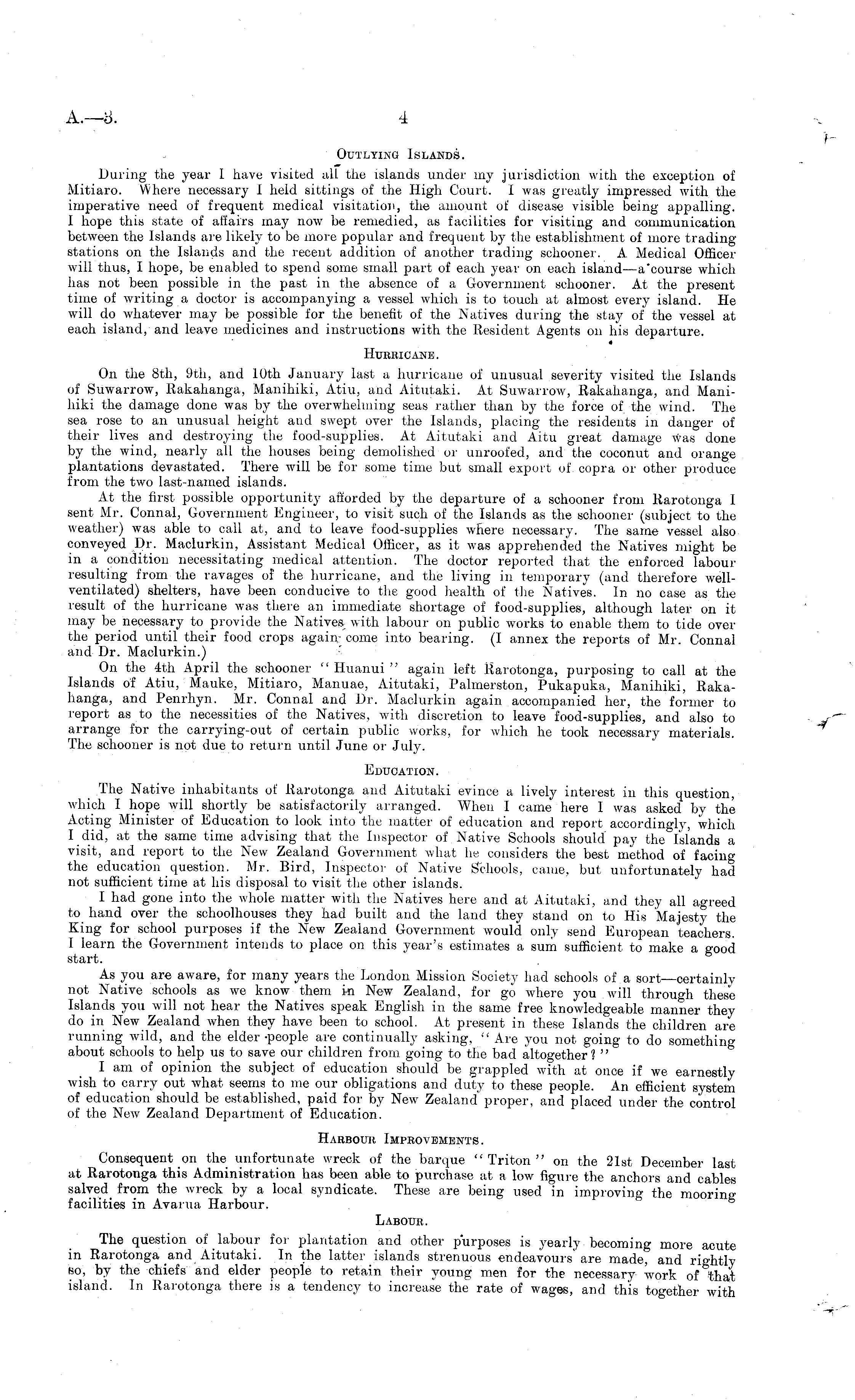 Outlying Islands. During the year I have visited all the islands under my jurisdiction with the exception of Mitiaro. YVhere necessary 1 held sittings of the High Court. 1 was greatly impressed with the imperative need of frequent medical visitation, the amount of disease visible being apjJalling. I hope this state of affairs may now be remedied, as facilities for visiting and communication between the Islands are likely to be more popular and frequent by the establishment of more trading stations on the Islands and the recent addition of another trading schooner. A Medical Officer will thus, I hope, be enabled to spend some small part of each year on each island—a'course which has not been possible in the past in the absence of a Government schooner. At the present time of writing a doctor is accompanying a vessel which is to touch at almost every island. He will do whatever may be possible for the benefit of the Natives during the stay of the vessel at each island, and leave medicines and instructions with the Resident Agents on his departure. « HURRICANE. On the Bth, 9th, and 10th January last a hurricane of unusual severity visited the Islands of Suwarrow, Rakahanga, Manihiki, Atiu, and Aitutaki. At Suwarrow, Rakahanga, and Manihiki the damage done was by the overwhelming seas rather than by the force of the wind. The sea rose to an unusual height and swept over the Islands, placing the residents in danger of their lives and destroying the food-supplies. At Aitutaki and Aitu great damage was done by the wind, nearly all the houses being demolished or unroofed, and the coconut and orange plantations devastated. There will be for some time but small export of. copra or other produce from the two last-named islands. At the first possible opportunity afforded by the departure of a schooner from Rarotonga I sent Mr. Connal, Government Engineer, to visit such of the Islands as the schooner (subject to the weather) was able to call at, and to leave food-supplies where necessary. The same vessel also conveyed Dr. Maclurkin, Assistant Medical Officer, as it was apprehended the Natives might be in a condition necessitating medical attention. The doctor reported that the enforced labour resulting from the ravages of the Hurricane, and the living in temporary (and therefore wellventilated) shelters, have been conducive to the good health of the Natives. In no case as the result of the hurricane was there an immediate shortage of food-supplies, although later on it may be necessary to provide the Natives with labour on public works to enable them to tide over the period until their food crops again come into bearing. (I annex the reports of Mr. Connal and Dr. Maclurkin.) On the 4th April the schooner " Huanui " again left Rarotonga, purposing to call at the Islands of Atiu, Mauke, Mitiaro, Manuae, Aitutaki, Palmerston, Pukapuka, Manihiki, Rakahanga, and Penrhyn. Mr. Connal and Dr. Maclurkin again accompanied her, the former to report as to the necessities of the Natives, with discretion to leave food-supplies, and also to arrange for the carrying-out of certain public works, for which he took necessary materials. The schooner is not due to return until June or July. Education. The Native inhabitants of Rarotonga and Aitutaki evince a lively interest in this question, which I hope will shortly be satisfactorily arranged. When I came here I was asked by the Acting Minister of Education to look into the matter of education and report accordingly, which I did, at the same time advising that the Inspector of Native Schools should pay the Islands a visit, and report to the New Zealand Government what he considers the best method of facing the education question. Mr. Bird, Inspector of Native Schools, came, but unfortunately had not sufficient time at his disposal to visit the other islands. I had gone into the whole matter with the Natives here and at Aitutaki, and they all agreed to hand over the schoolhouses they had built and the land they stand on to His Majesty the King for school purposes if the New Zealand Government would only send European teachers. I learn the Government intends to place on this year's estimates a sum sufficient to make a good start. As you are aware, for many years the London Mission Society had schools of a sort—certainly not Native schools as we know them ki New Zealand, for go where you will through these Islands you will not hear the Natives speak English in the same free knowledgeable manner they do in New Zealand when they have been to school. At present in these Islands the children are running wild, and the elder-people are continually asking, "Are you not going to do something about schools to help us to save our children from going to the bad altogether? " I am of opinion the subject of education should be grappled with at once if we earnestly wish to carry out what seems to me our obligations and duty to these people. An efficient system of education should be established, paid for by New Zealand proper, and placed under the control of the New Zealand Department of Education. Harbour Improvements. Consequent on the unfortunate wreck of the barque " Triton " on the 21st December last at Rarotonga this Administration has been able to purchase at a low figure the anchors and cables salved from the wreck by a local syndicate. These are being used in improving the mooring facilities in Avarua Harbour. Labour. The question of labour for plantation and other purposes is yearly becoming more acute in Rarotonga and Aitutaki. In the latter islands strenuous endeavours are made, and rightly no, by the chiefs and elder people to retain their young men for the necessary work of that island. In Rarotonga there is a tendency to increase the rate of wages, and this together with