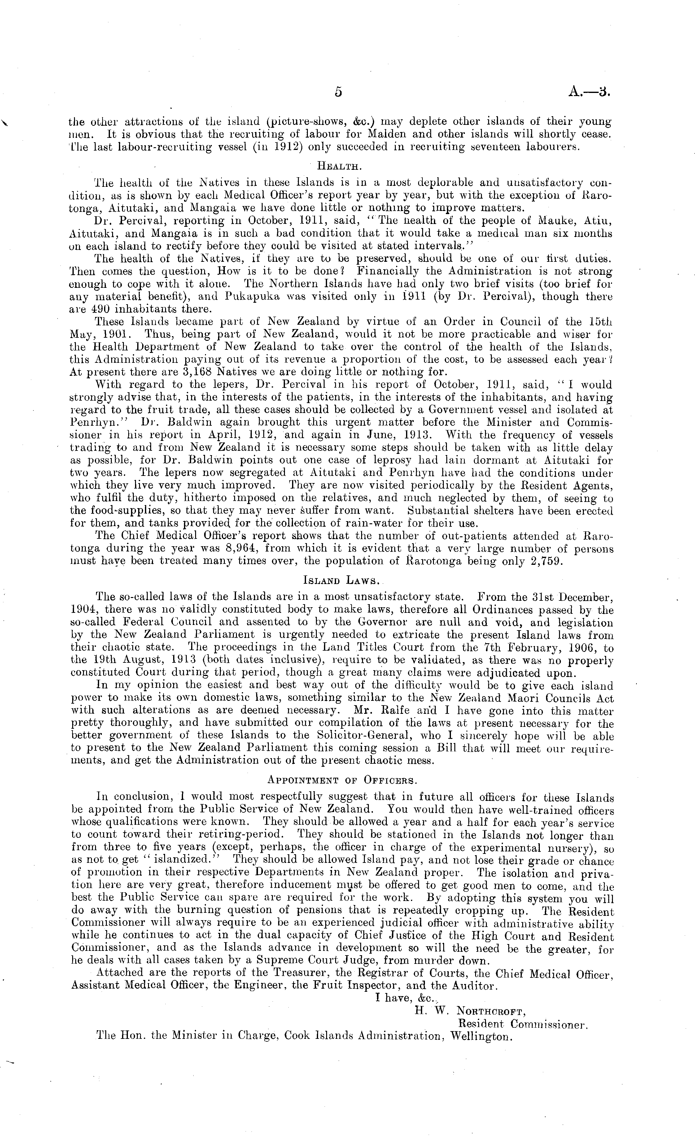 the other attractions of the island (picture-shows, &c.) may deplete other islands of their young men. It is obvious that the recruiting of labour for Maiden and other islands will shortly cease. The last labour-recruiting vessel (in 1912) only succeeded in recruiting seventeen labourers. Health. The health of the Natives in these Islands is in a most deplorable and unsatisfactory condition, as is shown by each Medical Officer's report year by year, but with the exception of Rarotonga, Aitutaki, and Mangaia we have done little or nothing to improve matters. Dr. Percival, reporting in October, 1911, said, " The Health of the people of Mauke, Atiu, Aitutaki, and Mangaia is in such a bad condition that it would take a medical man six months on each island to rectify before they could be visited at stated intervals." The health of the Natives, if they are to be preserved, should be one of our first duties. Then comes the question, How is it to be done? Financially the Administration is not strong enough to cope with it alone. The Northern Islands have had only two brief visits (too brief for any material benefit), and Pukapuka was visited only in 1911 (by Dr. Percival), though there are 490 inhabitants there. These Islands became part of New Zealand by virtue of an Order in Council of the 15th May, 1901. Thus, being part of New Zealand, would it not be more practicable and wiser for the Health Department of New Zealand to take over the control of the health of the Islands, this Administration paying out of its revenue a proportion of the cost, to be assessed each year. At present there are 3,168 Natives we are doing little or nothing for. With regard to the lepers, Dr. Percival in his report of October, 1911, said, " I would strongly advise that, in the interests of the patients, in the interests of the inhabitants, and having regard to the fruit trade, all these cases should be collected by a Government vessel and isolated at Penrhyn." Dr. Baldwin again brought this urgent matter before the Minister and Commissioner in his report in April, 1912, and again in June, 1913. With the frequency of vessels trading to and from New Zealand it is necessary some steps should be taken with as little delay as possible, for Dr. Baldwin points out one case of leprosy had lain dormant at Aitutaki for two years. The lepers now segregated at Aitutaki and Penrhyn have had the conditions under which they live very much improved. They are now visited periodically by the Resident Agents, who fulfil the duty, hitherto imposed on the relatives, and much neglected by them, of seeing to the food-supplies, so that they may never suffer from want. Substantial shelters have been erected for them, and tanks provided for the collection of rain-water for their use. The Chief Medical Officer's report shows that the number of out-patients attended at Rarotonga during the year was 8,964, from which it is evident that a very large number of persons must have been treated many times over, the population of Rarotonga being only 2,759. Island Laws. The so-called laws of the Islands are in a most unsatisfactory state. From the 31st December, 1904, there was no validly constituted body to make laws, therefore all Ordinances passed by the so-called Federal Council and assented to by the Governor are null and void, and legislation by the New Zealand Parliament is urgently needed to extricate the present Island laws from their chaotic state. The proceedings in the Land Titles Court from the 7th February, 1906, to the 19th August, 1913 (both dates inclusive), require to be validated, as there was no properly constituted Court during that period, though a great many claims were adjudicated upon. In my opinion the easiest and best way out of the difficulty would be to give each island power to make its own domestic laws, something similar to the New Zealand Maori Councils Act with such alterations as are deemed necessary. Mr. Ralfe arid I have gone into this matter pretty thoroughly, and have submitted our compilation of the laws at present necessary for the better government of these Islands to the Solicitor-General, who I sincerely hope will be able to present to the New Zealand Parliament this coming session a Bill that will meet our requirements, and get the Administration out of the present chaotic mess. Appointment of Officers. In conclusion, 1 would most respectfully suggest that in future all officers for these Islands be appointed from the Public Service of New Zealand. You would then have well-trained officers whose qualifications were known. They should be allowed a year and a half for each year's service to count toward their retiring-period. They should be stationed in the Islands not longer than from three to five years (except, perhaps, the officer in charge of the experimental nursery), so as not to get " islandized." They should be allowed Island pay, and not lose their grade or chance of promotion in their respective Departments in New Zealand proper. The isolation and privation here are very great, therefore inducement must be offered to get good men to come, and the best the Public Service can spare are required for the work. By adopting this system you will do away with the burning question of pensions that is repeatedly cropping up. The Resident Commissioner will always require to be an experienced judicial officer with administrative ability while he continues to act in the dual capacity of Chief Justice of the High Court and Resident Commissioner, and as the Islands advance in development so will the need be the greater, for he deals with all cases taken by a Supreme Court Judge, from murder down. Attached are the reports of the Treasurer, the Registrar of Courts, the Chief Medical Officer, Assistant Medical Officer, the Engineer, the Fruit Inspector, and the Auditor. I have, &c. ; . H. W. NORTHCROFT, Resident Commissioner. The Hon. the Minister in Charge, Cook Islands Administration, Wellington.