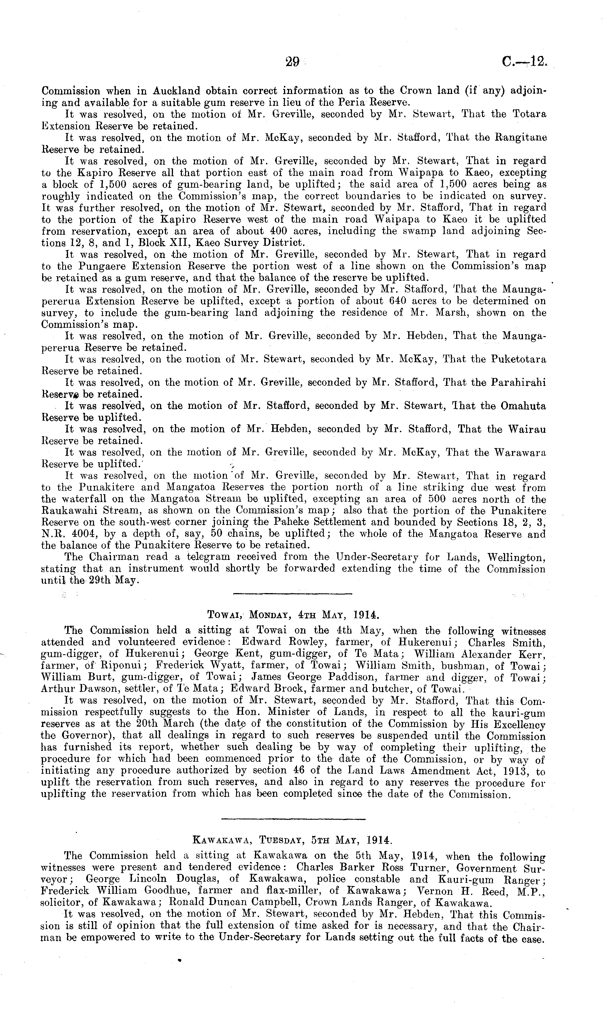 Commission when in Auckland obtain correct information as to the Crown land (if any) adjoining and available for a suitable gum reserve in lieu of the Peria Reserve. It was resolved, on the motion of Mr. Greville, seconded by Mr. Stewart, That the Totara Extension Reserve be retained. It was resolved, on the motion of Mr. McKay, seconded by Mr. Stafford, That the Rangitane Reserve be retained. It was resolved, on the motion of Mr. Greville, seconded by Mr. Stewart, That in regard to the Kapiro Reserve all that portion east of the main road from Waipapa to Kaeo, excepting a block of 1,500 acres of gum-bearing land, be uplifted; the said area of 1,500 acres being as roughly indicated on the Commission's map, the correct boundaries to be indicated on survey. It was further resolved, on the motion of Mr. Stewart, seconded by Mr. Stafford, That in regard to the portion of the Kapiro Reserve west of the main road Waipapa to Kaeo it be uplifted from reservation, except an area of about 400 acres, including the swamp land adjoining Sections 12, 8, and 1, Block XII, Kaeo Survey District. It was resolved, on the motion of Mr. Greville, seconded by Mr. Stewart, That in regard to the Pungaere Extension Reserve the portion west of a line shown on the Commission's map be retained as a gum reserve, and that the balance of the reserve be uplifted. It was resolved, on the motion of Mr. Greville, seconded by Mr. Stafford, That the Maungapererua Extension Reserve be uplifted, except a portion of about 640 acres to be determined on survey, to include the gum-bearing land adjoining the residence of Mr. Marsh, shown on the Commission's map. It was resolved, on the motion of Mr. Greville, seconded by Mr. Hebden, That the Maungapererua Reserve be retained. It was resolved, on the motion of Mr. Stewart, seconded by Mr. McKay, That the Puketotara Reserve be retained. It was resolved, on the motion of Mr. Greville, seconded by Mr. Stafford, That the Parahirahi Reserve be retained. It was resolved, on the motion of Mr. Stafford, seconded by Mr. Stewart, That the Omahuta Reserve be uplifted. It was resolved, on the motion of Mr. Hebden, seconded by Mr. Stafford, That the Wairau Reserve be retained. It was resolved, on the motion of Mr. Greville, seconded by Mr. McKay, That the Warawara Reserve be uplifted. It was resolved, on the motion'of Mr. Greville, seconded by Mr. Stewart, That in regard to the Punakitere and Mangatoa Reserves the portion north of a line striking due west from the waterfall on the Mangatoa Stream be uplifted, excepting an area of 500 acres north of the Raukawahi Stream, as shown on the Commission's map; also that the portion of the Punakitere Reserve on the south-west corner joining the Puheke Settlement and bounded by Sections 18, 2, 3, N.R. 4004, by a depth of, say, 50 chains, be uplifted; the whole of the Mangatoa Reserve and the balance of the Punakitere Reserve to be retained. The Chairman read a telegram received from the Under-Secretary for Lands, Wellington, stating that an instrument would shortly be forwarded extending the time of the Commission until the 29th May.