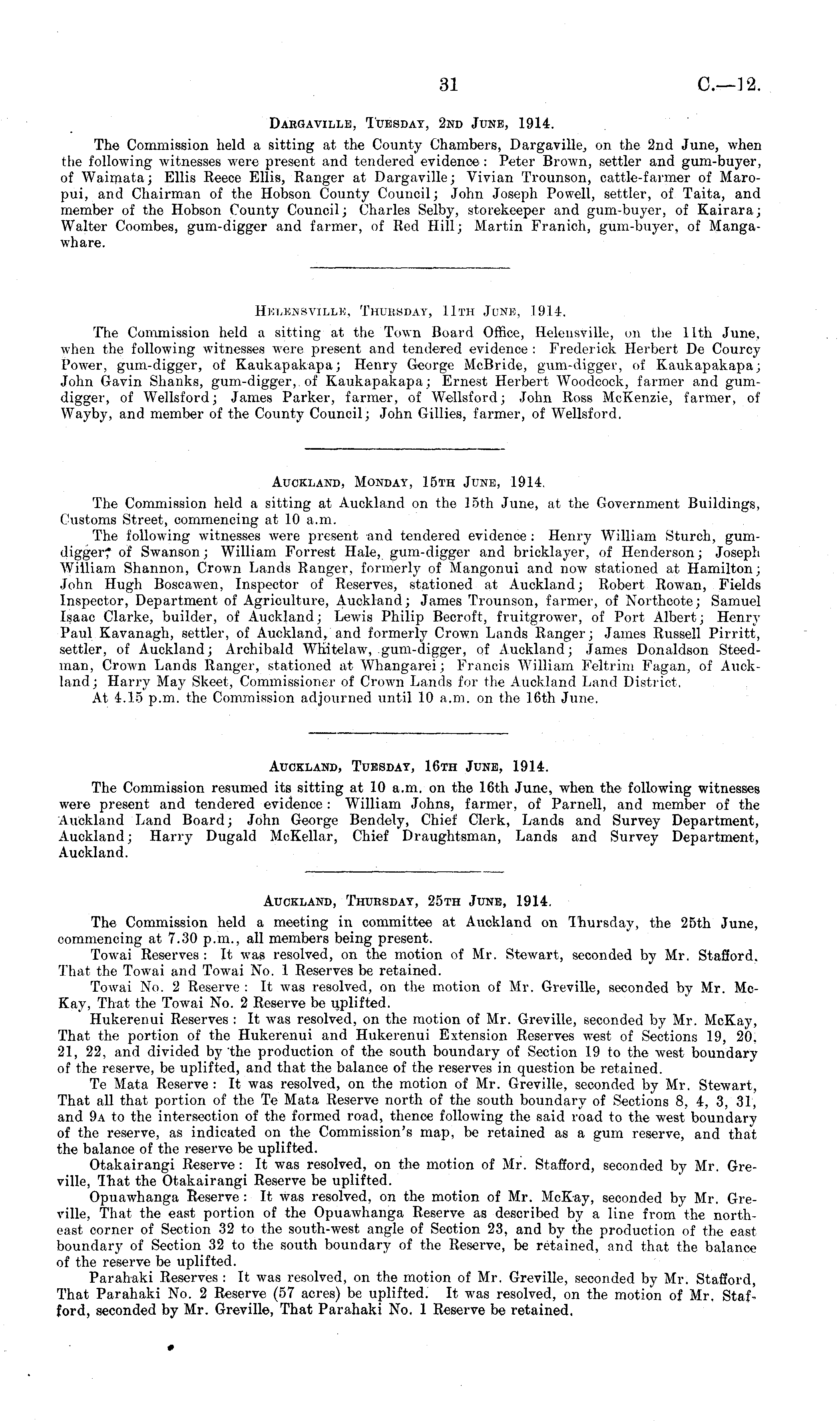 Helensville, Thursday, 11th June, 1914. The Commission held a sitting at the Town Board Office, Helensville, on the 11th June, when the following witnesses were present and tendered evidence : Frederick Herbert De Courcy lower, gum-digger, of Kaukapakapa; Henry George Mcßride, gum-digger, of Kaukapakapa; John Gavin Shanks, gum-digger, of Kaukapakapa; Ernest Herbert Woodcock, farmer and gumdigger, of Wellsford; James Parker, farmer, of Wellsford; John Ross McKenzie, farmer, of Wayby, and member of the County Council; John Gillies, farmer, of Wellsford. Auckland, Monday, 15th June, 1914. The Commission held a sitting at Auckland on the loth June, at the Government Buildings, Customs Street, commencing at 10 a.m. The following witnesses were present and tendered evidence : Henry William Sturch, gumdigger; of Swanson; William Forrest Hale, gum-digger and bricklayer, of Henderson; Joseph William Shannon, Crown Lands Ranger, formerly of Mangonui and now stationed at Hamilton; John Hugh Boscawen, Inspector of Reserves, stationed at Auckland; Robert Rowan, Fields Inspector, Department of Agriculture, Auckland; James Trounson, farmer, of Northcote; Samuel Isaac Clarke, builder, of Auckland; Lewis Philip Becroft, fruitgrower, of Port Albert; Henry Paul Kavanagh, settler, of Auckland, and formerly Crown Lands Ranger; James Russell Pirritt, settler, of Auckland; Archibald Whitelaw, gum-digger, of Auckland; James Donaldson Steedman, Crown Lands Ranger, stationed at Whangarei; Francis William Feltrim Fagan, of Auckland; Harry May Skeet, Commissioner of Crown Lands for the Auckland Land District. At 4.15 p.m. the Commission adjourned until 10 a.m. on the 16th June. Auckland, Tuesday, 16th June, 1914. The Commission resumed its sitting at 10 a.m. on the 16th June, when the following witnesses were present and tendered evidence : William Johns, farmer, of Parnell, and member of the Auckland Land Board; John George Bendely, Chief Clerk, Lands and Survey Department, Auckland; Harry Dugald McKellar, Chief Draughtsman, Lands and Survey Department, Auckland. Auckland, Thursday, 25th June, 1914, The Commission held a meeting in committee at Auckland on Thursday, the 25th June, commencing at 7.30 p.m., all members being present. Towai Reserves : It was resolved, on the motion of Mr. Stewart, seconded by Mr. Stafford. That the Towai and Towai No. 1 Reserves be retained. Towai No. 2 Reserve : It was resolved, on the motion of Mr. Greville, seconded by Mr. McKay, That the Towai No. 2 Reserve be uplifted. Hukerenui Reserves : It was resolved, on the motion of Mr. Greville, seconded by Mr. McKay, That the portion of the Hukerenui and Hukerenui Extension Reserves west of Sections 19, 20. 21, 22, and divided by the production of the south boundary of Section 19 to the west boundary of the reserve, be uplifted, and that the balance of the reserves in question be retained. Te Mata Reserve : It was resolved, on the motion of Mr. Greville, seconded by Mr. Stewart, That all that portion of the Te Mata Reserve north of the south boundary of Sections 8, 4, 3, 31, and 9a to the intersection of the formed road, thence following the said road to the west boundary of the reserve, as indicated on the Commission's map, be retained as a gum reserve, and that the balance of the reserve be uplifted. Otakairangi Reserve : It was resolved, on the motion of Mr. Stafford, seconded by Mr. Greville, That the Otakairangi Reserve be uplifted. Opuawhanga Reserve : It was resolved, on the motion of Mr. McKay, seconded by Mr. Greville, That the east portion of the Opuawhanga Reserve as described by a line from the northeast corner of Section 32 to the south-west angle of Section 23, and by the production of the east boundary of Section 32 to the south boundary of the Reserve, be retained, and that the balance of the reserve be uplifted. Parahaki Reserves : It was resolved, on the motion of Mr. Greville, seconded by Mr. Stafford, That Parahaki No. 2 Reserve (57 acres) be uplifted. It was resolved, on the motion of Mr. Stafford, seconded by Mr. Greville, That Parahaki No. 1 Reserve be retained.