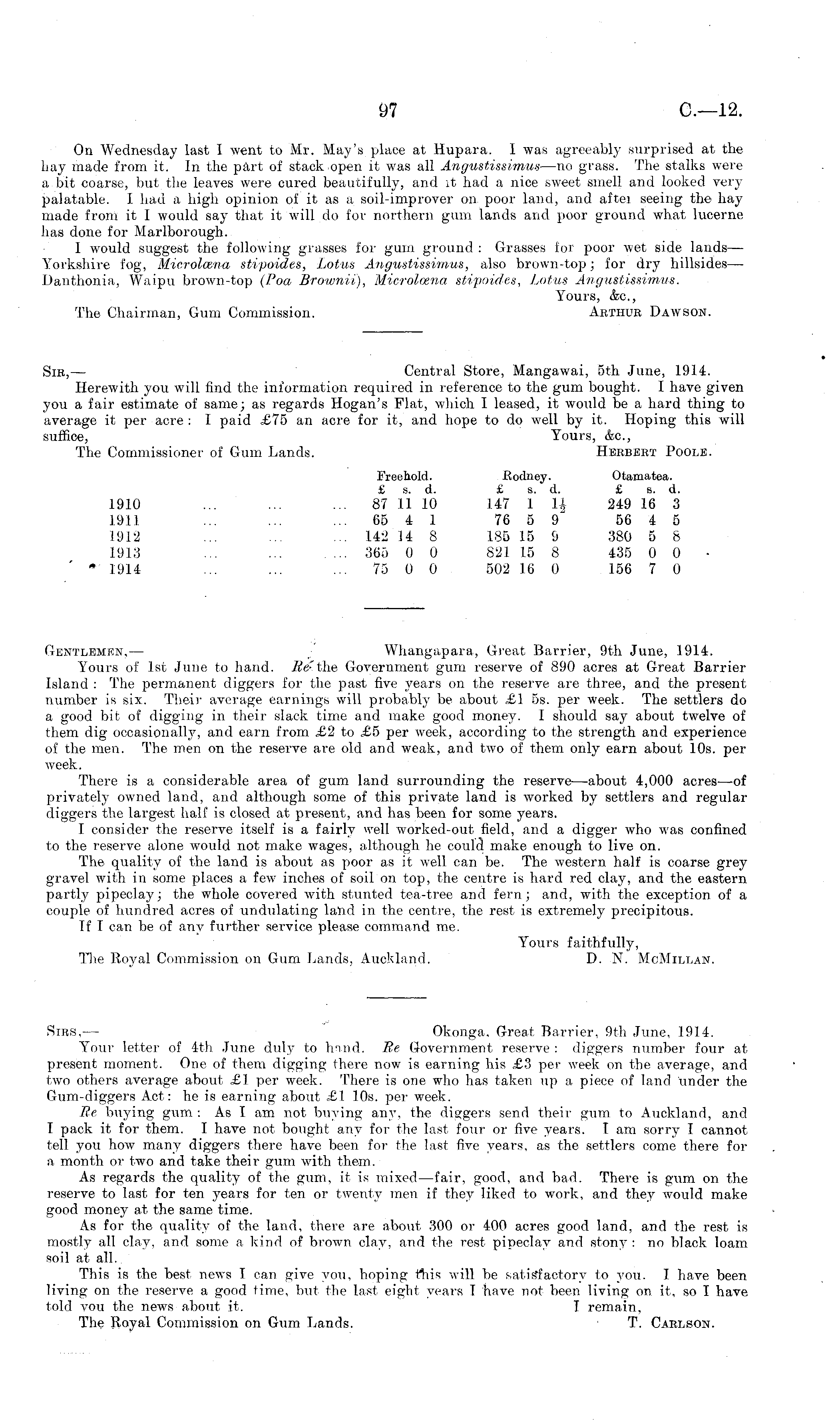 On Wednesday last I went to Mr. May's place at Hupara. I was agreeably surprised at the hay- made from it. In the part of stack open it was all Angustissimus —no grass. The stalks were a bit coarse, but the leaves were cured beautifully, and it had a nice sweet smell and looked verypalatable. I had a high opinion of it as a soil-improver on poor land, and aftet seeing the hay made from it 1 would say that it will do for northern gum lands and poor ground what lucerne has done for Marlborough. I would suggest the following grasses for gum ground : Grasses for poor wet side lands — Yorkshire fog, Microlcena stipoides, Lotus Angustissimus, also brown-top; for dry hillsides— Danthonia, Waipu brown-top (Poa Brownii), Microlcena stipoides, Lotus Angustissimus. Yours, &c, The Chairman, Gum Commission. Arthur Dawson. Sir, — Central Store, Mangawai, sth June, 1914. Herewith you will find the information required in reference to the gum bought. I have given you a fair estimate of same; as regards Hogan's Flat, which I leased, it would be a hard thing to average it per acre : I paid £75 an acre for it, and hope to do well by it. Hoping this will suffice, Yours, &c, The Commissioner of Gum Lands. Herbert Poole. Freehold. Rodney. Otamatea. £ s. d. £ s. d. £ s. d. 1910 ... ... ... 87 11 10 147 1 H 249 16 3 1911 ... ... ... 65 4 1 76 5 9" 56 4 5 1912 ... ... ... 142 14 8 185 15 9 380 5 8 1913 ... 365 0 0 821 15 8 435 0 0 .1914 ... ... ... 75 0 0 502 16 0 156 7 0 Gentlemen, — Whangapara, Great Barrier, 9th June, 1914. Yours of Ist June to hand. Re-the Government gum reserve of 890 acres at Great BarrierIsland : The permanent diggers for the past five years on the reserve are three, and the present number is six. Their average earnings will probably be about £1 ss. per week. The settlers do a good bit of digging in their slack time and make good money. I should say about twelve of them dig occasionally, and earn from £2 to £5 per week, according to the strength and experience of the men. The men on the reserve are old and weak, and two of them only earn about 10s. per week. There is a considerable area of gum land surrounding the reserve—about 4,000 acres —of privately owned land, and although some of this private land is worked by settlers and regular diggers the largest half is closed at present, and has been for some years. I consider the reserve itself is a fairly well worked-out field, and a digger who was confined to the reserve alone would not make wages, although he could make enough to live on. The quality of the land is about as poor as it w-ell can be. The western half is coarse grey gravel with in some places a few inches of soil on top, the centre is hard red clay, and the eastern partly pipeclay; the whole covered with stunted tea-tree and fern; and, with the exception of a couple of hundred acres of undulating land in the centre, the rest is extremely precipitous. If I can be of any further service please command me. Yours faithfully, The Royal Commission on Gum Lands, Auckland. D. N. McMillan. Sirs, — Okonga. Great Barrier, 9th June, 1914. Your letter of 4th June duly to hand. Re Government reserve : diggers number four at present moment. One of them digging there now is earning his £3 per week on the average, and two others average about £1 per week. There is one who has taken up a piece of land under the Gum-diggers Act: he is earning about £1 10s. per week. Re buying gum : As I am not buying any, the diggers send their gum to Auckland, and I pack it for them. I have not bought any for the last four or five years. lam sorry I cannot tell you how many diggers there have been for the last five years, as the settlers come there for a month or two and take their gum with them. As regards the quality of the gum, it is mixed —fair, good, and bad. There is gum on the reserve to last for ten years for ten or twenty men if they liked to work, and they would make good money at the same time. As for the quality of the land, there are about 300 or 400 acres good land, and the rest is mostly all clay, and some a kind of brown clay, and the rest pipeclay and stony : no black loam soil at all. This is the best news I can give you, hoping this will be satisfactory to you. I have been living on the reserve a good time, but the last eight years I have not been living on it, so I have told you the news about it. T remain, The Royal Commission on Gum Lands. T. Carlson.
