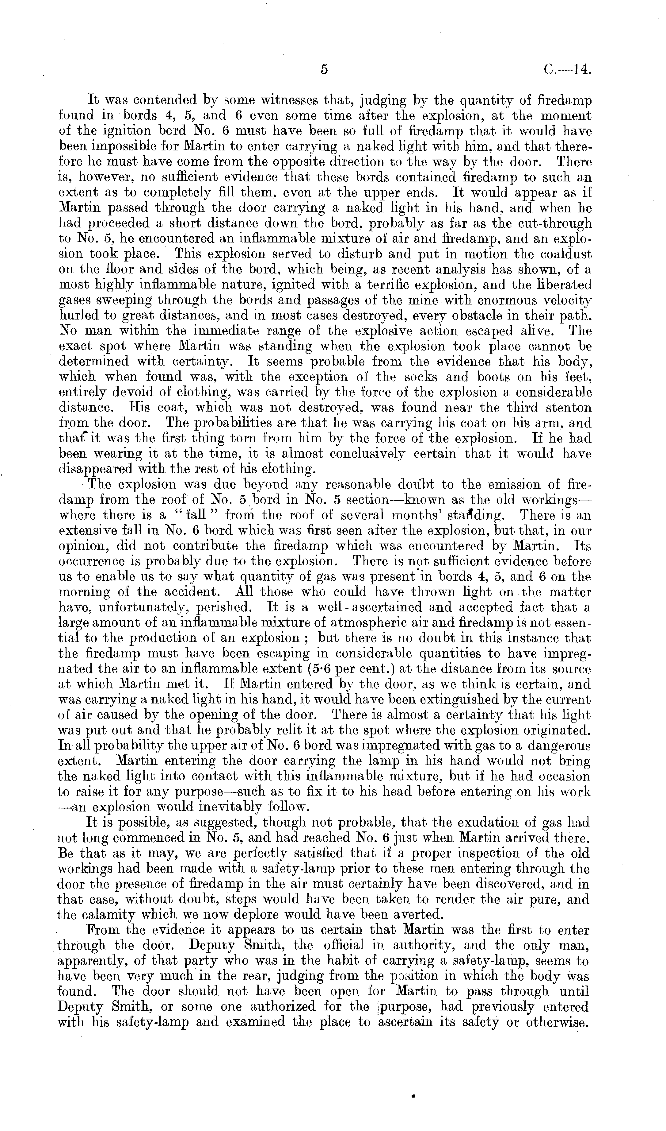 It was contended by some witnesses that, judging by the quantity of firedamp found in bords 4, 5, and 6 even some time after the explosion, at the moment of the ignition bord No. 6 must have been so full of firedamp that it would have been impossible for Martin to enter carrying a naked light with him, and that therefore he must have come from the opposite direction to the way by the door. There is, however, no sufficient evidence that these bords contained firedamp to such an extent as to completely fill them, even at the upper ends. It would appear as if Martin passed through the door carrying a naked light in his hand, and when he had proceeded a short distance down the bord, probably as far as the cut-through to No. 5, he encountered an inflammable mixture of air and firedamp, and an explosion took place. This explosion served to disturb and put in motion the coaldust on the floor and sides of the bord, which being, as recent analysis has shown, of a most highly inflammable nature, ignited with a terrific explosion, and the liberated gases sweeping through the bords and passages of the mine with enormous velocity hurled to great distances, and in most cases destroyed, every obstacle in their path. No man within the immediate range of the explosive action escaped alive. The exact spot where Martin was standing when the explosion took place cannot be determined with certainty. It seems probable from the evidence that his body, which when found was, with the exception of the socks and boots on his feet, entirely devoid of clothing, was carried by the force of the explosion a considerable distance. His coat, which was not destroyed, was found near the third stenton from the door. The probabilities are that he was carrying his coat on his arm, and that'll was the first thing torn from him by the force of the explosion. If he had been wearing it at the time, it is almost conclusively certain that it would have disappeared with the rest of his clothing. The explosion was due beyond any reasonable doubt to the emission of firedamp from the roof'of No. 5 bord in No. 5 section—known as the old workings — where there is a " fall " from the roof of several months' standing. There is an extensive fall in No. 6 bord which was first seen after the explosion, but that, in our opinion, did not contribute the firedamp which was encountered by Martin. Its occurrence is probably due to the explosion. There is not sufficient evidence before us to enable us to say what quantity of gas was present in bords 4, 5, and 6 on the morning of the accident. All those who could have thrown light on the matter have, unfortunately, perished. It is a well - ascertained and accepted fact that a large amount of an inflammable mixture of atmospheric air and firedamp is not essential to the production of an explosion ; but there is no doubt in this instance that the firedamp must have been escaping in considerable quantities to have impregnated the air to an inflammable extent (5-6 per cent.) at the distance from its source at which Martin met it. If Martin entered by the door, as we think is certain, and was carrying a naked light in his hand, it would have been extinguished by the current of air caused by the opening of the door. There is almost a certainty that his light was put out and that he probably relit it at the spot where the explosion originated. In all probability the upper air of No. 6 bord was impregnated with gas to a dangerous extent. Martin entering the door carrying the lamp in his hand would not bring the naked light into contact with this inflammable mixture, but if he had occasion to raise it for any purpose —such as to fix it to his head before entering on his work —an explosion would inevitably follow. It is possible, as suggested, though not probable, that the exudation of gas had not long commenced in No. 5, and had reached No. 6 just when Martin arrived there. Be that as it may, we are perfectly satisfied that if a proper inspection, of the old workings had been made with a safety-lamp prior to these men entering through the door the presence of firedamp in the air must certainly have been discovered, and in that case, without doubt, steps would have been taken, to render the air pure, and the calamity which we now deplore would have been averted. From the evidence it appears to us certain that Martin was the first to enter through the door. Deputy Smith, the official in authority, and the only man, apparently, of that party who was in the habit of carrying a safety-lamp, seems to have been very much in the rear, judging from the position, in which the body was found. The door should not have been open for Martin to pass through until Deputy Smith, or some one authorized for the [purpose, had previously entered with his safety-lamp and examined the place to ascertain its safety or otherwise.