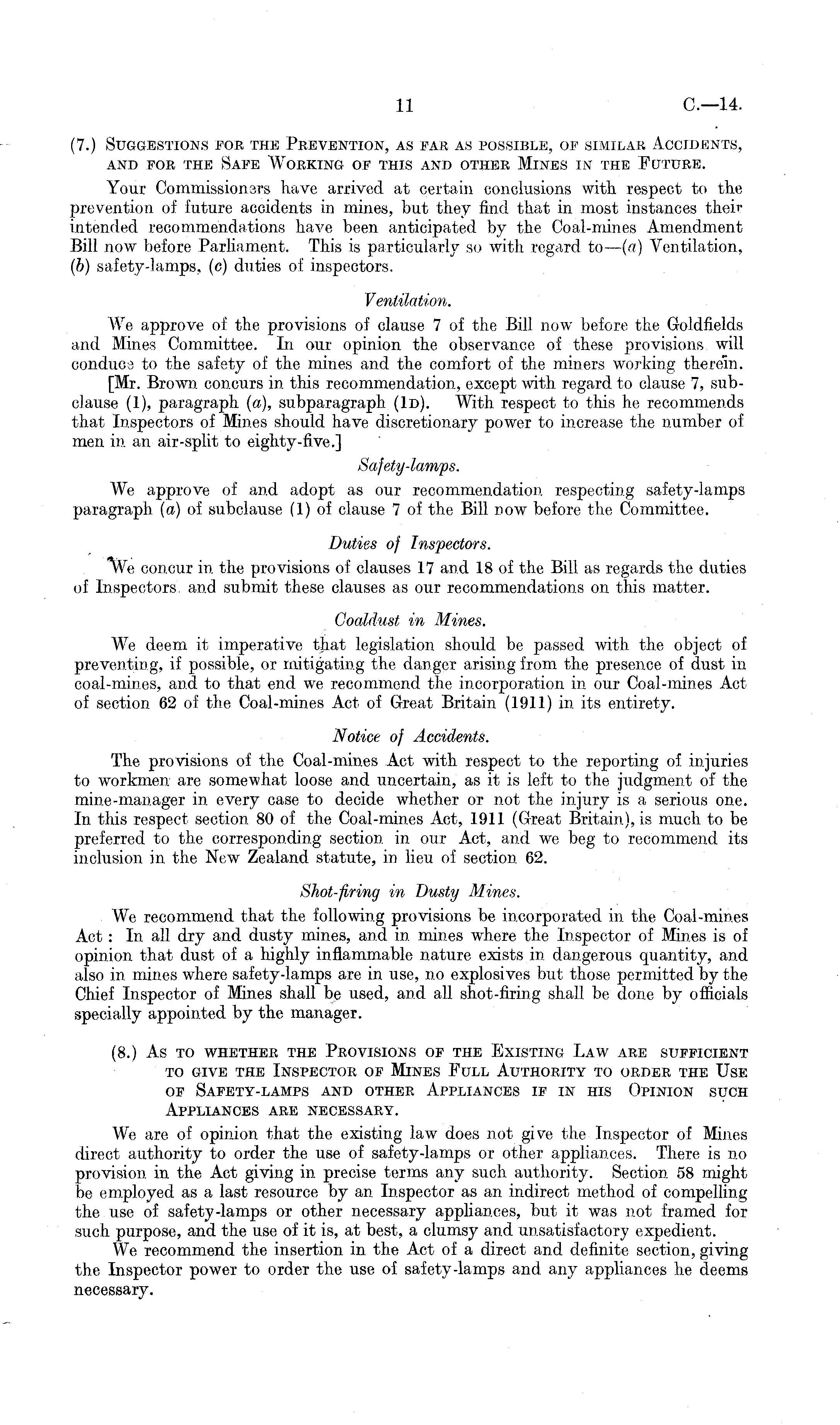(7.) Suggestions for the Prevention, as far as possible, op similar Accidents, and for the safe working of this and other mlnes in the future. Your Commission3rs have arrived at certain conclusions with respect to the prevention of future accidents in mines, but they find that in most instances their intended recommendations have been anticipated by the Coal-mines Amendment Bill now before Parliament. This is particularly so with regard to —(«) Ventilation, (b) safety-lamps, (c) duties of inspectors. Ventilation. We approve of the provisions of clause 7 of the Bill now before the Goldfields and Mines Committee. In our opinion the observance of these provisions will conduce to the safety of the mines and the comfort of the miners working therein. [Mr. Brown concurs in this recommendation, except with regard to clause 7, subclause (1), paragraph (a), subparagraph (Id). With respect to this he recommends that Inspectors of Mines should have discretionary power to increase the number of men in an air-split to eighty-five.] Safety-lamps. We approve of and adopt as our recommendation respecting safety-lamps paragraph (a) of subclause (1) of clause 7 of the Bill now before the Committee. Duties of Inspectors. We concur in the provisions of clauses 17 and 18 of the Bill as regards the duties of Inspectors, and submit these clauses as our recommendations on this matter. Coaldust in Mines. We deem it imperative that legislation should be passed with the object of preventing, if possible, or mitigating the danger arising from the presence of dust in coal-mines, and to that end we recommend the incorporation in our Coal-mines Act of section 62 of the Coal-mines Act of Great Britain (1911) in its entirety. Notice of Accidents. The provisions of the Coal-mines Act with respect to the reporting of injuries to workmen are somewhat loose and uncertain, as it is left to the judgment of the mine-manager in every case to decide whether or not the injury is a serious one. In this respect section 80 of the Coal-mines Act, 1911 (Great Britain), is much to be preferred to the corresponding section in our Act, and we beg to recommend its inclusion in the New Zealand statute, in lieu of section 62. Shot-firing in Dusty Mines. We recommend that the following provisions be incorporated in the Coal-mines Act : In all dry and dusty mines, and in mines where the Inspector of Mines is of opinion that dust of a highly inflammable nature exists in dangerous quantity, and also in mines where safety-lamps are in use, no explosives but those permitted by the Chief Inspector of Mines shall be used, and all shot-firing shall be done by officials specially appointed by the manager. (8.) as to whether the provisions of the existing law are sufficient to give the inspector of mlnes full authority to order the use of Safety-lamps and other Appliances if in his Opinion such Appliances are necessary. We are of opinion that the existing law does not give the Inspector of Mines direct authority to order the use of safety-lamps or other appliances. There is no provision in the Act giving in precise terms any such authority. Section 58 might be employed as a last resource by an Inspector as an indirect method of compelling the use of safety-lamps or other necessary appliances, but it was not framed for such purpose, and the use of it is, at best, a clumsy and unsatisfactory expedient. We recommend the insertion in the Act of a direct and definite section, giving the Inspector power to order the use of safety-lamps and any appliances he deems necessary.