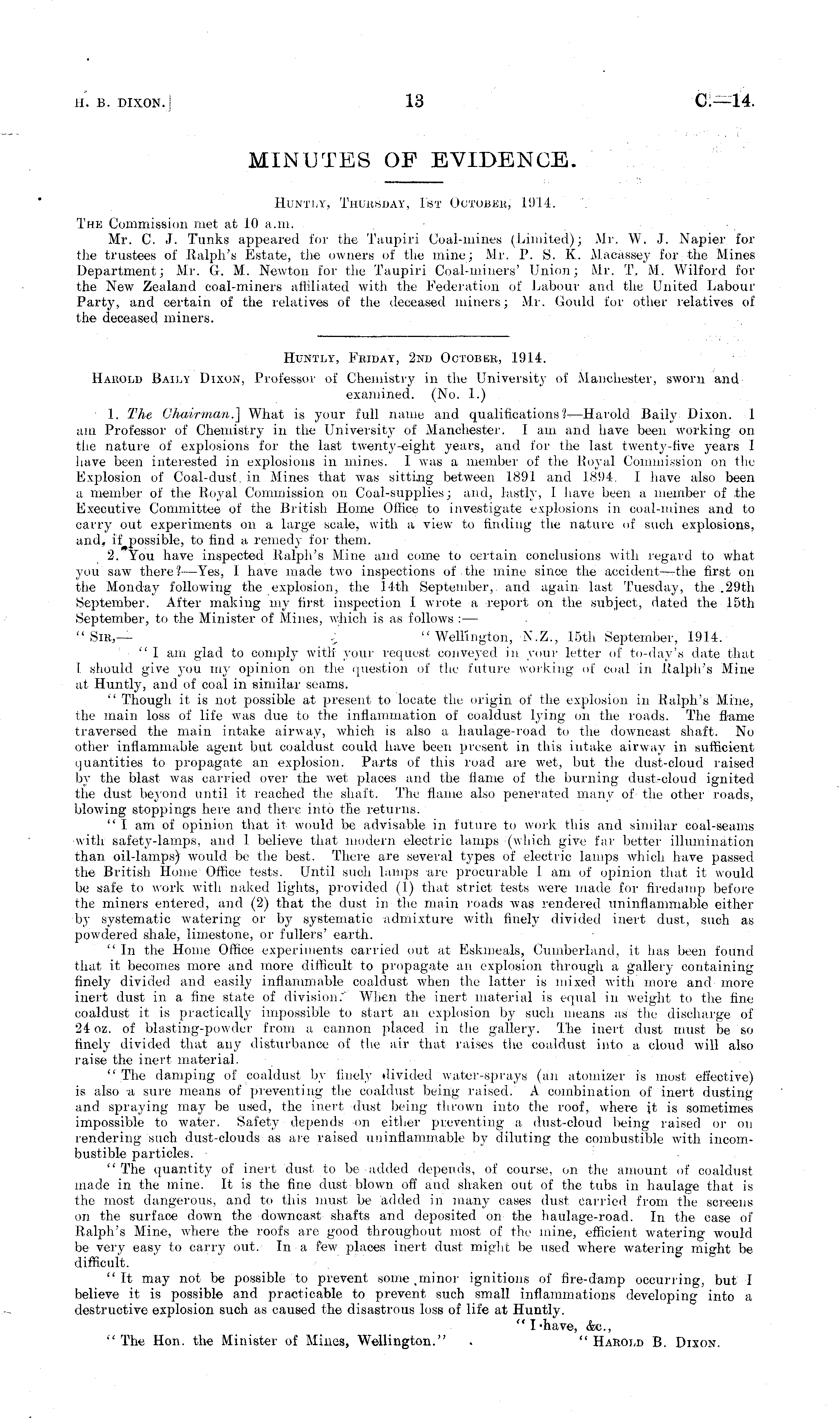 MINUTES OF EVIDENCE. Huntly, Thuiibday, I'bt Ootobkh, 1914. The Commission met at 10 a.m. Mr. C. J. Tunks appeared for the Taupiri Coal-mines (Limited); Mr. W. J. Napier for the trustees of Ralph's Estate, the owners of the mine; Mr. P. S. K. Macassey for the Mines Department; Mr. G. M. Newton for the Taupiri Coal-miners' Union; Mr. T. M. Wilford for the New Zealand coal-miners affiliated with the Federation of Labour and the United Labour Party, and certain of the relatives of the deceased miners; Mr. Gould for other relatives of the deceased miners.