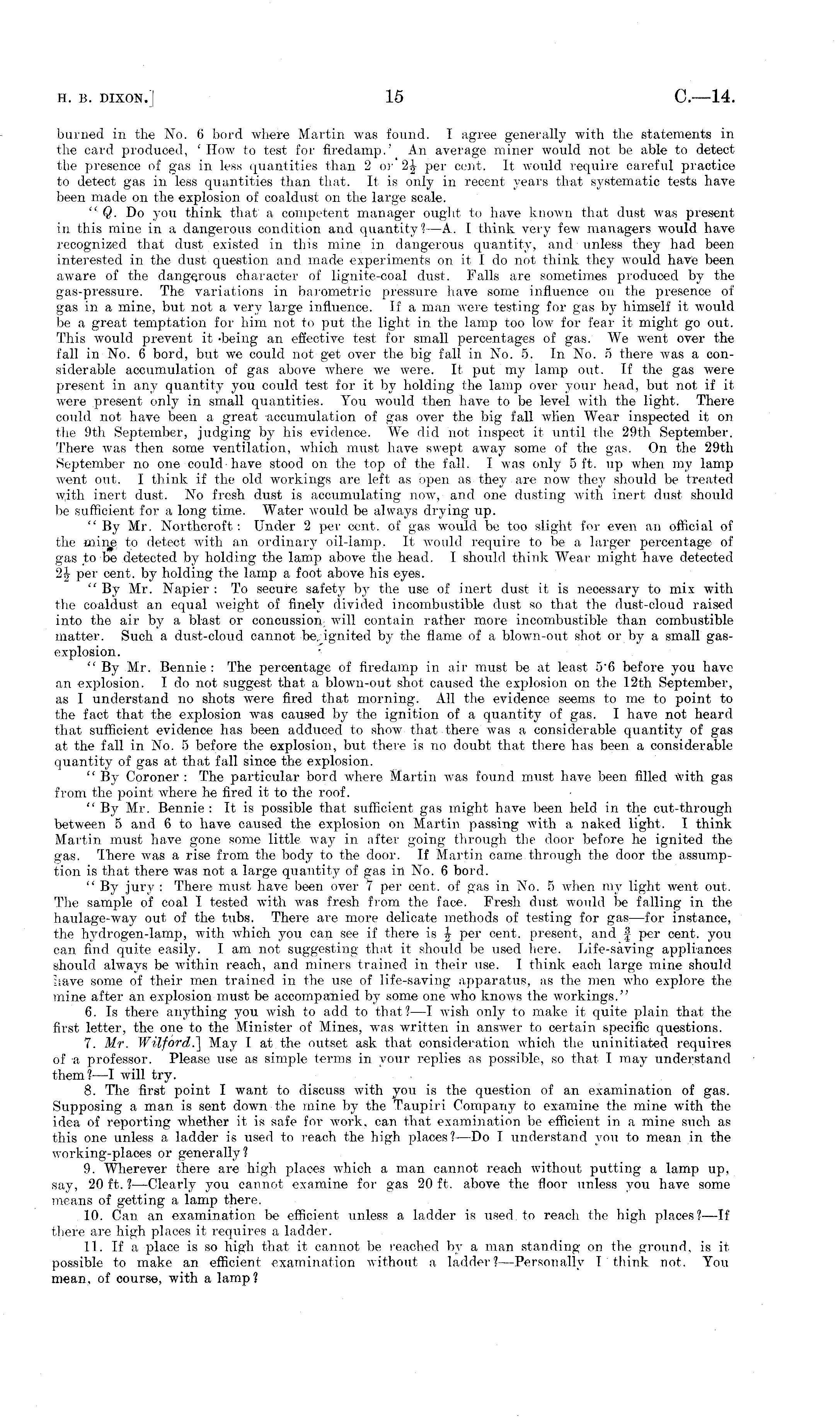 burned in the No. 6 bord where Martin was found. I agree generally with the statements in the card produced, ' How to test for firedamp.' An average miner would not be able to detect the presence of gas in less quantities than 2 or per cent. It would require careful practice to detect gas in less quantities than that. It is only in recent years that systematic tests have been made on the explosion of coaldust on the large scale, " Q. Do you think that a competent manager ought to have known that dust was present in this mine in a dangerous condition and quantity? —A. I think very few managers would have recognized that dust existed in this mine in dangerous quantity, and unless the}? had been interested in the dust question and made experiments on it I do not think they would have been aware of the dange,rous character of lignite-coal dust. Falls are sometimes produced by the gas-pressure. The variations in barometric pressure have some influence on the presence of gas in a mine, but not a very large influence. If a man were testing for gas by himself it would be a great temptation for him not to put the light in the lamp too low for fear it might go out. This would prevent it -being an. effective test for small percentages of gas. We went over the fall in No. 6 bord, but we could not get over the big fall in No. 5. In No. 5 there was a considerable accumulation of gas above where we were. It put my lamp out. If the gas were present in any quantity you could test for it by holding the lamp over your head, but not if it were present only in small quantities. You would then have to be level with the light. There could not have been a great accumulation of gas over the big fall when Wear inspected it on the 9th September, judging by his evidence. We did not inspect it until the 29th September. There was then some ventilation, which must have swept away some of the gas. On the 29th September no one could have stood on the top of the fall. I was only oft. up when my lamp went out. I think if the old workings are left as open as they are now they should be treated with inert dust. No fresh dust is accumulating now, and one dusting with inert dust should be sufficient for a long time. Water would be always drying up. " By Mr. Northcroft : Under 2 per cent, of gas would be too slight for even an official of the mine to detect with an ordinary oil-lamp. It would require to be a larger percentage of gas to be detected by holding the lamp above the head. I should think Wear might have detected 2i per cent, by holding the lamp a foot above his eyes. " By Mr. Napier : To secure safety by the use of inert dust it is necessary to mix with the coaldust an equal weight of finely divided incombustible dust so that the dust-cloud raised into the air by a blast or concussion will contain rather more incombustible than combustible matter. Such a dust-cloud cannot be ignited by the flame of a blown-out shot or by a small gasexplosion. " By Mr. Bennie : The percentage of firedamp in air must be at least 56 before you have an explosion. Ido not suggest that a blown-out shot caused the explosion on the 12th September, as I understand no shots were fired that morning. All the evidence seems to me to point to the fact that the explosion was caused by the ignition of a quantity of gas. I have not heard that sufficient evidence has been adduced to show that there was a considerable quantity of gas at the fall in No. 5 before the explosion, but there is no doubt that there has been a considerable quantity of gas at that fall since the explosion. " By Coroner : The particular bord where Martin was found must have been filled with gas from the point where he fired it to the roof. " By Mr. Bennie : It is possible that sufficient gas might have been held in the cut-through between 5 and 6 to have caused the explosion on Martin passing with a naked light. I think Martin must have gone some little way in after going through the door before he ignited the gas. There was a rise from the body to the door. If Martin came through the door the assumption is that there was not a large quantity of gas in No. 6 bord. " By jury : There must have been over 7 per cent, of gas in No. 5 when my light went out. The sample of coal I tested with was fresh from the face. Fresh dust would be falling in the haulage-way out of the tubs. There are more delicate methods of testing for gas —for instance, the hydrogen-lamp, with which you can see if there is A per cent, present, and | per cent, you can find quite easily. I am not suggesting that it should be used here. Life-saving appliances should always be within reach, and miners trained in their use. I think each large mine should have some of their men trained in the use of life-saving apparatus, as the men who explore the mine after an explosion must be accompanied by some one who knows the workings." 6. Is there anything you wish to add to that?—l wish only to make it quite plain that the first letter, the one to the Minister of Mines, was written in answer to certain specific questions. 7. Mr. Wilford.~\ May I at the outset ask that consideration which the uninitiated requires of a professor. Please use as simple terms in your replies as possible, so that I may understand them? — I will try. 8. The first point I want to discuss with you is the question of an examination of gas. Supposing a man is sent down the mine by the Taupiri Company to examine the mine with the idea of reporting whether it is safe for work, can that examination be efficient in a mine such as this one unless a ladder is used to reach the high places? —Do I understand you to mean in the working-places or generally ? 9. Wherever there are high places which a man cannot reach without putting a lamp up, say, 20 ft. ? —Clearly you cannot examine for gas 20 ft. above the floor unless you have some means of getting a lamp there. 10. Can an examination be efficient unless a ladder is used, to reach the high places?