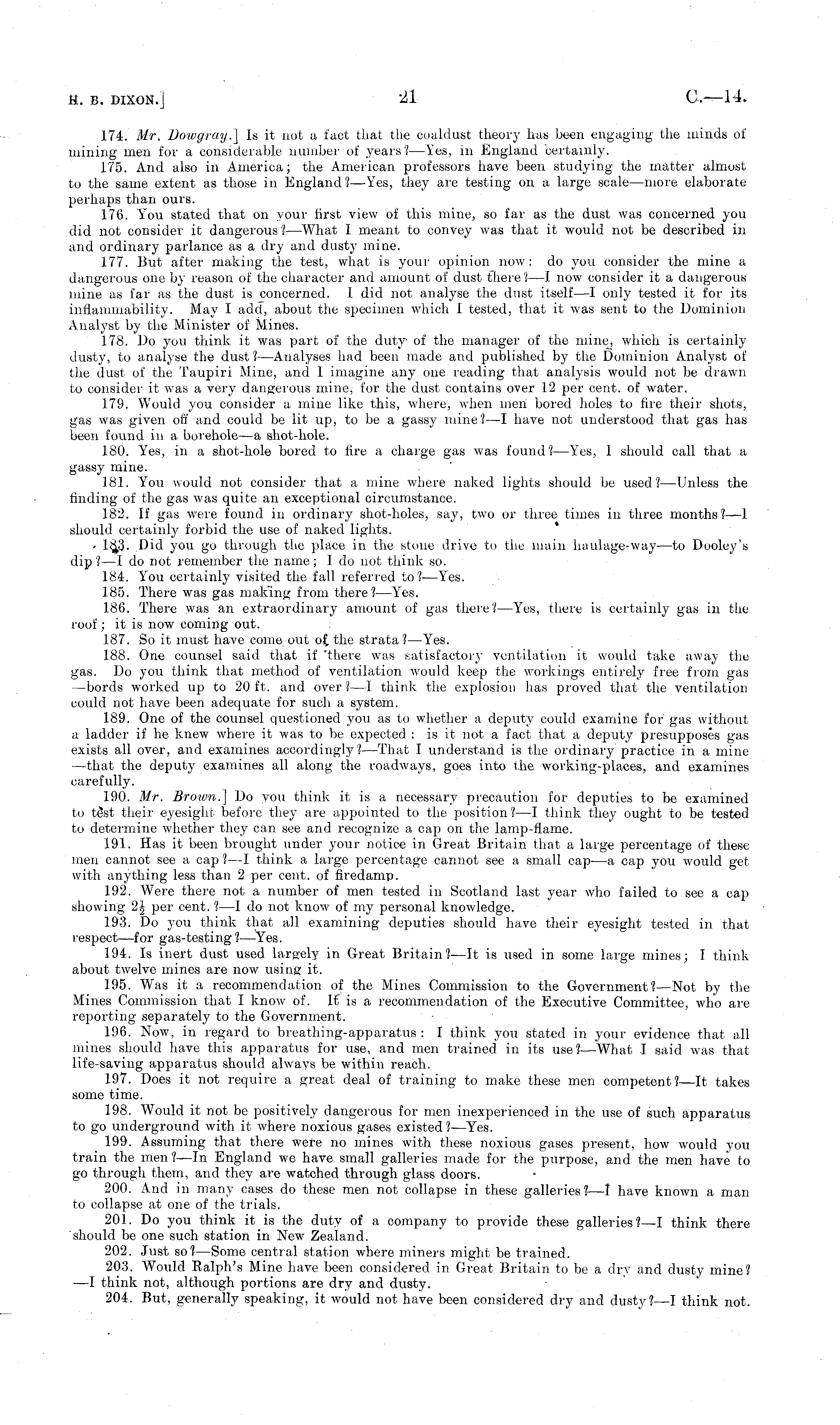 174. Mr. Dowgray.] Is it not a fact that the coaldust theory has been engaging the minds of mining men for a considerable number of years?— Yes, in England certainly, 175. And also in America; the American professors have been studying the matter almost to the same extent as those in England I —Yes, they are testing on a large scale—more elaborate perhaps than ours. 176. You stated that on your first view of this mine, so far as the dust was concerned you did not consider it dangerous ?—What I meant to convey was that it would not be described in and ordinary parlance as a dry and dusty mine. 177. But after making the test, what is your opinion now: do you consider the mine a dangerous one by reason of the character and amount of dust there'!—l now consider it a dangerous mine as far as the dust is concerned. I did not analyse the dust itself—l only tested it for its inflammability. May I add, about the specimen which 1 tested, that it was sent to the Dominion Analyst by the Minister of Mines. 178. Do you think it was part of the duty of the manager of the minej which is certainly dusty, to analyse the dust? —Analyses had been made and published by the Dominion Analyst of the dust of the Taupiri Mine, and 1 imagine any one reading that analysis would not be drawn to consider it was a very dangerous mine, for the dust contains over 12 per cent, of water. 179. Would you consider a mine like this, where, when men bored holes to fire their shots, gas was given off and could be lit up, to be a gassy mine?—l have not understood that gas has been found in a borehole —a shot-hole. 180. Yes, in a shot-hole bored to hre a charge gas was found?— Yes, 1 should call that a gassy mine. 181. You would not consider that a mine where naked lights should be used? —Unless the finding of the gas was quite an exceptional circumstance. 182. If gas were found in ordinary shot-holes, say, two or three times in three months?—l should certainly forbid the use of naked lights. - 18J3. Did you go through the place in the stone drive to the main haulage-way —to Dooley's dip ? —I do not remember the name ; I do not think so. 184. You certainly visited the fall referred to?— Yes. 185. There was gas making from there?— Yes. 186. There was an extraordinary amount of gas there?— Yes. there is certainly gas in the roof; it is now coming out. 187. So it must have come out of, the strata ?—Yes. 188. One counsel said that if 'there was satisfactory ventilation it would take away the gas. Do you think that method of ventilation would keep the workings entirely free from gas —bords worked up to 20 ft. and over ? —1 thirds; the explosion has proved that the ventilation could not have been adequate for such a system. 189. One of the counsel questioned you as to whether a deputy could examine for gas without a ladder if he knew where it was to be expected : is it not a fact that a deputy presupposes gas exists all over, and examines accordingly?— That I understand is the ordinary practice in a mine —that the deputy examines all along the roadways, goes into the working-places, and examines carefully. 190. Mr. Brown.] Do you think it is a necessary precaution for deputies to be examined to test their eyesight before they are appointed to the position?—l think they ought to be tested to determine whether they can see and recognize a cap on the lamp-flame. 191. Has it been brought under your notice in Great Britain that a large percentage of these men cannot see a cap I —l think a large percentage cannot see a small cap—a cap you would get with anything less than 2 per cent, of firedamp. 192. Were there not a number of men tested in Scotland last year who failed to see a cap showing 2J, per cent. ?—I do not know of my personal knowledge. 193. Do you think that all examining deputies should have their eyesight tested in that respect—for gas-testing ?—Yes. 194. Is inert dust used largely in Great Britain?—lt is used in some large mines; I think about twelve mines are now using it. 195. Was it a recommendation of the Mines Commission to the Government?— Not by the Mines Commission that I know of. It is a recommendation of the Executive Committee, who are reporting separately to the Government. 196. Now, in regard to breathing-apparatus : I think you stated in your evidence that all mines should have this apparatus for use, and men trained in its use?— What I said was that life-saving apparatus should always be within reach. 197. Does it not require a great deal of training to make these men competent?—lt takes some time. 198. Would it not be positively dangerous for men inexperienced in the use of such apparatus to go underground with it where noxious gases existed?— Yes. 199. Assuming that there were no mines with these noxious gases present, how would you train the men?—ln England we have small galleries made for the purpose, and the men have to go through them, and they are watched through glass doors. 200. And in many cases do these men not collapse in these galleries?—l have known a man to collapse at one of the trials. 201. Do you think it is the duty of a company to provide these galleries?—l think there should be one such station in New Zealand. 202. Just so?— Some central station where miners might be trained. 203. Would Ralph's Mine have been considered in Great Britain to be a dry and dusty mine? —I think not, although portions are dry and dusty. 204. But, generally speaking, it would not have been considered dry and dusty?—l think not.