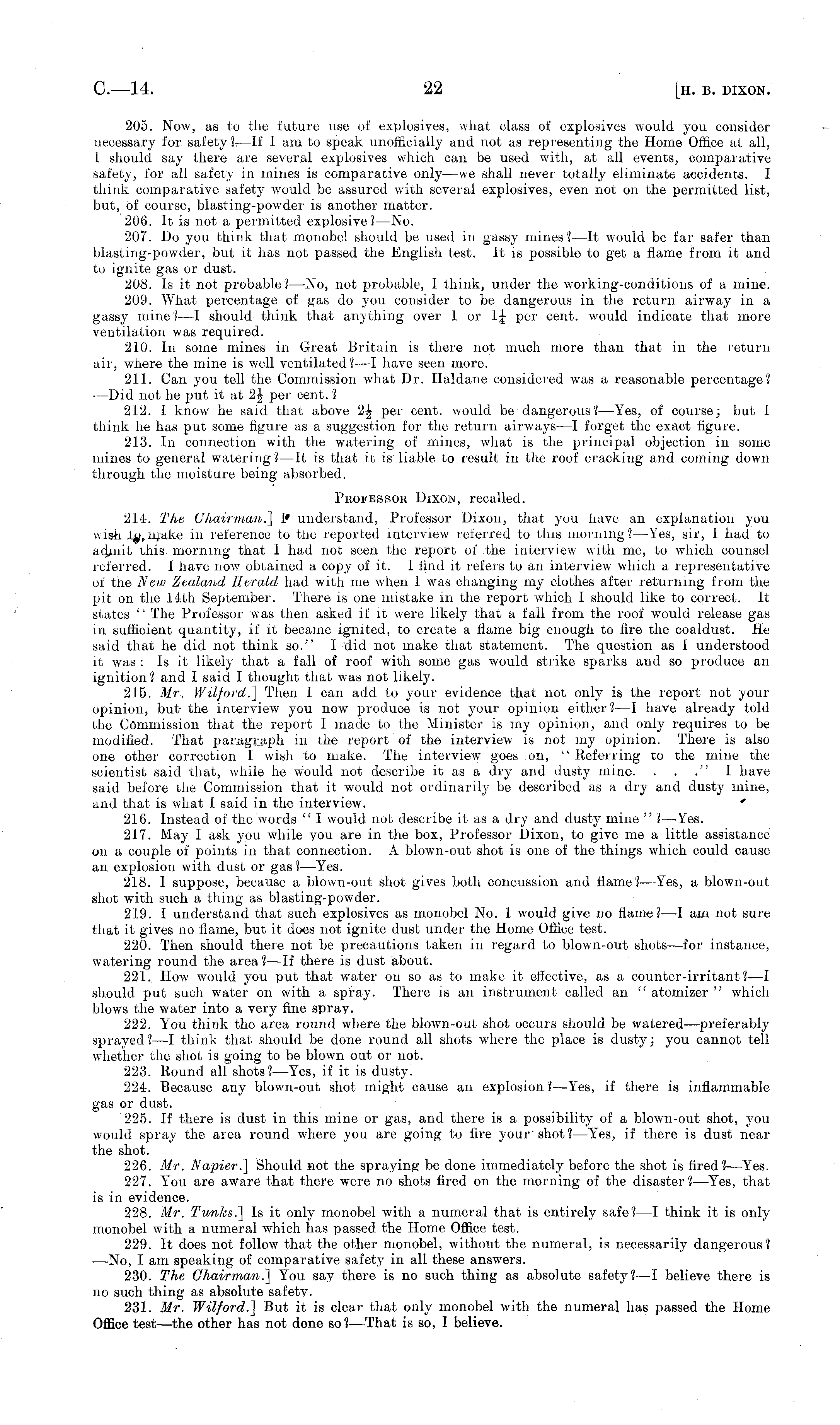 205. Now, as to the future use of explosives, wliat class of explosives would you consider necessary for safety % —lf I am to speak unofficially and not as representing the Home Office at all, I should say there are several explosives which can be used with, at all events, comparative safety, for all safety in mines is comparative only—we shall never totally eliminate accidents. I think comparative safety would be assured with several explosives, even not on the permitted list, but, of course, blasting-powder is another matter. 206. It is not a permitted explosive?— No. 207. Do you think that monobel should be used in gassy mines'/—lt would be far safer than blasting-powder, but it has not passed the English test. It is possible to get a flame from it and to ignite gas or dust. 208. Is it not probable?—No, not probable, I think, under the working-conditions of a mine. 209. What percentage of gas do you consider to be dangerous in the return airway in a gassy mine?—l should think that anything over 1 or 1£ per cent, would indicate that more ventilation was required. 210. In some mines in Great Britain is there not much more than that in the return air, where the mine is well ventilated?—l have seen more. 211. Can you tell the Commission what Dr. Haldane considered was a reasonable percentage? —Did not he put it at 2| per cent. ? 212. I know he said that above 2Jr per cent, would be dangerous?— Yes, of course; but I think he has put some figure as a suggestion for the return airways—l forget the exact figure. 213. In connection with the watering of mines, what is the principal objection in some mines to general watering ?—lt is that it is liable to result in the roof cracking and coming down through the moisture being absorbed. Professok Dixcxn, recalled. 214. The Chairman.] 1* understand, Professor Dixon, that you have an explanation you wish .ty,inake in reference to the reported interview referred to this morning? —Yes, sir, 1 had to acquit this morning that I had not seen the report of the interview with me, to which counsel referred. I have now obtained a copy of it. I find it refers to an interview which a representative of the New Zealand Herald had with me when I was changing my clothes after returning from the pit on the 14th September. There is one mistake m the report which I should like to correct. It states '' The Professor was then asked if it were likely that a fall from the roof would release gas in sufficient quantity, if it became ignited, to create a flame big enough to fire the coaldust. He said that he did not think so." 1 did not make that statement. The question as 1 understood it was : Is it likely that a fall of roof with some gas would strike sparks and so produce an ignition? and I said I thought that was not likely. 215. Mr. Wilford.] Then I can add to your evidence that not only is the report not your opinion, but- the interview you now produce is not your opinion either? —I have already told the Commission that the report 1 made to the Minister is my opinion, and only requires to be modified. That paragraph in the report of the interview is not my opinion. There is also one other correction I wish to make. The interview goes on, " Referring to the mine the scientist said that, while he would not describe it as a dry and dusty mine. . . ." 1 have said before the Commission that it would not ordinarily be described as a dry and dusty mine, and that is what 1 said in the interview. 216. Instead of the words " I would not describe it as a dry and dusty mine " I —Yes. 217. May I ask you while you are in the box, Professor Dixon, to give me a little assistance on a couple of points in that connection. A blown-out shot is one of the things which could cause an explosion with dust or gas ?—Yes. 218. I suppose, because a blown-out shot gives both concussion and flame?—-Yes, a blown-out shot with such a thing as blasting-powder. 219. I understand that such explosives as monobel No. 1 would give no flame?—l am not sure that it gives no flame, but it does not ignite dust under the Home Office test. 220. Then should there not be precautions taken in regard to blown-out shots—for instance, watering round the area ?—lf there is dust about. 221. How would you put that water on so as to make it effective, as a counter-irritant? —I should put such water on with a spray. There is an instrument called an " atomizer " which blows the water into a very fine spray. 222. You think the area round where the blown-out shot occurs should be watered—preferably sprayed?—l think that should be done round all shots where the place is dusty; you cannot tell whether the shot is going to be blown out or not. 223. Round all shots?— Yes, if it is dusty. 224. Because any blown-out shot might cause an explosion ?—Y'es, if there is inflammable gas or dust. 225. If there is dust in this mine or gas, and there is a possibility of a blown-out shot, you would spray the area round where you are going to fire your , shot? —Yes, if there is dust near the shot. 226. Mr. Napier.] Should not the spraying be done immediately before the shot is fired? —Yes. 227. You are aware that there were no shots fired on the morning of the disaster? —Yes, that is in evidence. 228. Mr. Tunks.] Is it only monobel with a numeral that is entirely safe? —I think it is only inonobel with a numeral which has passed the Home Office test. 229. It does not follow that the other monobel, without the numeral, is necessarily dangerous? —No, I am speaking of comparative safety in all these answers. 230. The Chairman.] You say there is no such thing as absolute safety?—l believe there is no such thing as absolute safety. 231. Mr. Wilford.] But it is clear that only monobel with the numeral has passed the Home Office test—the other has not done so ?—That is so, I believe.