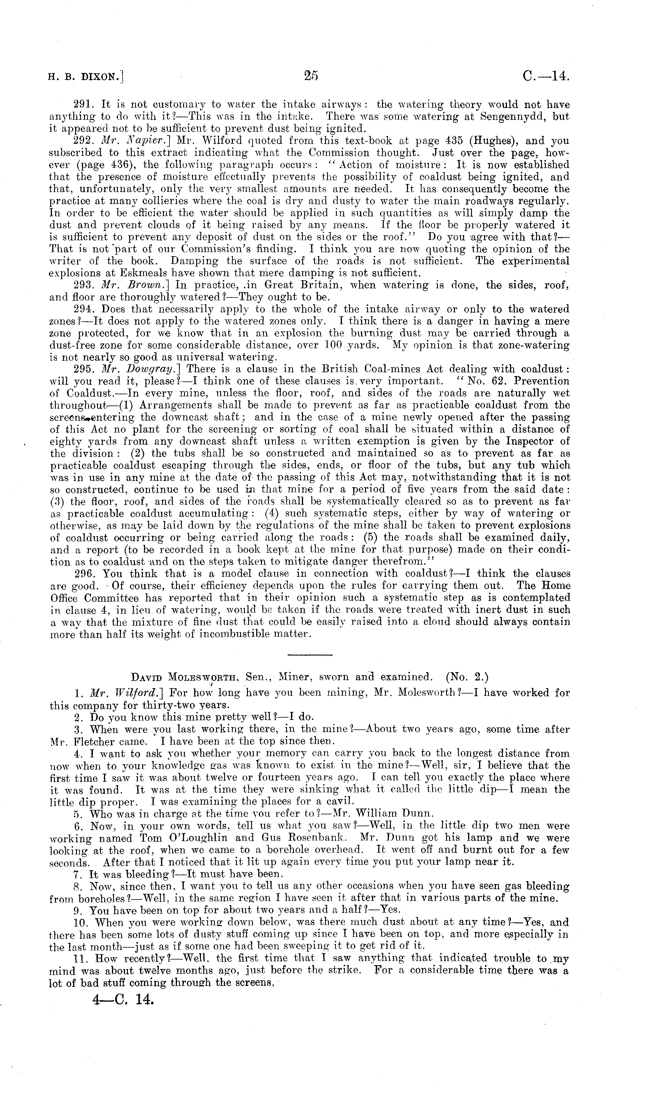 David Moleswobth, Sen., Miner, sworn and examined. (No. 2.) 1. Mr. Wilford.] For how long have you been mining, Mr. Molesworth? —I have worked for this company for thirty-two years. 2. Do you know this mine pretty well? —I do. 3. When were you last working there, in the mine?— About two years ago, some time after Mr. Fletcher came. I have been at the top since then. 4. I want to ask you whether your memory can carry you back to the longest distance from now when to your knowledge gas was known to exist in the mine?— Well, sir, I believe that the first time I saw it was about twelve or fourteen years ago. I can tell you exactly the place where it was found. It was at the time they were sinking what it called the little dip—l mean the little dip proper. I was examining the places for a cavil. 5. Who was in charge at the time you refer to?— Mr. William Dunn. 6. Now, in your own words, tell us what you saw?— Well, in the little dip two men were working named Tom O'Loughlin and Gus Rosenbank. Mr. Dunn got his lamp and we were looking at the roof, when we came to a borehole overhead. It went off and burnt out for a few seconds. After that I noticed that it lit up again every time you put your lamp near it. 7. It was bleeding?—lt must have been. 8. Now, since then, I want you to tell us any other occasions when you have seen gas bleeding from boreholes? —Well, in the same region I have seen it after that in various parts of the mine. 9. You have been on top for about two years and a half? —Yes. 10. When you were working down below, was there much dust about at any time?— Yes, and there has been some lots of dusty stuff coming up since I have been on top, and more especially in the last month —just as if some one had been sweeping it to get rid of it. 11. How recently?— Well, the first time that I saw anything that indicated trouble to my mind was about twelve months ago, just before the strike. For a considerable time there was a lot of bad stuff coming through the screens,