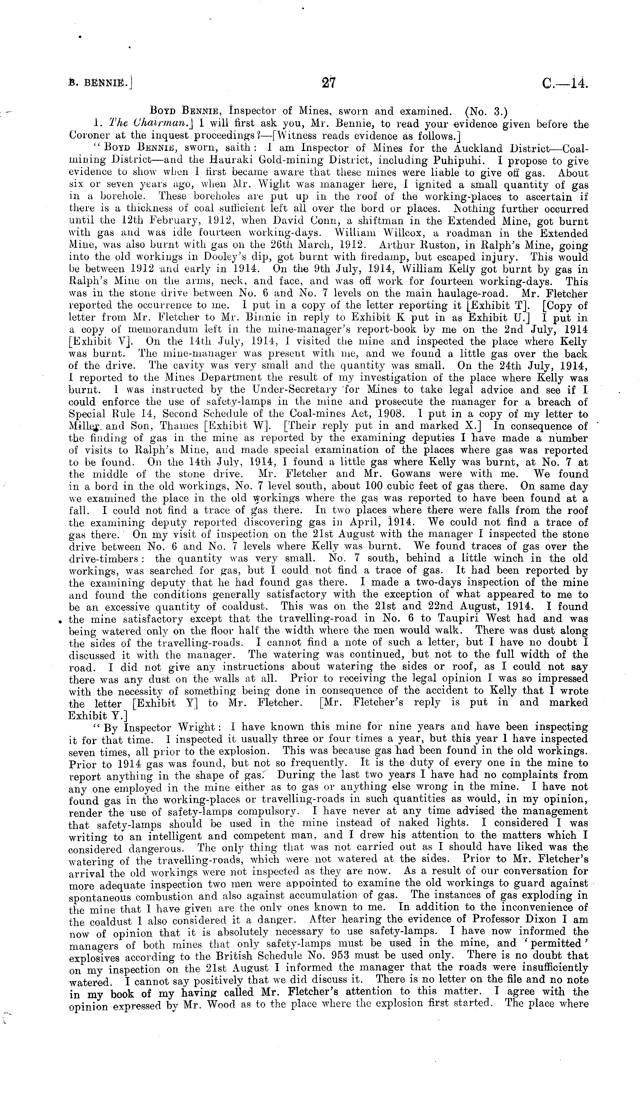 Boyd Bennie, inspector of Mines, sworn and examined. (No. 3.) I. The Chairman.] I will first ask you, Mr. Bennie, to read your evidence given before the Coroner at the inquest proceedings?—[Witness reads evidence as follows.] "Boyd Bennie, sworn, saith: I am Inspector of Mines for the Auckland District—Coalmining District—and the Hauraki Gold-mining District, including Puhipuhi. I propose to give evidence to show when I first became aware that these mines were liable to give off gas. About six or seven years ago, when Mr. Wight was manager here, I ignited a small quantity of gas in a borehole. These boreholes are put up in the roof of the working-places to ascertain if there is a thickness of coal sufficient left all over the bord or places. Nothing further occurred until the 12th February, 1912, when David Conn, a shiftman in the Extended Mine, got burnt with gas and was idle fourteen working-days. William Willcox, a roadman in the Extended Mine, was also burnt with gas on the 26th March, 1912. Arthur Ruston, in Ralph's Mine, going into the old workings in Dooley's dip, got burnt with firedamp, but escaped injury. This would be between 1912 and early in 1914. On the 9th July, 1914, William Kelly got burnt by gas in Ralph's Mine on the arms, neck, and face, and w r as off work for fourteen working-days. This was in the stone drive between No. 6 and No. 7 levels on the main haulage-road. Mr. Fletcher reported the occurrence to me. I put in a copy of the letter reporting it [Exhibit T]. [Copy of letter from Mr, Fletcher to Mr. Binnie in reply to Exhibit X put in as Exhibit U.] I put in a copy of memorandum left in the mine-manager's report-book by me on the 2nd July, 1914 [Exhibit VI. On the 14th July, 1914, I visited the mine and inspected the place where Kelly was burnt. The mine-manager was present with me, and we found a little gas over the back of the drive. The cavity was very small and the quantity was small. On the 24th July, 1914, I reported to the Mines Department the result of my investigation of the place where Kelly was burnt. 1 was instructed by the Under-Secretary for Mines to take legal advice and see if I could enforce the use of safety-lamps in the mine and prosecute the manager for a breach of Special Rule 14, Second Schedule of the Coal-mines Act, 1908. I put in a copy of my letter to Millejr and Son, Thames [Exhibit W]. [Their reply put in and marked X.] In consequence of the finding of gas in the mine as reported by the examining deputies I have made a number of visits to Ralph's Mine, and made special examination of the places where gas was reported to be found. On the 14th July, 1914, I found a little gas where Kelly was burnt, at No. 7 at the middle of the stone drive. Mr. Fletcher and Mr. Gowans were with me. We found in a bord in the old workings, No. 7 level south, about 100 cubic feet of gas there. On same day we examined the place in the old workings where the gas was reported to have been found at a fall. I could not find a trace of gas there. In two places where there were falls from the roof the examining deputy reported discovering gas in April, 1914. We could not find a trace of gas there. On my visit of inspection on the 21st August with the manager I inspected the stone drive between No. 6 and No. 7 levels where Kelly was burnt. We found traces of gas over the drive-timbers : the quantity was very small. No. 7 south, behind a little winch in the old workings, was searched for gas, but I could not find a trace of gas. It had been reported by the examining deputy that he had found gas there. I made a two-days inspection of the mine and found the conditions generally satisfactory with the exception of what appeared to me to be an excessive quantity of coaldust. This was on the 21st and 22nd August, 1914. I found the mine satisfactory except that the travelling-road in No. 6 to Taupiri West had and was being watered only on the floor half the width where the men would walk. There was dust along the sides of the travelling-roads. I cannot find a note of such a letter, but I have no doubt I discussed it with the manager. The watering was continued, but not to the full width of the road. I did not give any instructions about watering the sides or roof, as I could not say there was any dust on the walls at all. Prior to receiving the legal opinion I was so impressed with the necessity of something being done in consequence of the accident to Kelly that I wrote the letter [Exhibit V] to Mr. Fletcher. [Mr. Fletcher's reply is put in and marked Exhibit V.] "By Inspector Wright: I have known this mine for nine years and have been inspecting it for that time. I inspected it usually three or four times a year, but this year 1 have inspected seven times, all prior to the explosion. This was because gas had been found in the old workings. Prior to 1914 gas was found, but not so frequently. It is the duty of every one in the mine to report anything in the shape of gas. During the last two years I have had no complaints from any one employed in the mine either as to gas or anything else wrong in the mine. I have not found gas in the working-places or travelling-roads in such quantities as would, in my opinion, render the use of safety-lamps compulsory. I have never at any time advised the management that safety-lamps should be used in the mine instead of naked lights. I considered I was writing to an intelligent and competent man, and I drew his attention to the matters which I considered dangerous. The only thing that was not carried out as I should have liked was the watering of the travelling-roads, which were not watered at the sides. Prior to Mr. Fletcher's arrival the old workings were not inspected as they are now. As a result of our conversation for more adequate inspection two men were appointed to examine the old workings to guard against spontaneous combustion and also against accumulation of gas. The instances of gas exploding in the mine that I have gi
