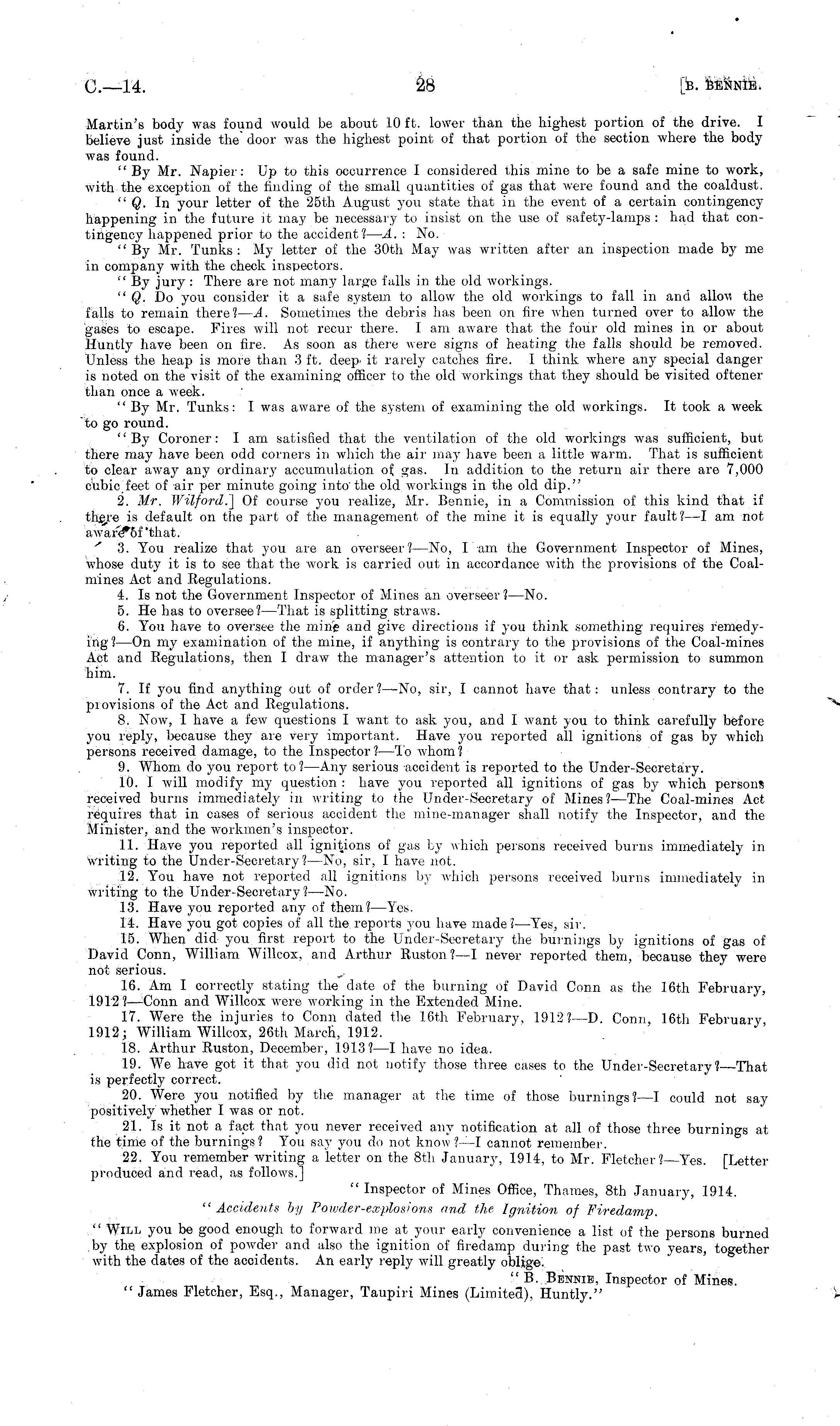 Martin's body was found would be about 10 ft. lower than the highest portion of the drive. I believe just inside the door was the highest point of that portion of the section where the body was found. "By Mr. Napier: Up to this occurrence I considered this mine to be a safe mine to work, with the exception of the finding of the small quantities of gas that were found and the coaldust, " Q. In your letter of the 25th August you state that in the event of a certain contingency happening in the future it may be necessary to insist on the use of safety-lamps : had that contingency happened prior to the accident? — A. : No. " By Mr. 'funks : My letter of the 30th May was written after an inspection made by me in company with the check inspectors. " By jury : There are not many large falls in the old workings. " Q. Do you consider it a safe system to allow the old workings to fall in and allcw the falls to remain there? — A. Sometimes the debris has been on fire when turned over to allow the gases to escape. Fires will not recur there. I am aware that the four old mines in or about Huntly have been on fire. As soon as there were signs of heating the falls should be removed. Unless the heap is more than 3 ft. deep it rarely catches fire. I think where any special danger is noted on the visit of the examining officer to the old workings that they should be visited oftener than once a week. "By Mr. Tunks: I was aware of the system of examining the old workings. It took a week to go round. "By Coroner: I am satisfied that the ventilation of the old workings was sufficient, but there may have been odd corners in which the air may have been a little warm. That is sufficient to clear away any ordinary accumulation of gas. In addition to the return air there are 7,000 cubic feet of air per minute going into'the old workings in the old dip." 2. Mr. Wilford.~\ Of course you realize, Mr. Beimie, in a Commission of this kind that if there is default on the part of the management of the mine it is equally your fault?—l am not award*of 'that. 3. You realize that you are an overseer?—No, I am the Government Inspector of Mines, whose duty it is to see that the work is carried out in accordance with the provisions of the Coalmines Act and Eegulations. 4. Is not the Government Inspector of Mines an overseer? —No. 5. He has to oversee? —That is splitting straws. 6. You have to oversee the mine and give directions if you think something requires remedjing?—On my examination of the mine, if anything is contrary to the provisions of the Coal-mines Act and Regulations, then I draw the manager's attention to it or ask permission to summon him. 7. If you find anything out of order? —No, sir, I cannot have that: unless contrary to the provisions of the Act and Regulations. 8. Now, I have a few questions I want to ask j-ou, and I want you to think carefully before you reply, because they are very important. Have you reported all ignitions of gas by which persons received damage, to the Inspector?—To whom? 9. Whom do you report to? —Any serious accident is reported to the Under-Secretary. 10. I will modify my question : have you reported all ignitions of gas by which persons received burns immediately in writing to the Under-Secretary of Mines? —The Coal-mines Act requires that in cases of serious accident the mine-manager shall notify the Inspector, and the Minister, and the workmen's inspector. 11. Have you reported all ignitions of gas by which persons received burns immediately in writing to the Under-Secretary?—No, sir, I have not. 12. You have not reported all ignitions by which persons received burns immediately in writing to the Under-Secretary? —No. 13. Have you reported any of them? —Yes. 14. Have you got copies of all the reports you have made? —Yes, sir. 15. When did you first report to the Under-Secretary the burnings by ignitions of gas of David Conn, William Willcox, and Arthur Ruston ?—I never reported them, because they were not serious. 16. Am I correctly stating the date of the burning of David Conn as the 16th February, 1912?— Conn and Willcox were working in the Extended Mine. 17. Were the injuries to Conn dated the 16th February, 1912?— D. Conn, 16th February 1912; William Willcox, 26th March, 1912. 18. Arthur Ruston, December, 1913?— I have no idea. 19. We have got it that you did not notify those three cases to the Under-Secretary?—That is perfectly correct. 20. Were you notified by the manager at (lie time of those burnings? —I could not say positively whether I. was or not. 21. Is it not a fact that you never received any notification at all of those three burnings at the time of the burnings? You say you do not know ? —I cannot remember. 22. You remember writing a letter on the Bth January, 1914, to Mr. Fletcher? —Yes. [Letter produced and read, as follows.] " Inspector of Mines Office, Thames, Bth January, 1914. "Accidents by Powder-explosions and the Ignition of Firedamp. " Will you be good enough to forward me at your early convenience a list of the persons burned by the explosion of powder and also the ignition of firedamp during the past two years, together with the dates of the accidents. An early reply will greatly oblige. " B. Bennib, Inspector of Mines. "James Fletcher, Esq., Manager, Taupiri Mines (Limiteo!), Huntly."