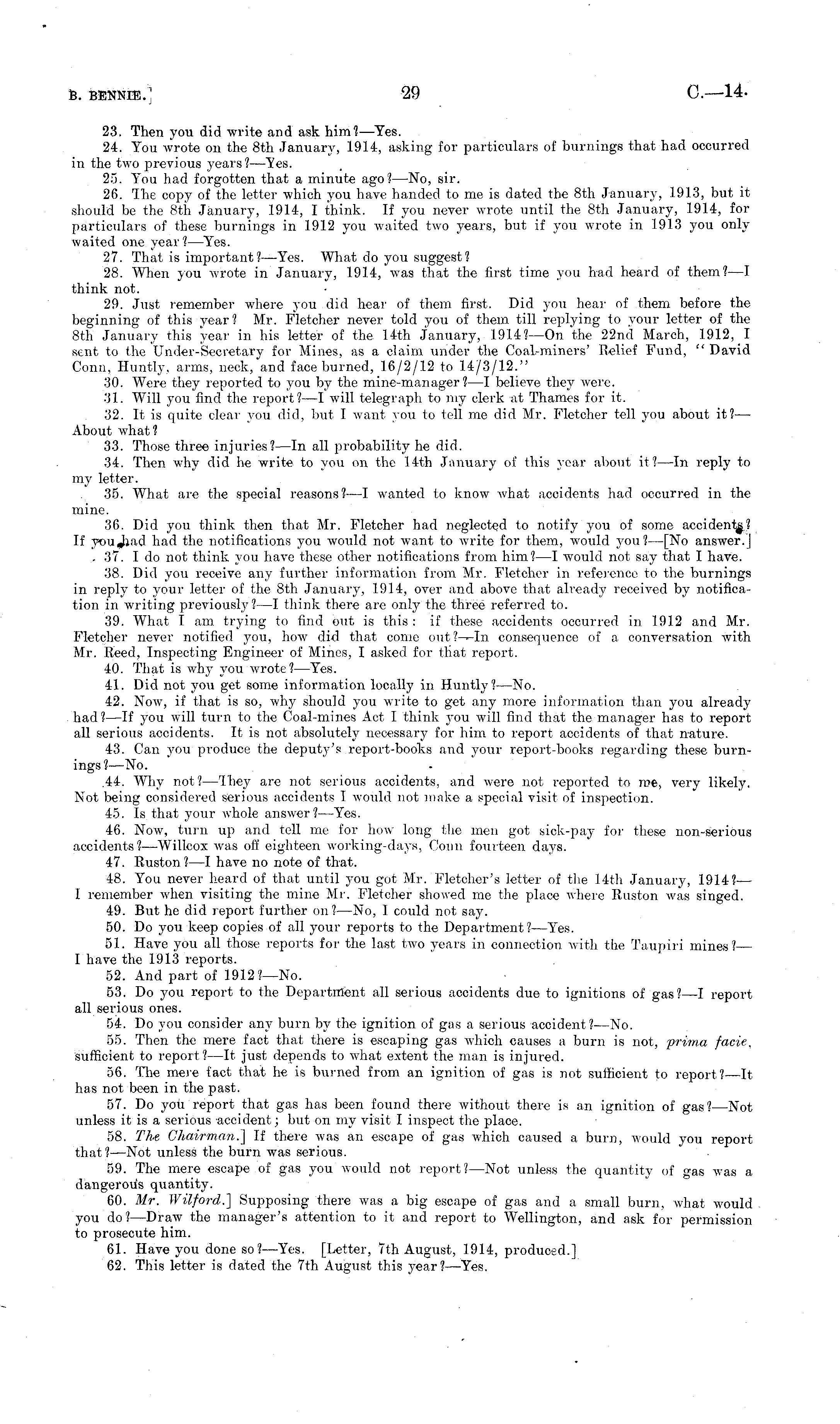 23. Then you did write and ask him? —Yes. 24. You wrote on the Bth January, 1914, asking for particulars of burnings that had occurred in the two previous years?— Yes. 25. You had forgotten that a minute ago?—No, sir. 26. The copy of the letter which you have handed to me is dated the Bth January, 1913, but it should be the Bth January, 1914, I think. If you never wrote until the Bth January, 1914, for particulars of these burnings in 1912 you waited two years, but if you wrote in 1913 you only waited one year I —Yes. 27. That is important? —Yes. What do you suggest? 28. When you wrote in January, 1914, was that the first time you had heard of them?—l think not. 29. Just remember where you did hear of them first. Did you hear of them before the beginning of this year? Mr. Fletcher never told you of them till replying to your letter of the Bth January this year in his letter of the 14th January, 1914?—0n the 22nd March, 1912, I sent to the Under-Secretary for Mines, as a claim under the Coal-miners' Relief Fund, " David Conn, Huntly, arms, neck, and face burned, 16/2/12 to 14/3/12." 30. Were they reported to you by the mine-manager? —I believe they were. 31. Will you find the report? —I will telegraph to my clerk at Thames for it. 32. It is quite clear you did, but I want you to tell me did Mr. Fletcher tell you about it?— About what? 33. Those three injuries?—ln all probability he did. 34. Then why did he write to you on the 14th January of this year about it? —In reply to my letter. 35. What are the special i*easons?—l wanted to know what accidents had occurred in the mine. 36. Did you think then that Mr. Fletcher had neglected to notify you of some If youjiad had the notifications you would not want to write for them, would youl —[No answer.] 37. Ido not think you have these other notifications from him?—l would not say that I have. 38. Did you receive any further information from Mr. Fletcher in reference to the burnings in reply to your letter of the Bth January, 1914, over and above that already received by notification in writing previously? —I think there arc only the three referred to. 39. What I am trying to find out is this : if these accidents occurred in 1912 and Mr. Fletcher never notified you, how did that come consequence of a conversation with Mr. Keed, Inspecting Engineer of Mines, I asked for that report. 40. That is why you wrote? —Yes. 41. Did not you get some information locally in Huntly?—No. 42. Now, if that is so, why should you write to get any more information than you already had?—lf you will turn to the Coal-mines Act I think you will find that the manager has to report all serious accidents. It is not absolutely necessary for him to report accidents of that nature. 43. Can you produce the deputy's report-books and your report-books regarding these burnings?— No. .44. Why not?— They are not serious accidents, and were not i-eported to roe, very likely. Not being considei'ed serious accidents I would not make a special visit of inspection. 45. Is that your whole answer?— Yes. 46. Now, turn up and tell me for how long the men got sick-pay for these non-serious accidents?—Willcox was off eighteen working-days, Conn fourteen days. 47. Ruston? —I have no note of that. 48. You never heard of that until you got Mr. Fletcher's letter of the 14th January, 1914?— I remember when visiting the mine Mr. Fletcher showed me the place where Ruston was singed. 49. But he did report further on?—No, I could not say. 50. Do you keep copies of all your reports to the Department?— Yes. 51. Have you all those reports for the last two years in connection with the Taupiri mines?— I have the 1913 reports. 52. And part of 1912?—N0. 53. Do you report to the Department all serious accidents due to ignitions of gas?—l report all serious ones. 54. Do you consider any burn by the ignition of gas a serious accident?— No. 55. Then the mere fact that there is escaping gas which causes a burn is not, prima facie. sufficient to report?—lt just depends to what extent the man is injured. 56. The mere fact that he is burned from an ignition of gas is not sufficient to report?—lt has not been in the past. 57. Do you report that gas has been found there without there is an ignition of gas?— Not unless it is a serious accident; but on my visit I inspect the place. 58. The Chairman.] If there was an escape of gas which caused a burn, would you report that?— Not unless the burn was serious. 59. The mere escape of gas you would not report?— Not unless the quantity of gas was a dangerous quantity. 60. Mr. Wilford.] Supposing there was a big escape of gas and a small burn, what would you do?— Draw the manager's attention to it and report to Wellington, and ask for permission to prosecute him. 61. Have you done so?— Yes. [Letter, 7th August, 1914, produced.] 62. This letter is dated the 7th August this year?— Yes.