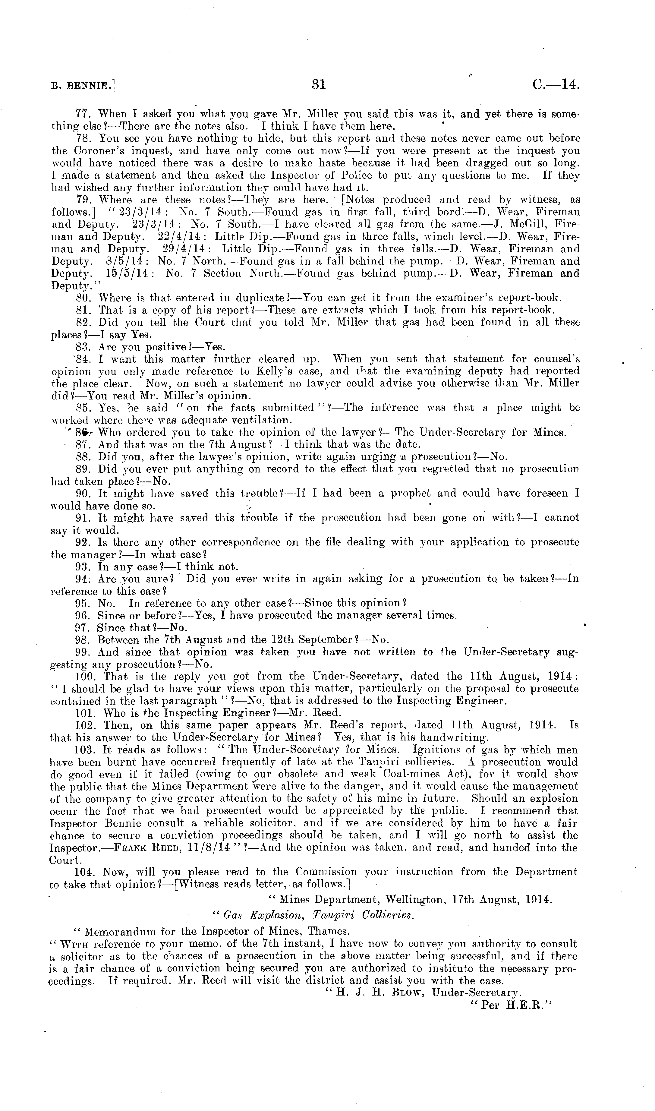77. When I asked you what you gave Mr. Miller you said this was it, and yet there is something else? —There are the notes also. I think I have them here. 78. You see you have nothing to hide, but this report and these notes never came out before the Coroner's inquest, and have only come out now? —If you were present at the inquest you would have noticed there was a desire to make haste because it had been dragged out so long. I made a statement and then asked the Inspector of Police to put any questions to me. If they had wished any further information they could have had it. 79. Where are these notes?—lhey are here. [Notes produced and read by witness, as follows.] "23/3/14: No. 7 South.—Found gas in first fall, third bord.—D. Wear, Fireman and Deputy. 23/3/14 : No. 7 South. —I have cleared all gas from the same. — J. McGill, Fireman and Deputy. 22/4/14 : Little Dip.—Found gas in three falls, winch level.—D. W T ear, Fireman and Deputy. 29/4/14 : Little Dip.—Found gas in three falls. —D. Wear, Fireman and Deputy. 3/5/14: No. 7 North.—Found gas in a fall behind the Wear, Fireman and Deputy. 15/5/14 : No. 7 Section North. —Found gas behind pump. —D. Wear, Fireman and Deputy." 80. Where is that entered in duplicate?— You can get it from the examiner's report-book. 81. That is a copy of his report?— These are extracts which I took from his report-book. 82. Did you tell the Court that you told Mr. Miller that gas had been found in all these places ?—I say Yes. 83. Are you positive? —Yes. 84. I want this matter further cleared up. When you sent that statement for counsel's opinion you only made reference to Kelly's case, and that the examining deputy had reported the place clear. Now, on such a statement no lawyer could advise you otherwise than Mr. Miller did?— You read Mr. Miller's opinion. 85. Yes, he said "on the facts submitted"? —The inference was that a place might be worked where there was adequate ventilation. ' Bft. Who ordered you to take the opinion of the lawyer? —The Under-Secretary for Mines. 87. And that was on the 7th August? —I think that was the date. 88. Did you, after the lawyer's opinion, write again urging a prosecution?— No. 89. Did you ever put anything on record to the effect that you regretted that no prosecution had taken place?— No. 90. It might have saved this trouble?—lf I had been a prophet and could have foreseen I would have done so. 91. It might have saved this trouble if the prosecution had been gone on with? —I cannot say it would. 92. Is there any other correspondence on the file dealing with your application to prosecute the manager? —In what case? 93. In any case? —I think not. 94. Are you sure? Did you ever write in again asking for a prosecution to be taken? —In reference to this case? 95. No. In reference to any other case?— Since this opinion? 96. Since or before? —Yes, I have prosecuted the manager several times. 97. Since that?— No. 98. Between the 7th August and the 12th September?— No. 99. And since that opinion was taken you have not written to the Under-Secretary suggesting any prosecution? —No. 100. That is the reply you got from the Under-Secretary, dated the 11th August, 1914: " I should be glad to have your views upon this matter, particularly on the proposal to prosecute contained in the last paragraph "1 —No, that is addressed to the Inspecting Engineer. 101. Who is the Inspecting Engineer?— Mr. Reed. 102. Then, on this same paper appears Mr. Reed's report, dated 11th August, 1914. Is that his answer to the Under-Secretary for Mines ? —Yes, that is his handwriting. 103. It reads as follows: "The Under-Secretary for Mines. Ignitions of gas by which men have been burnt have occurred frequently of late at the Taupiri collieries. A. prosecution would do good even if it failed (owing to our obsolete and weak Coal-mines Act), for it would show the public that the Mines Department were alive to the danger, and it would cause the management of the company to give greater attention to the safety of his mine in future. Should an explosion occur the fact that we had prosecuted would be appreciated by the public. I recommend that Inspector Bennie consult a reliable solicitor, and if we are considered by him to have a fair chance to secure a conviction proceedings should be taken, and I will go north to assist the Inspector.—Fbank Reed, 11/8/14 "? —And the opinion was taken, and read, and handed into the Court. 104. Now, will you please read to the Commission your instruction from the Department to take that opinion ?—[Witness reads letter, as follows.] " Mines Department, Wellington, 17th August, 1914. " Gas Explosion, Taupiri Collieries. " Memorandum for the Inspector of Mines, Thames. " With reference to your memo, of the 7th instant, I have now to convey you authority to consult a solicitor as to the chances of a prosecution in the above matter being successful, and if there is a fair chance of a conviction being secured you are authorized to institute the necessary proceedings. If required, Mr. Reed will visit the district and assist you with the case. "H. J. H. Blow, Under-Secretary. "Per H.E.R."
