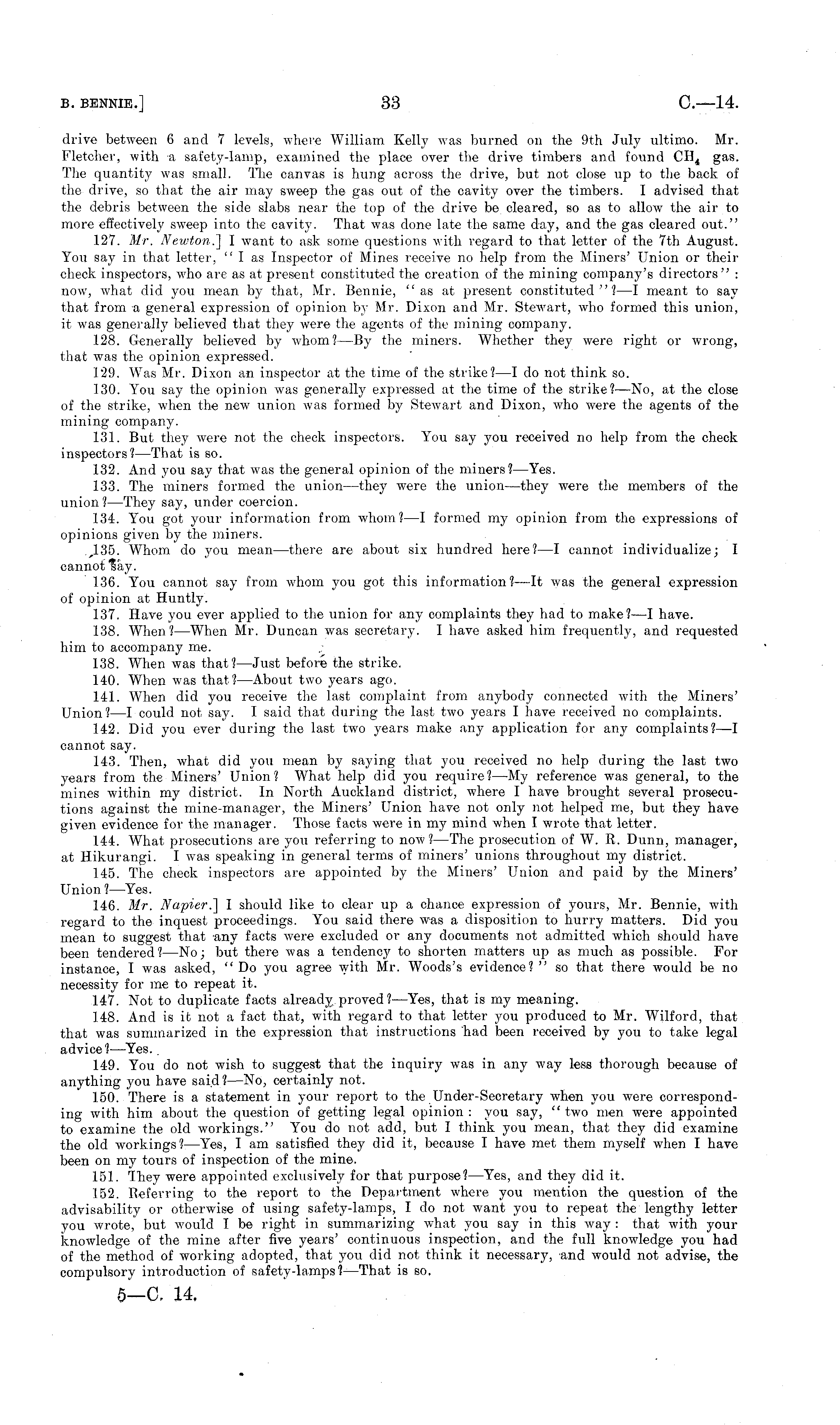 drive between 6 and 7 levels, where William Kelly was burned on the 9th July ultimo. Mr. Fletcher, with a safety-lamp, examined the place over the drive timbers and found CH 4 gas. The quantity was small. 'Hie canvas is hung across the drive, but not close up to the back of the drive, so that the air may sweep the gas out of the cavity over the timbers. I advised that the debris between the side slabs near the top of the drive be cleared, so as to allow the air to more effectively sweep into the cavity. That was done late the same day, and the gas cleared out." 127. Mr. Newton.~\ I want to ask some questions with regard to that letter of the 7th August. You say in that letter, " I as Inspector of Mines receive no help from the Miners' Union or their check inspectors, who are as at present constituted the creation of the mining company's directors" : now, what did you mean by that, Mr. Bennie, "as at present constituted"?—l meant to say that from a general expression of opinion by Mr. Dixon and Mr. Stewart, who formed this union, it was generally believed that they were the agents of the mining company. 128. Generally believed by whom? —By the miners. Whether they were right or wrong, that was the opinion expressed. 129. Was Mr. Dixon an inspector at the time of the strike? —I do not think so. 130. You say the opinion was generally expressed at the time of the strike?—No, at the close of the strike, when the new union was formed by Stewart and Dixon, who were the agents of the mining company. 131. But they were not the check inspectors. You say you received no help from the check inspectors?— That is so. 132. And you say that was the general opinion of the miners? —Yes. 133. The miners formed the union—they were the union—they were the members of the union? —They say, under coercion. 134. You got your information from whom?—l formed my opinion from the expressions of opinions given by the miners. 135. Whom do you mean —there are about six hundred here? —I cannot individualize; I cannot lay. 136. You cannot say from whom you got this information? —It was the general expression of opinion at Huntly. 137. Have you ever applied to the union for any complaints they had to make? —I have. 138. When? —When Mr. Duncan was secretary. I have asked him frequently, and requested him to accompany me. 138. When was that? —Just before the strike. 140. When was that? —About two years ago. 141. When did you receive the last complaint from anybody connected with the Miners' Union ? —I could not say. I said that during the last two years I have received no complaints. 142. Did you ever during the last two years make any application for any complaints?—l cannot say. 143. Then, what did you mean by saying that you received no help during the last two years from the Miners' Union? What help did you require? —My reference was general, to the mines within my district. In North Auckland district, where I have brought several prosecutions against the mine-manager, the Miners' Union have not only not helped me, but they have given evidence for the manager. Those facts were in my mind when I wrote that letter. 144. What prosecutions are you referring to now? —The prosecution of W. R. Dunn, manager, at Hikurangi. I was speaking in general terms of miners' unions throughout my district. 145. The check inspectors are appointed by the Miners' Union and paid by the Miners' Union I—Yes.1 —Yes. 146. Mr. Napier.~\ I should like to clear up a chance expression of yours, Mr. Bennie, with regard to the inquest proceedings. You said there was a disposition to hurry matters. Did you mean to suggest that any facts were excluded or any documents not admitted which should have been tendered? —No; but there was a tendency to shorten matters up as much as possible. For instance, I was asked, "Do you agree with Mr. Woods's evidence?" so that there would be no necessity for me to repeat it. 147. Not to duplicate facts already, proved?— Yes, that is my meaning. 148. And is it not a fact that, with regard to that letter you produced to Mr. Wilford, that that was summarized in the expression that instructions had been received by you to take legal advice? —Yes.. 149. You do not wish to suggest that the inquiry was in any way less thorough because of anything you have said? —No, certainly not. 150. There is a statement in your report to the Under-Secretary when you were corresponding with him about the question of getting legal opinion : you say, " two men were appointed to examine the old workings." You do not add, but I think you mean, that they did examine the old workings? —Yes, I am satisfied they did it, because I have met them myself when I have been on my tours of inspection of the mine. 151. They were appointed exclusively for that purpose?— Yes, and they did it. 152. Referring to the report to the Department where you mention the question of the advisability or otherwise of using safety-lamps, I do not want you to repeat the lengthy letter you wrote, but would I be right in summarizing what you say in this way : that with your knowledge of the mine after five years' continuous inspection, and the full knowledge you had of the method of working adopted, that you did not think it necessary, and would not advise, the compulsory introduction of safety-lamps?— That is so.