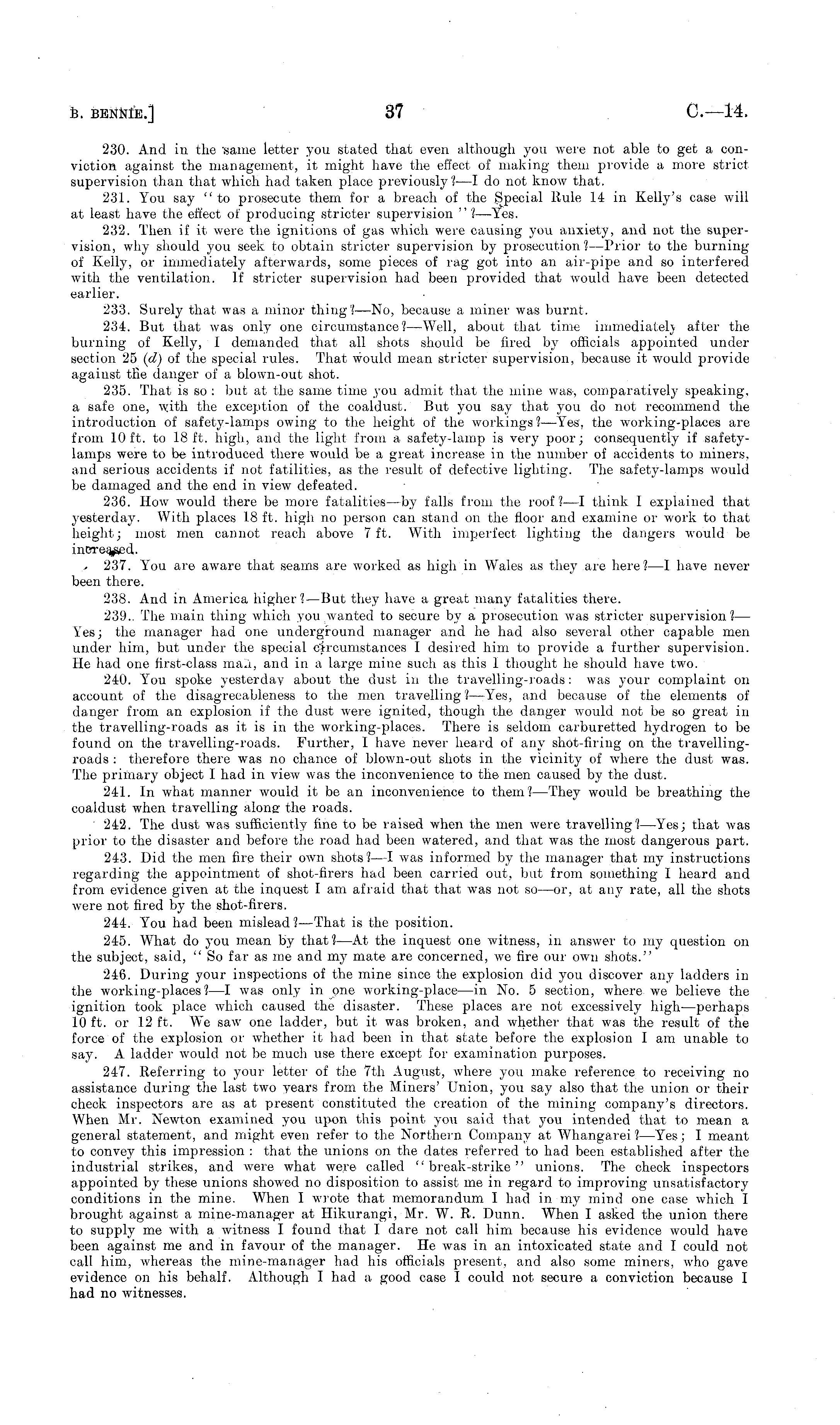 230. And in the 'same letter you stated that even although you were not able to get a conviction against the management, it might have the effect of making them provide a more strict supervision than that which had taken place previously? —I do not know that. 231. You say "to prosecute them for a breach of the Special Rule 14 in Kelly's case will at least have the effect of producing stricter supervision " I —Yes. 232. Then if it were the ignitions of gas which were causing you anxiety, and not the supervision, why should you seek to obtain stricter supervision by prosecution?— Prior to the burning of Kelly, or immediately afterwards, some pieces of rag got into an air-pipe and so interfered with the ventilation. If stricter supervision had been provided that would have been detected earlier. 233. Surely that was a minor thing?—No, because a miner was burnt. 234. But that was only one circumstance?— Well, about that time immediately after the burning of Kelly, 1 demanded that all shots should be fired by officials appointed under section 25 (d) of the special rules. That would mean stricter supervision, because it would provide against tKe danger of a blown-out shot. 235. That is so : but at the same time you admit that the mine was, comparatively speaking, a safe one, with the exception of the coaldust. But you say that you do not recommend the introduction of safety-lamps owing to the height of the workings?— Yes, the working-places are from 10ft. to 18 ft. high, and the light from a safety-lamp is very poor; consequently if safetylamps were to be introduced there would be a great increase in the number of accidents to miners, and serious accidents if not fatilities, as the result of defective lighting. The safety-lamps would be damaged and the end in view defeated. 236. How would there be more fatalities—by falls from the roof ?—I think I explained that yesterday. With places 18 ft. high no person can stand on the floor and examine or work to that height; most men cannot reach above 7 ft. With imperfect lighting the dangers would be increased. 237. You are aware that seams are worked as high in Wales as they are here? —I have never been there. 238. And in America higher?— But they have a great many fatalities there. 239.. The main thing which you wanted to secure by a prosecution was stricter supervision?— Yes; the manager had one underground manager and he had also several other capable men under him, but under the special circumstances I desired him to provide a further supervision. He had one first-class mail, and in a large mine such as this 1 thought he should have two. 240. You spoke yesterday about the dust in the travelling-roads: was your complaint on account of the disagreeableness to the men travelling?— Yes, and because of the elements of danger from an explosion if the dust were ignited, though the danger would not be so great in the travelling-roads as it is in the working-places. There is seldom carburetted hydrogen to be found on the travelling-roads. Further, I have never heard of any shot-firing on the travellingroads : therefore there was no chance of blown-out shots in the vicinity of where the dust was. The primary object I had in view was the inconvenience to the men caused by the dust. 241. In what manner would it be an inconvenience to them? —They would be breathing the coaldust when travelling alone the roads. 242. The dust was sufficiently fine to be raised when the men were travelling? —Yes; that was prior to the disaster and before the road had been watered, and that was the most dangerous part. 243. Did the men fire their own shots?—l was informed by the manager that my instructions regarding the appointment of shot-firers had been carried out, but from something 1 heard and from evidence given at the inquest I am afraid that that was not so—or, at any rate, all the shots were not fired by the shot-firers. 244. You had been mislead?— That is the position. 245. What do you mean by that?—At the inquest one witness, in answer to my question on the subject, said, " So far as me and my mate are concerned, we fire our own shots." 246. During your inspections of the mine since the explosion did you discover any ladders in the working-places?—l was only in one working-place—in No. 5 section, where we believe the ignition took place which caused the disaster. These places are not excessively high-—perhaps 10 ft. or 12 ft. We saw one ladder, but it was broken, and whether that was the result of the force of the explosion or whether it had been in that state before the explosion I am unable to say. A ladder would not be much use there except for examination purposes. 247. Referring to your letter of the 7th August, where you make reference to receiving no assistance during the last two years from the Miners' Union, you say also that the union or their check inspectors are as at present constituted the creation of the mining company's directors. When Mr. Newton examined you upon this point you said that you intended that to mean a general statement, and might even refer to the Northern Company at Whangarei ?—Yes; I meant to convey this impression : that the unions on the dates referred to had been established after the industrial strikes, and were what were called "break-strike" unions. The check inspectors appointed by these unions showed no disposition to assist me in regard to improving unsatisfactory conditions in the mine. When I wrote that memorandum I had in my mind one case which I brought against a mine-manager at Hikurangi, Mr. W. R. Dunn. When I asked the union there to supply me with a witness I found that I dare not call him because his evidence would have been against me and in favour of the manager. He was in an intoxicated state and I could not call him, whereas the mine-manager had his officials present, and also some miners, who gave evidence on his behalf. Although I had a good case I could not secure a co