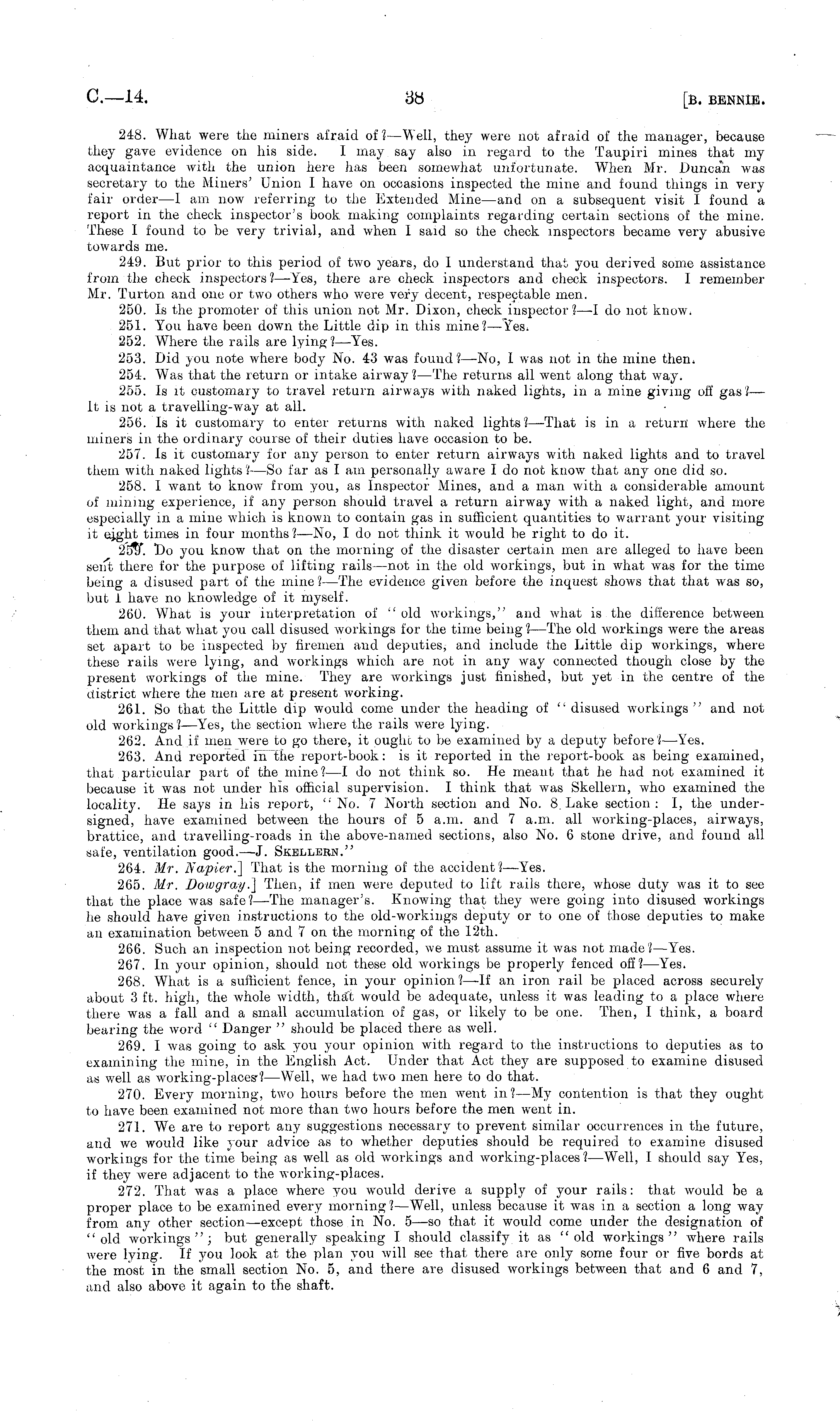 248. What were the miners afraid of?— Well, they were not afraid of the manager, because they gave evidence on his side. I may say also in regard to the Taupiri mines that my acquaintance with the union here has been somewhat unfortunate. When Mr. Duncan was secretary to the Miners' Union I have on occasions inspected the mine and found things in very fair order —1 am now referring to the Extended Mme —and on a subsequent visit I found a report in the check inspector's book making complaints regarding certain sections of the mine. These 1 found to be very trivial, and when I said so the check inspectors became very abusive towards me. 249. But prior to this period of two years, do 1 understand that you derived some assistance from the check inspectors?— Yes, there are check inspectors and check inspectors. I remember Mr. Turton and one or two others who were very decent, respectable men. 250. Is the promoter of this union not Mr. Dixon, check inspector? —I do not know. 251. You have been down the Little dip in this mine?— Yes. 252. Where the rails are lying?— Yes. 253. Did you note where body No. 43 was found? —No, I was not in the mine then. 254. Was that the return or intake airway ? —The returns all went along that way. 255. Is it customary to travel return airways with naked lights, in a mine giving off gas?— it is not a travelling-way at all. 256. Is it customary to enter returns with naked lights?— That is in a return where the miners in the ordinary course of their duties have occasion to be. 257. Is it customary for any person to enter return airways with naked lights and to travel them with naked lights ?—So far as I am personally aware I do not know that any one did so. 258. I want to know from you, as Inspector Mines, and a man with a considerable amount of mining experience, if any person should travel a return airway with a naked light, and more especially in a mine which is known to contain gas in sufficient quantities to warrant your visiting it eight times in four months ?—No, I do not think it would be right to do it. I)o you know that on the morning of the disaster certain men are alleged to have been sent there for the purpose of lifting rails —not in the old workings, but in what was for the time being a disused part of the mine I —The evidence given before the inquest shows that that was so, but 1 have no knowledge of it myself. 260. What is your interpretation of " old workings," and what is the difference between them and that what you call disused workings for the time being ?—The old workings were the areas set apart to be inspected by liremen and deputies, and include the Little dip workings, where these rails were lying, and workings which are not in any way connected though close by the present workings of the mine. They are workings just finished, but yet in the centre of the district where the men are at present working. 261. So that the Little dip would come under the heading of " disused workings " and not old workings?— Yes, the section where the rails were lying. 262. And if men were to go there, it ought to be examined by a deputy before?— Yes. 263. And reported in the report-book: is it reported in the report-book as being examined, that particular part of the mine? —I do not think so. He meant that he had not examined it because it was not under his official supervision. I think that was Skelleni, who examined the locality. He says in his report, "No. 7 North section and No. 8. Lake section: I, the undersigned, have examined between the hours of 5 a.m. and 7 a.m. all working-places, airways, brattice, and travelling-roads in the above-named sections, also No. 6 stone drive, and found all safe, ventilation good. — J. Skbllern." 264. Mr. Napier.] That is the morning of the accident? —Yes. 265. Mr. Bowgray .] Then, if men were deputed to lift rails there, whose duty was it to see that the place was safe? —The manager's. Knowing that they were going into disused workings he should have given instructions to the old-workings deputy or to one of those deputies to make an examination between 5 and 7 on the morning of the 12th. 266. Such an inspection not being recorded, we must assume it was not made? —Yes. 267. In your opinion, should not these old workings be properly fenced off? —Yes. 268. What is a sufficient fence, in your opinion? —If an iron rail be placed across securely about 3 ft. high, the whole width, that would be adequate, unless it was leading to a place where there was a fall and a small accumulation of gas, or likely to be one. Then, I think, a board bearing the word " Danger " should be placed there as well. 269. I was going to ask you your opinion with regard to the instructions to deputies as to examining the mine, in the English Act. Under that Act they are supposed to examine disused as well as working-places , ?— Well, we had two men here to do that. 270. Every morning, two hours before the men went in?—My contention is that they ought to have been examined not more than two hours before the men went in. 271. We are to report any suggestions necessary to prevent similar occurrences in the future, and we would like your advice as to whether deputies should be required to examine disused workings for the time being as well as old workings and working-places?— Well, I should say Yes, if they were adjacent to the working-places. 272. That was a place where you would derive a supply of your rails: that would be a proper place to be examined every morning?— Well, unless because it was in a section a long way from any other section—except those in No. s—so5 —so that it would come under the designation of "old workings"; but generally speaking I should classify it as "old workings" where rails were lying. If you look at the plan you will see that there are only some four or five bords at the most in the small section No. 5, and there are disused workings between that and 6 and 7, 