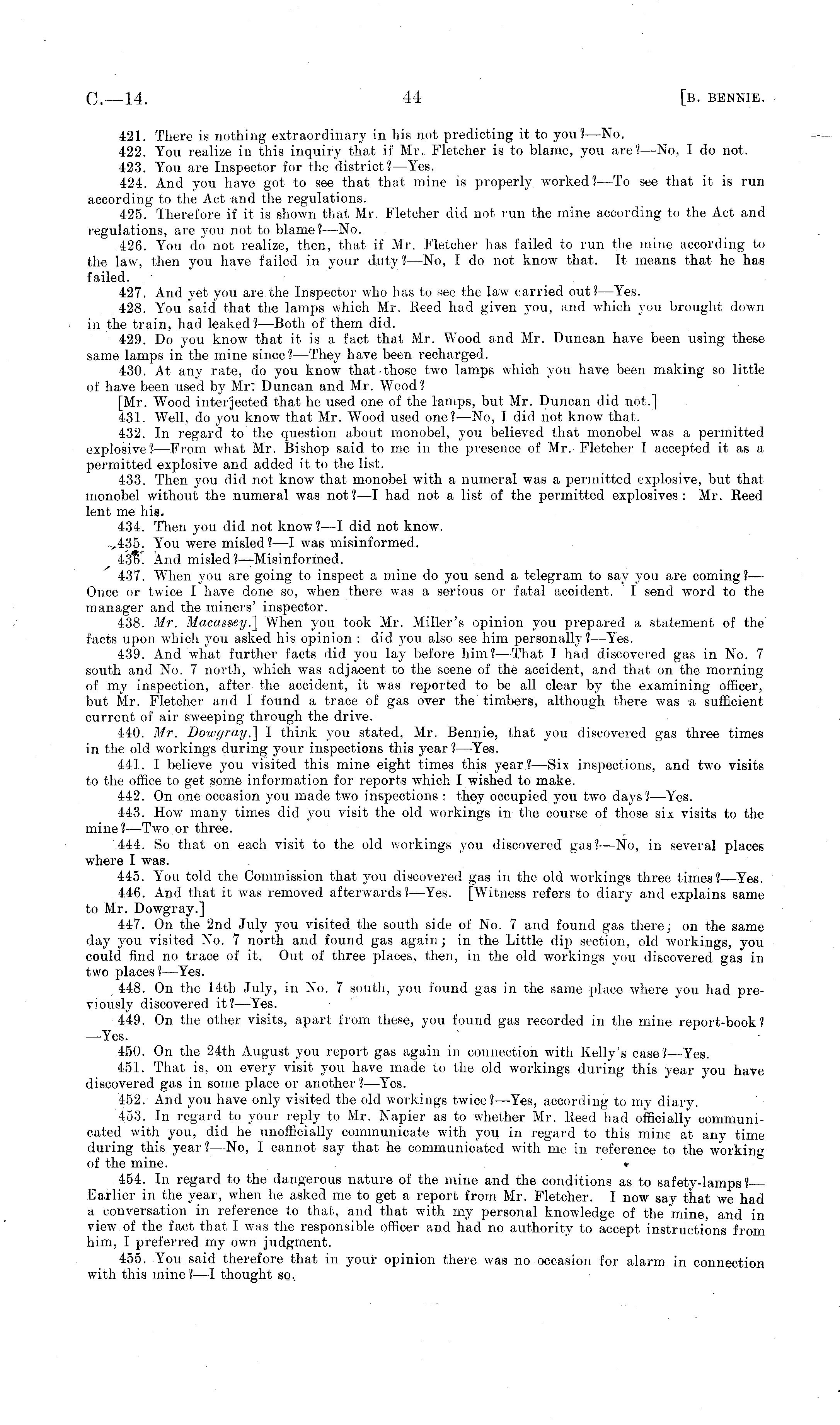 4:21. There is nothing extraordinary in his not predicting it to you?— No. 422. You realize in this inquiry that if Mr. Fletcher is to blame, you are'!—No, I do not. 423. You are Inspector for the district? —Yes. 424. And you have got to see that that mine is properly worked? —To see that it is run according to the Act and the regulations. 425. Therefore if it is shown that Mr. Fletcher did not run the mine according to the Act and regulations, are you not to blame?— No. 426. You do not realize, then, that if Mr. Fletcher has failed to run the mine according to the law, then you have failed in your duty? —No, I do not know that. It means that he has failed. 427. And yet you are the Inspector who has to see the law carried out? —Yes. 428. You said that the lamps which Mr. Reed had given you, and which you brought down in the train, had leaked? —Both of them did. 429. Do you know that it is a fact that Mr. Wood and Mr. Duncan have been using these same lamps in the mine since? —They have been recharged. 430. At any rate, do you know that-those two lamps which you have been making so little of have been used by Mr: Duncan and Mr. Wood? [Mr. Wood interjected that he used one of the lamps, but Mr. Duncan did not.] 431. Well, do you know that Mr. Wood used one?—No, I did not know that. 432. In regard to the question about monobel, you believed that monobel was a permitted explosive?— From what Mr. Bishop said to me in the presence of Mr. Fletcher I accepted it as a permitted explosive and added it to the list. 433. Then you did not know that monobel with a numeral was a permitted explosive, but that monobel without the numeral was not?—l had not a list of the permitted explosives: Mr. Keed lent me his. 434. Then you did not know ?—I did not know. .435. You were misled? —I was misinformed. And misled '—Misinformed. 437. When you are going to inspect a mine do you send a telegram to say you are coming? — Once or twice I have done so, when there was a serious or fatal accident. I send word to the manager and the miners' inspector. 438. Mr. Macassey.~\ When you took Mr. Miller's opinion you prepared a statement of the facts upon which you asked his opinion : did you also see him personally?— Yes. 439. And what further facts did you lay before him? —That I had discovered gas in No. 7 south and No. 7 north, which was adjacent to the scene of the accident, and that on the morning of my inspection, after the accident, it was reported to be all clear by the examining officer, but Mr. Fletcher and I found a trace of gas over the timbers, although there was a sufficient current of air sweeping through the drive. 440. Mr. Dowgray .] I think you stated, Mr. Bennie, that you discovered gas three times in the old workings during your inspections this year?— Yes. 441. I believe you visited this mine eight times this year? —Six inspections, and two visits to the office to get some information for reports which I wished to make. 442. On one occasion you made two inspections : they occupied you two days?— Yes. 443. How many times did you visit the old workings in the course of those six visits to the mine? —Two or three. 444. So that on each visit to the old workings you discovered gas?—No, in several places where I was. 445. You told the Commission that you discovered gas in the old workings three times?— Yes. 446. And that it was removed afterwards? —Yes. [Witness refers to diary and explains same to Mr. Dowgray.] 447. On the 2nd July you visited the south side of No. 7 and found gas there; on the same day you visited No. 7 north and found gas again; in the Little dip section, old workings, you could find no trace of it. Out of three places, then, in the old workings you discovered gas in two places? —Yes. 448. On the 14th July, in No. 7 south, you found gas in the same place where you had previously discovered it? —Yes. .449. On the other visits, apart from these, you found gas recorded in the mine report-book? —Yes. 450. On the 24th August you report gas again in connection with Kelly's case?— Yes. 451. That is, on every visit you have made to the old workings during this year you have discovered gas in some place or another ?—Yes. 452. And you have only visited the old workings twice?— Yes, according to my diary. 453. In regard to your reply to Mr. Napier as to whether Mr. Reed had officially communicated with you, did he unofficially communicate with you in regard to this mine at any time during this year ?—No, I cannot say that he communicated with me in reference to the working of the mine. 454. In regard to the dangerous nature of the mine and the conditions as to safety-lamps ? Ea.rlier in the year, when he asked me to get a report from Mr. Fletcher. I now say that we had a conversation in reference to that, and that with my personal knowledge of the mine, and in view of the fact that I was the responsible officer and had no authority to accept instructions from him, I preferred my own judgment. 455. You said therefore that in your opinion there was no occasion for alarm in connection with this mine?—l thought so..
