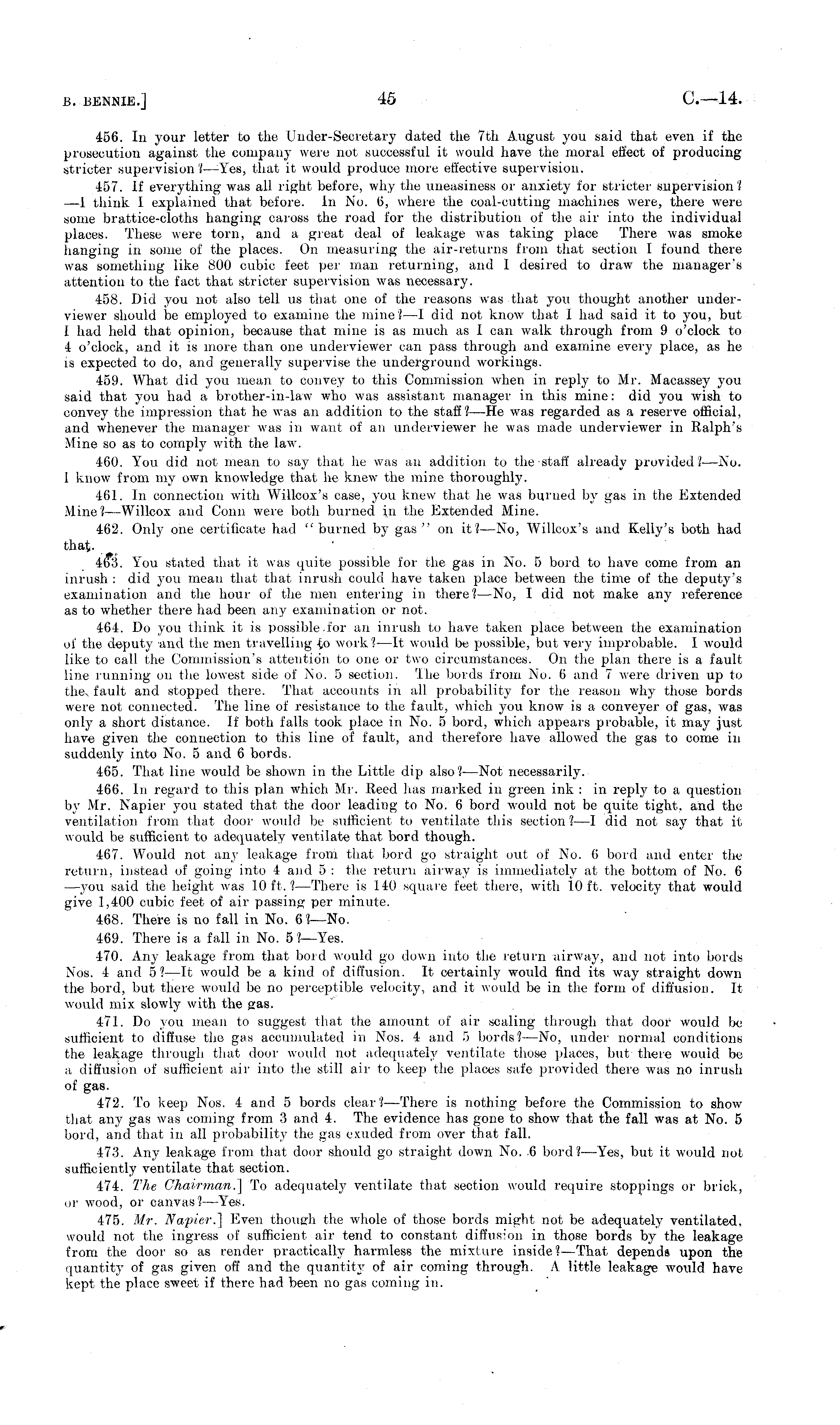 456. In your letter to the Under-Secretary dated the 7th August you said that even if the prosecution against the company were not successful it would have the moral effect of producing stricter supervision?—-Yes, that it would produce more effective supervision. 457. If everything was all right before, why the uneasiness or anxiety for stricter supervision i —I think I explained that before. In No. 6, where the coal-cutting machines were, there were some brattice-cloths hanging caross the road for the distribution of the air into the individual places. These were torn, and a great deal of leakage was taking place There was smoke hanging in some of the places. On measuring the air-returns from that section I found there was something like 800 cubic feet per man returning, and I desired to draw the manager's attention to the fact that stricter supervision was necessary. 458. Did you not also tell us that one of the reasons was that you thought another underviewer should be enrployed to examine the mine?—l did not know that 1 had said it to you, but I had held that opinion, because that mine is as much as 1 can walk through from 9 o'clock to 4 o'clock, and it is more than one uuderviewer can pass through and examine every place, as he is expected to do, and generally supervise the underground workings. 459. What did you mean to convey to this Commission when in reply to Mr. Macassey you said that you had a brother-in-law who was assistant manager in this mine: did you wish to convey the impression that he was an addition to the staff?—He was regarded as a reserve official, and whenever the manager was in want of an underviewer he was made underviewer in Ralph's Mine so as to comply with the law. 460. You did not mean to sa}- that lie was an addition to the staff already provided I —No. 1 know from my own knowledge that he knew the mine thoroughly. 461. In connection with Willcox's case, you knew that he was burned by gas in the Extended Mine?—Willcox and Conn were both burned i.n the Extended Mine. 462. Only one certificate had "burned by gas" on it? —No, Willcox's and Kelly's both had that. 463. You stated that it was quite possible for the gas in No. 5 bord to have come from an inrush : did you mean that that inrush could have taken place between the time of the deputy's examination and the hour of the men entering in there ?—No, I did not make any reference as to whether there had been any examination or not. 464. Do you think it is possible for an inrush to have taken place between the examination of the deputy and the men travelling to work I —lt would be possible, but very improbable. I would like to call the Commission's attention to one or two circumstances. On the plan there is a fault line running on the lowest side of No. 5 section. The bords from No. 6 and 7 were driven up to the fault and stopped there. That accounts in all probability for the reason why those bords were not connected. The line of resistance to the fault, which you know is a conveyer of gas, was only a short distance. If both falls took place in No. 5 bord, which appears probable, it may just have given the connection to this line of fault, and therefore have allowed the gas to come in suddenly into No. 5 and 6 bords. 465. That line would be shown in the Little dip also?— Not necessarily. 466. In regard to this plan which Mr. Reed has marked in green ink : in reply to a question by Mr. Napier you stated that the door leading to No. 6 bord would not be quite tight, and the ventilation from that door would be sufficient to ventilate this section ?—1 did not say that it would be sufficient to adequately ventilate that bord though. 467. Would not any leakage from that bord go straight out of No. 6 bord and enter the return, instead of going into 4 and 5 : the return airway is immediately at the bottom of No. 6 —you said the height was 10 ft.?— There is 140 square feet there, with 10 ft. velocity that would give 1,400 cubic feet of air passing per minute. 468. There is no fall in No. 6?— No. 469. There is a fall in No. s?—Yes. 470. Any leakage from that bord would go down into the return airway, and not into bords Nos. 4 and s?—lt would be a kind of diffusion. It certainly would find its way straight down the bord, but there would be no perceptible velocity, and it would be in the form of diffusion. It would mix slowly with the gas. 471. Do you mean to suggest that the amount of air scaling through that door would be sufficient to diffuse the gas accumulated in Nos. 4 and 5 bords? —No, under normal conditions the leakage through that door would not adequately ventilate those places, but there would be a diffusion of sufficient air into the still air to keep the places safe provided there was no inrush of gas. 472. To keep Nos. 4 and 5 bords clear? —There is nothing before the Commission to show that any gas was coming from 3 and 4. The evidence has gone to show that the fall was at No. 5 bord, and that in all probability the gas exuded from over that fall. 473. Any leakage from that door should go straight down No. 6 bord? —Yes, but it would not sufficiently ventilate that section. 474. The Chairman.] To adequately ventilate that section would require stoppings or brick, or wood, or canvas? —Yes. 475. Mr. Napier.] Even though the whole of those bords might not be adequately ventilated, would not the ingress of sufficient air tend to constant diffus:ou in those bords by the leakage from the door so as render practically harmless the mixture inside?— That depends upon the quantity of gas given off and the quantity of air coming through. A little leakage would have kept the place sweet if there had been no gas coming in.