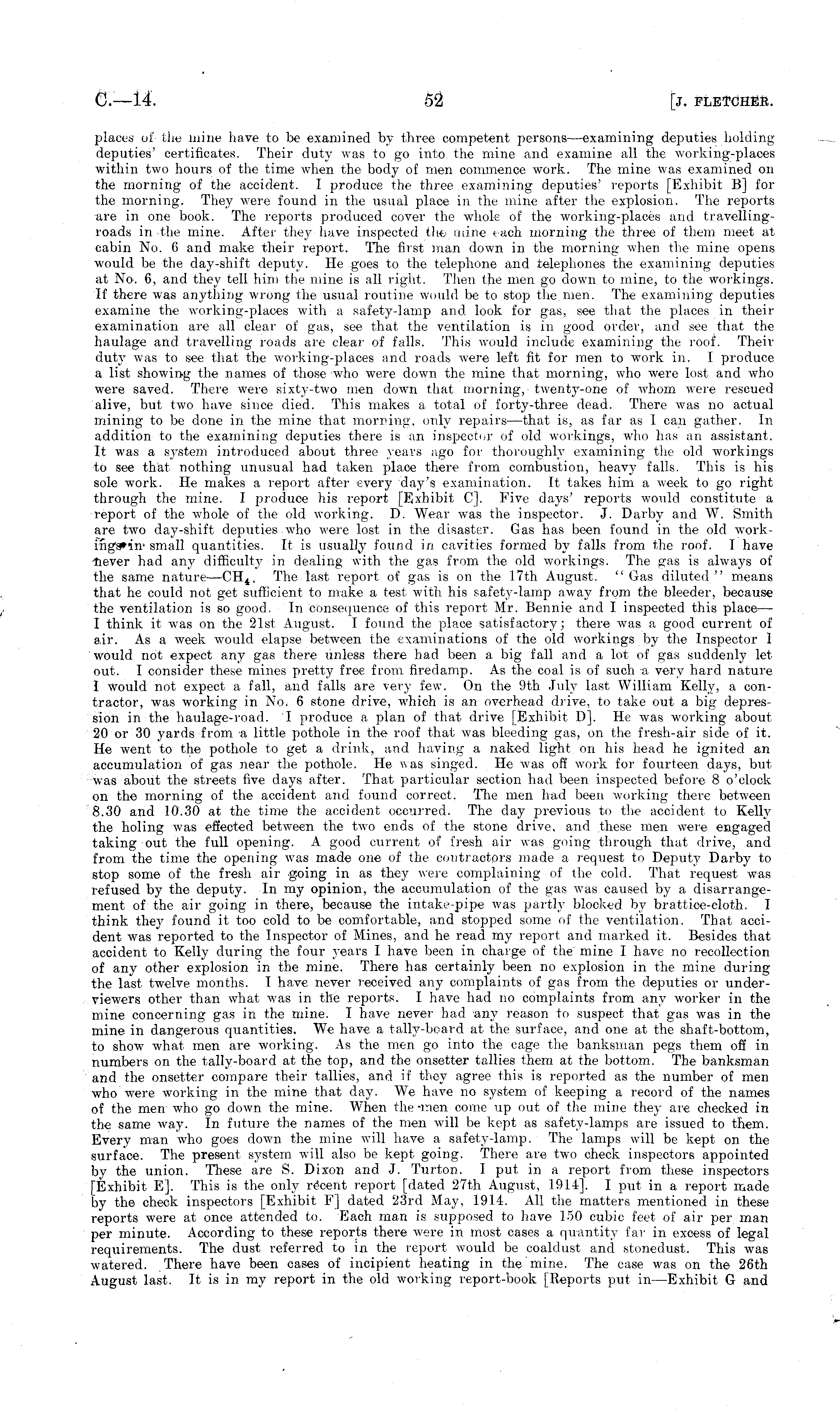 places of the mine have to be examined by three competent persons —examining deputies holding deputies' certificates. Their duty was to go into the mine and examine all the working-places within two hours of the time when the body of men commence work. The mine was examined on the morning of the accident. I produce the three examining deputies' reports [Exhibit B] for the morning. They were found in the usual place in the mine after the explosion. The reports are in one book. The reports produced cover the whole of the working-places and travellingroads in the mine. After they have inspected the mine each morning the three of them meet at cabin No. 6 and make their report. The first man down in the morning when the mine opens would be the day-shift deputy. He goes to the telephone and telephones the examining deputies at No. 6, and the)' tell him the mine is all right. Then the men go down to mine, to the workings. If there was anything wrong the usual routine would be to stop the men. The examining deputies examine the working-places with a safety-lamp and look for gas, see that the places in their examination are all clear of gas, see that the ventilation is in good order, and see that the haulage and travelling roads are clear of falls. This would include examining the roof. Their duty was to see that the working-places and roads were left fit for men to work in. I produce a list showing the names of those who were down the mine that morning, who were lost and who were saved. There were sixty-two men down that morning, twenty-one of whom were rescued alive, but two have since died. This makes a. total of forty-three dead. There was no actual mining to be done in the mine that morning, only repairs—that is, as far as I can gather. In addition to the examining deputies there is an inspector of old workings, who has an assistant. It was a system introduced about three years ago for thoroughly examining the old workings to see that nothing unusual had taken place there from combustion, heavy falls. This is his sole work. He makes a report after every day's examination. It takes him a week to go right through the mine. I produce his report [Exhibit C], Five days' reports would constitute a report of the whole of the old working. D. Wear was the inspector. J. Darby and W. Smith are two day-shift deputies who were lost in the disaster. Gas has been found in the old workihgß»in small quantities. It is usually found in cavities formed by falls from the roof. I have never had any difficulty in dealing with the gas from the old workings. The gas is always of the same nature —CH 4 . The last report of gas is on the 17th August. "Gas diluted" means that he could not get sufficient to make a test with his safety-lamp away from the bleeder, because the ventilation is so good. In consequence of this report Mr. Bennie and I inspected this place— I think it was on the 21st August. I found the place satisfactory; there was a good current of air. As a week would elapse between the examinations of the old workings by the Inspector I would not expect any gas there unless there had been a big fall and a lot of gas suddenly let out. I consider these mines pretty free from firedamp. As the coal is of such a very hard nature I would not expect a fall, and falls are very few. On the 9th July last William Kelly, a contractor, was working in No. 6 stone drive, which is an overhead drive, to take out a big depression in the haulage-road. I produce a plan of that drive [Exhibit D]. He was working about 20 or 30 yards from a little pothole in the roof that was bleeding gas, on the fresh-air side of it. He went to the pothole to get a drink, and having a naked light on his head he ignited an accumulation of gas near the pothole. He was singed. He was off work for fourteen days, but was about the streets five days after. That particular section had been inspected before 8 o'clock on the morning of the accident and found correct. The men had been working there between 8.30 and 10.30 at the time the accident occurred. The day previous to the accident to Kelly the holing was effected between the two ends of the stone drive, and these men were engaged taking out the full opening. A good current of fresh air was going through that drive, and from the time the opening was made one of the contractors made a request to Deputy Darby to stop some of the fresh air -going in as they were complaining of the cold. That request was refused by the deputy. In my opinion, the accumulation of the gas was caused by a disarrangement of the air going in there, because the intake-pipe was partly blocked by brattice-cloth. I think they found it too cold to be comfortable, and stopped some of the ventilation. That accident was reported to the Inspector of Mines, and he read my report and marked it. Besides that accident to Kelly during the four years I have been in charge of the mine I have no recollection of any other explosion in the mine. There has certainly been no explosion in the mine during the last twelve months. I have never received any complaints of gas from the deputies or underviewers other than what was in the reports. I have had no complaints from any worker in the mine concerning gas in the mine. I have never had any reason to suspect that gas was in the mine in dangerous quantities. We have a tally-board at the surface, and one at the shaft-bottom, to show what men are working. As the men go into the cage the banksman pegs them off in numbers on the tally-board at the top, and the onsetter tallies them at the bottom. The banksman and the onsetter compare their tallies, and if they agree this is reported as the number of men who were working in the mine that day. We have no system of keeping a record of the names of the men who go down the mine. When the men come up out of the mine they are checked in the same way. In future the names of the men will be kept as safety-lamps are issued to them. Every man who goes down