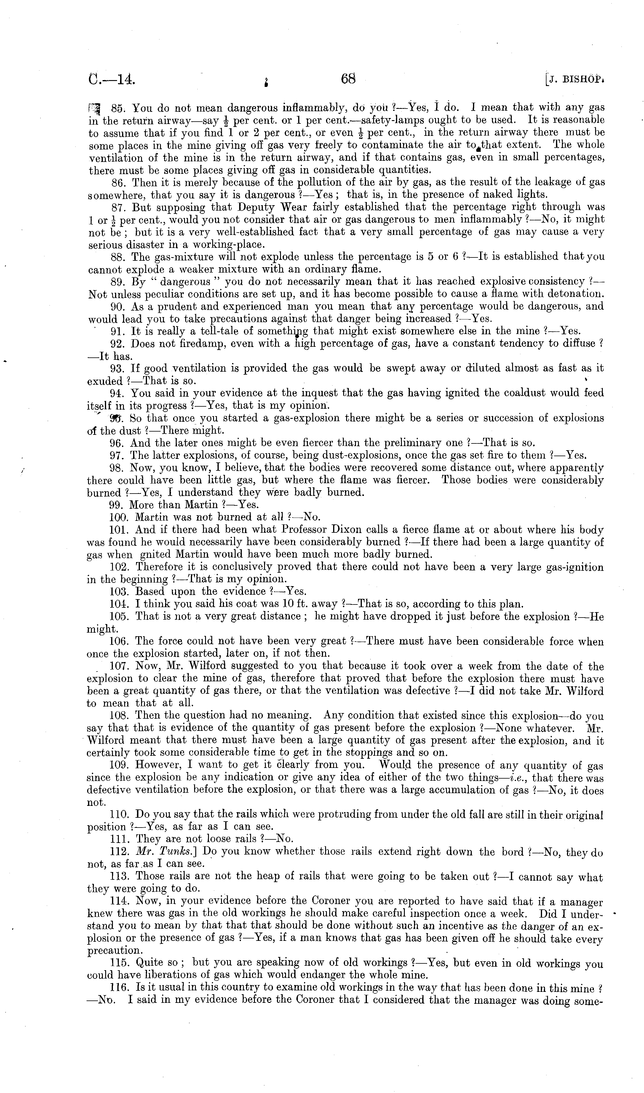 r*| 85. You do not mean dangerous inflammably, do you ?—Yes, I do. I mean that with any gas in the return airway—say f per cent, or 1 per cent. —safety-lamps ought to be used. It is reasonable to assume that if you find 1 or 2 per cent., or even \ per cent., in the return airway there must be some places in the mine giving off gas very freely to contaminate the air extent. The whole ventilation of the mine is in the return airway, and if that contains gas, even in small percentages, there must be some places giving off gas in considerable quantities. 86. Then it is merely because of the pollution of the air by gas, as the result of the leakage of gas somewhere, that you say it is dangerous ?—Yes ; that is, in the presence of naked lights. 87. But supposing that Deputy Wear fairly established that the percentage right through was 1 or \ per cent., would you not consider that air or gas dangerous to men inflammably ?—No, it might not be ; but it is a very well-established fact that a very small percentage of gas may cause a very serious disaster in a working-place. 88. The gas-mixture will not explode unless the percentage is 5 or 6 ?—lt is established that you cannot explode a weaker mixture with an ordinary flame. 89. By " dangerous " you do not necessarily mean that it has reached explosive consistency ?— Not unless peculiar conditions are set up, and it has become possible to cause a flame with detonation. 90. As a prudent and experienced man you mean that any percentage would be dangerous, and would lead you to take precautions against that danger being increased ?—Yes. 91. It is really a tell-tale of something that might exist somewhere else in the mine ?—Yes. 92. Does not firedamp, even with a high percentage of gas, have a constant tendency to diffuse ? —It has. 93. If good ventilation is provided the gas would be swept away or diluted almost as fast as it exuded ? —That is so. 94. You said in your evidence at the inquest that the gas having ignited the coaldust would feed itself in its progress ? —Yes, that is my opinion. 90. Bo that once you started a gas-explosion there might be a series or succession of explosions of the dust ? —There might. 96. And the later ones might be even fiercer than the preliminary one ? —That is so. 97. The latter explosions, of course, being dust-explosions, once the gas set fire to them ?—Yes. 98. Now, you know, I believe, that the bodies were recovered some distance out, where apparently there could have been little gas, but where the flame was fiercer. Those bodies were considerably burned ? —Yes, I understand they were badly burned. 99. More than Martin ?—Yes. 100. Martin was not burned at all ?—No. 101. And if there had been what Professor Dixon calls a fierce flame at or about where his body was found he would necessarily have been considerably burned ? —lf there had been a large quantity of gas when gnited Martin would have been much more badly burned. 102. Therefore it is conclusively proved that there could not have been a very large gas-ignition in the beginning ?—That is my opinion. 103. Based upon the evidence ? —Yes. 104. I think you said his coat was 10 ft. away ? —That is so, according to this plan. 105. That is not a very great distance ; he might have dropped it just before the explosion '{ —He might. 106. The force could not have been very great ?—There must have been considerable force when once the explosion started, later on, if not then. 107. Now, Mr. Wilford suggested to you that because it took over a week from the date of the explosion to clear the mine of gas, therefore that proved that before the explosion there must have been a great quantity of gas there, or that the ventilation was defective ? —I did not take Mr. Wilford to mean that at all. 108. Then the question had no meaning. Any condition that existed since this explosion—do you say that that is evidence of the quantity of gas present before the explosion ?—None whatever. Mr. Wilford meant that there must have been a large quantity of gas present after the explosion, and it certainly took some considerable time to get in the stoppings and so on. 109. However, I want to get it clearly from you. Would the presence of any quantity of gas since the explosion be any indication or give any idea of either of the two things— i.e., that there was defective ventilation before the explosion, or that there was a large accumulation of gas ?—No, it does not. 110. Do you say that the rails which were protruding from under the old fall are still in their original position ? —Yes, as far as I can see. 111. They are not loose rails ? —No. 112. Mr. Tunks.] Do you know whether those rails extend right down the bord ?—No, they do not, as far as I can see. 113. Those rails are not the heap of rails that were going to be taken out ? —I cannot say what they were going to do. 114. Now, in your evidence before the Coroner you are reported to have said that if a manager knew there was gas in the old workings he should make careful inspection once a week. Did I understand you to mean by that that that should be done without such an incentive as the danger of an explosion or the presence of gas ? —Yes, if a man knows that gas has been given off he should take every precaution. 115. Quite so ; but you are speaking now of old workings ? —Yes, but even in old workings you could have liberations of gas which would endanger the whole mine. 116. Is it usual in this country to examine old workings in the way that has been done in this mine ? —No. I said in my evidence before the Coroner that I considered that the manager was doing some-
