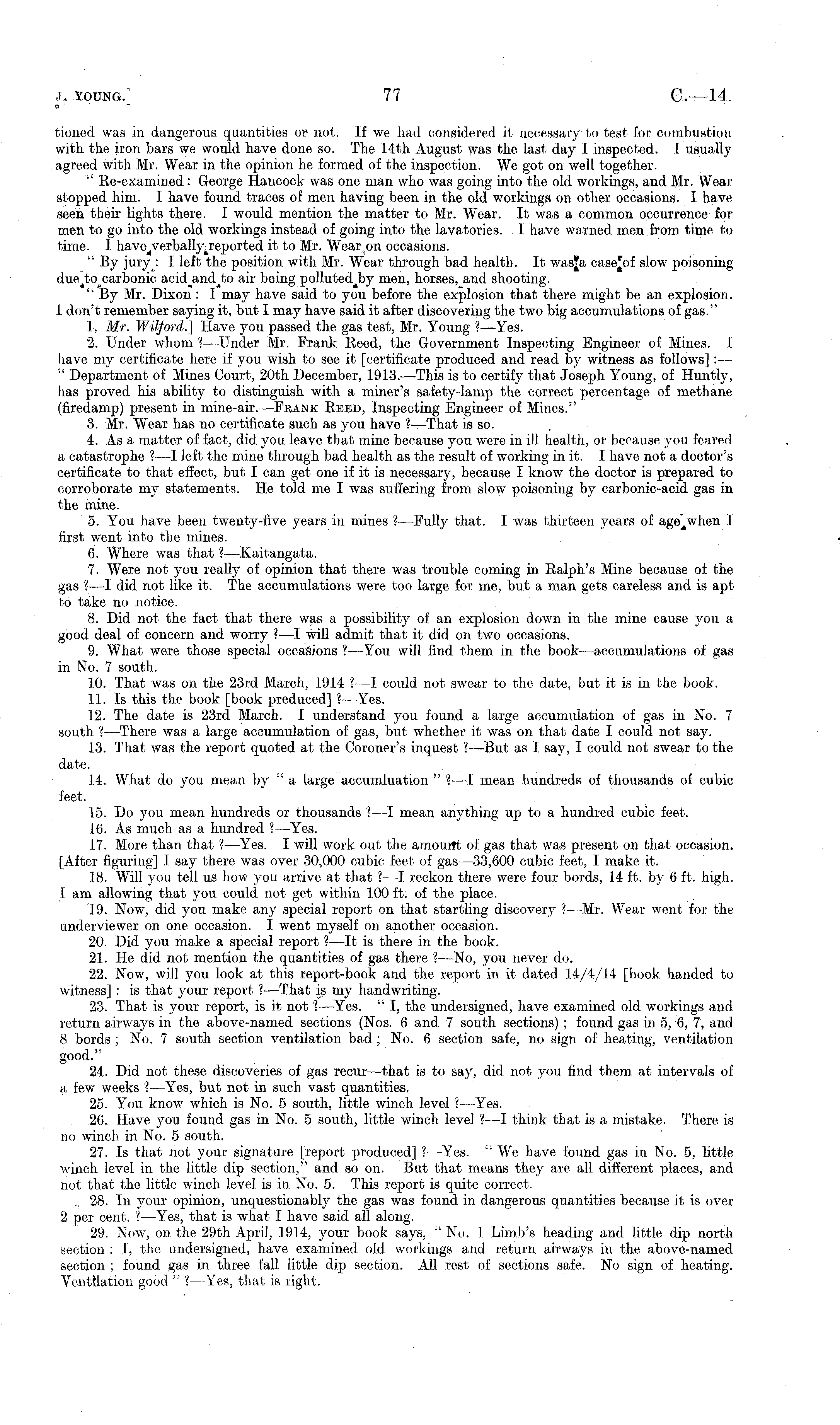 tioned was in dangerous quantities or not. If we Jiad considered it necessary to test for combustion with the iron bars we would have done so. The 14th August was the last day I inspected. I usually agreed with Mr. Wear in the opinion he formed of the inspection. We got on well together. " Re-examined: George Hancock was one man who was going into the old workings, and Mr. Wear stopped him. I have found traces of men having been in the old workings on other occasions. I have seen their lights there. I would mention the matter to Mr. Wear. It was a common occurrence for men to go into the old workings instead of going into the lavatories. I have warned men from time to time. I it to Mr. Wear on occasions. '" By jury : I left the position with Mr. Wear through bad health. It was|a case'of slow poisoning duetto carbonic air being pollutedjby men, horses, and shooting. " By Mr. Dixon : I may have said to you before the explosion that there might be an explosion. 1 don't remember saying it, but I may have said it after discovering the two big accumulations of gas." 1. Mr. Wilford.] Have you passed the gas test, Mr. Young ?—Yes. 2. Under whom ?—Under Mr. Prank Reed, the Government Inspecting Engineer of Mines. I have my certificate here if you wish to see it [certificate produced and read by witness as follows] :— " Department of Mines Court, 20th December, 1913.—This is to certify that Joseph Young, of Huntly, has proved his ability to distinguish with a miner's safety-lamp the correct percentage of methane (firedamp) present in mine-air.—Frank Reed, Inspecting Engineer of Mines." 3. Mr. Wear has no certificate such as you have ?—That is so. 4. As a matter of fact, did you leave that mine because you were in ill health, or because you feared a catastrophe ? —I left the mine through bad health as the result of working in it. I have not a doctor's certificate to that effect, but I can get one if it is necessary, because I know the doctor is prepared to corroborate my statements. He told me I was suffering from slow poisoning by carbonic-acid gas in the mine. 5. You have been twenty-five years in mines ?---Fully that. I was thirteen years of I first went into the mines. 6. Where was that ?—Kaitangata. 7. Were not you really of opinion that there was trouble coming in Ralph's Mine because of the gas ?—I did not like it. The accumulations were too large for me, but a man gets careless and is apt to take no notice. 8. Did not the fact that there was a possibility of an explosion down in the mine cause you a good deal of concern and worry ? —I will admit that it did on two occasions. 9. What were those special occasions ? —You will find them, in the book—accumulations of gas in No. 7 south. 10. That was on the 23rd March, 1914 ? —1 could not swear to the date, but it is in the book. 11. Is this the book [book preduced] ?—Yes. 12. The date is 23rd March. I understand you found a large accumulation of gas in No. 7 south ?—There was a large accumulation of gas, but whether it was on that date I could not say. 13. That was the report quoted at the Coroner's inquest ? —But as I say, I could not swear to the date. 14. What do you mean by " a large accumluation " ?—I mean hundreds of thousands of cubic feet. 15. Do you mean hundreds or thousands ? —I mean anything up to a hundred cubic feet. 16. As much as a hundred ?—Yes. 17. More than that ? —Yes. I will work out the amount of gas that was present on that occasion. [After figuring] I say there was over 30,000 cubic feet of gas —33,600 cubic feet, I make it. 18. Will you tell us how you arrive at that ? —1 reckon there were four bords, 14 ft. by 6 ft. high. 1 am allowing that you could not get within 100 ft. of the place. 19. Now, did you make any special report on that startling discovery ? —Mr. Wear went for the underviewer on one occasion. I went myself on another occasion. 20. Did you make a special report ?—lt is there in the book. 21. He did not mention the quantities of gas there ? —No, you never do. 22. Now, will you look at this report-book and the report in it dated 14/4/14 [book handed to witness] : is that your report ?—That is my handwriting. 23. That is your report, is it not ? —Yes. " I, the undersigned, have examined old workings and return airways in the above-named sections (Nos. 6 and 7 south sections); found gas in 5, 6, 7, and 8 bords ; No. 7 south section ventilation bad ; No. 6 section safe, no sign of heating, ventilation good." 24. Did not these discoveries of gas recur —that is to say, did not you find them at intervals of a few weeks I—Yes,1 —Yes, but not in such vast quantities. 25. You know which is No. 5 south, little winch level I—Yes.1 —Yes. 26. Have you found gas in No. 5 south, little winch level ?—I think that is a mistake. There is no winch in No. 5 south. 27. Is that not your signature [report produced] ? —Yes. " We have found gas in No. 5, little winch level in the little dip section," and so on. But that means they are all different places, and not that the little winch level is in No. 5. This report is quite correct. ... 28. In your opinion, unquestionably the gas was found in dangerous quantities because it is over 2 per cent. ?—Yes, that is what I have said all along. 29. Now, on the 29th April, 1914, your book says, " No. 1. Limb's heading and little dip north section : 1, the undersigned, have examined old workings and return airways in the above-named section ; found gas in three fall little dip section. All rest of sections safe. No sign of heating. Ventilation good " ? —Yes, that is right.