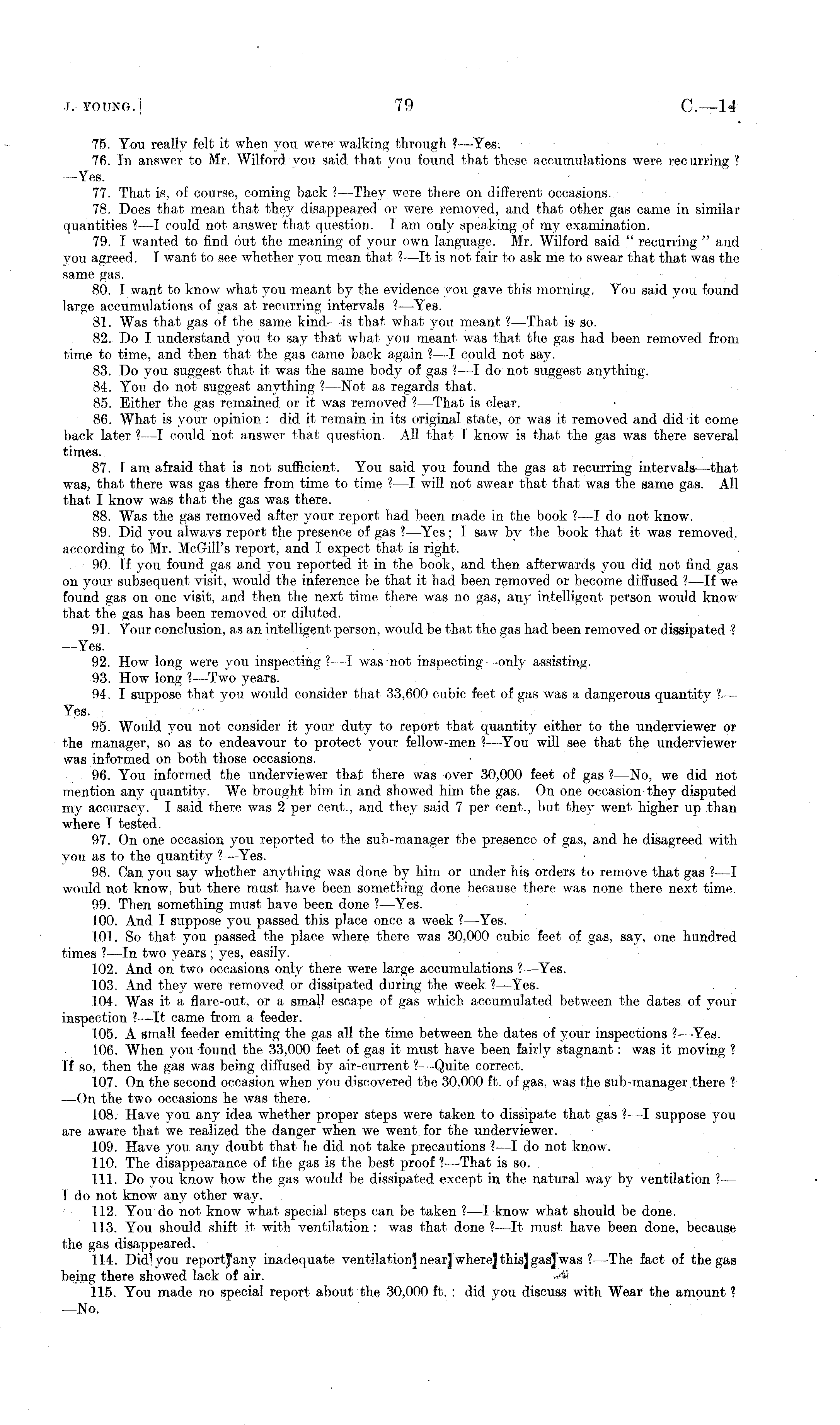 75. You really felt it when yon were walking through ? —Yes. 76. In answer to Mr. Wilford you said that you found that these accumulations were recurring ? -Yes. 77. That is, of course, coming back ? —They were there on different occasions. 78. Does that mean that they disappeared or were removed, and that other gas came in similar quantities ? —T could not answer that question. lam only speaking of my examination. 79. I wanted to find out the meaning of your own language. Mr. Wilford said " recurring " and you agreed. I want to see whether you mean that ?—lt is not fair to ask me to swear that that was the same gas. 80. I want to know what you meant by the evidence you gave this morning. You said you found large accumulations of gas at recurring intervals ?—Yes. 81. Was that gas of the same kind—is that what you meant ?—That is so. 82. Do I understand you to say that what you meant was that the gas had been removed from time to time, and then that the gas came back again ?—I could not say. 83. Do you suggest that it was the same body of gas ?—I do not suggest anything. 84.. You do not suggest anything ?—Not as regards that. 85. Either the gas remained or it was removed ?—That is clear. 86. What is your opinion : did it remain in its original state, or was it removed and did it come back later ?-—T could not answer that question. All that I know is that the gas was there several times. 87. lam afraid that is not sufficient. You said you found the gas at recurring intervals—that was, that there was gas there from time to time ?-—I will not swear that that was the same gas. All that I know was that the gas was there. 88. Was the gas removed after your report had been made in the book ?—I do not know. 89. Did you always report the presence of gas ?—Yes; I saw by the book that it was removed, according to Mr. McGill's report, and I expect that is right. 90. If you found gas and you reported it in the book, and then afterwards you did not find gas on your subsequent visit, would the inference be that it had been removed or become diffused ?—lf we found gas on one visit, and then the next time there was no gas, any intelligent person would know that the gas has been removed or diluted. 91. Your conclusion, as an intelligent person, would be that the gas had been removed or dissipated ■? Yes. 92. How long were you inspecting ?—I was not inspecting-—only assisting. 93. How long ?—Two years. 94. I suppose that you would consider that 33,600 cubic feet of gas was a dangerous quantity ?.— Yes. 95. Would you not consider it your duty to report that quantity either to the underviewer or the manager, so as to endeavour to protect your fellow-men ?—You will see that the underviewer was informed on both those occasions. 96. You informed the underviewer that there was over 30,000 feet of gas ?—No, we did not mention an} r quantity. We brought him in and showed him the gas. On one occasion they disputed my accuracy. T said there was 2 per cent., and they said 7 per cent., but they went higher up than where I tested. 97. On one occasion you reported to the sub-manager the presence of gas, and he disagreed with you as to the quantity ?—Yes. 98. Can you say whether anything was done by him or under his orders to remove that gas ?—I would not know, but there must have been something done because there was none there next time. 99. Then something must have been done ?—Yes. 100. And I suppose you passed this place once a week ?—Yes. 101. So that you passed the place where there was 30,000 cubic feet of gas, say, one hundred times ?—ln two years; yes, easily. 102. And on two occasions only there were large accumulations ?—Yes. 103. And they were removed or dissipated during the week ?—Yes. 104. Was it a flare-out, or a small escape of gas which accumulated between the dates of your inspection ?—lt came from a feeder. 105. A small feeder emitting the gas all the time between the dates of your inspections ?—Yes. 106. When you found the 33,000 feet of gas it must have been fairly stagnant: was it moving ? If so, then the gas was being diffused by air-current ?—Quite correct. 107. On the second occasion when you discovered the 30,000 ft. of gas, was the sub-manager there ? —On the two occasions he was there. 108. Have you any idea whether proper steps were taken to dissipate that gas ?—I suppose you are aware that we realized the danger when we went for the underviewer. 109. Have you any doubt that he did not take precautions ?—I do not know. 1.10. The disappearance of the gas is the best proof ?—That is so. 111. Do you know how the gas would be dissipated except in the natural way by ventilation ?— T do not know any other way. 112. You do not know what special steps can be taken ?—I know what should be done. 113. You should shift it with ventilation : was that done ?—lt must have been done, because the gas disappeared. 114. Didiyou reportjany inadequate ventilation] near] wherej thisj gas] was ?- -The fact of the gas being there showed lack of air. 115. You made no special report about the 30,000 ft. : did you discuss with Wear the amount ? —No,