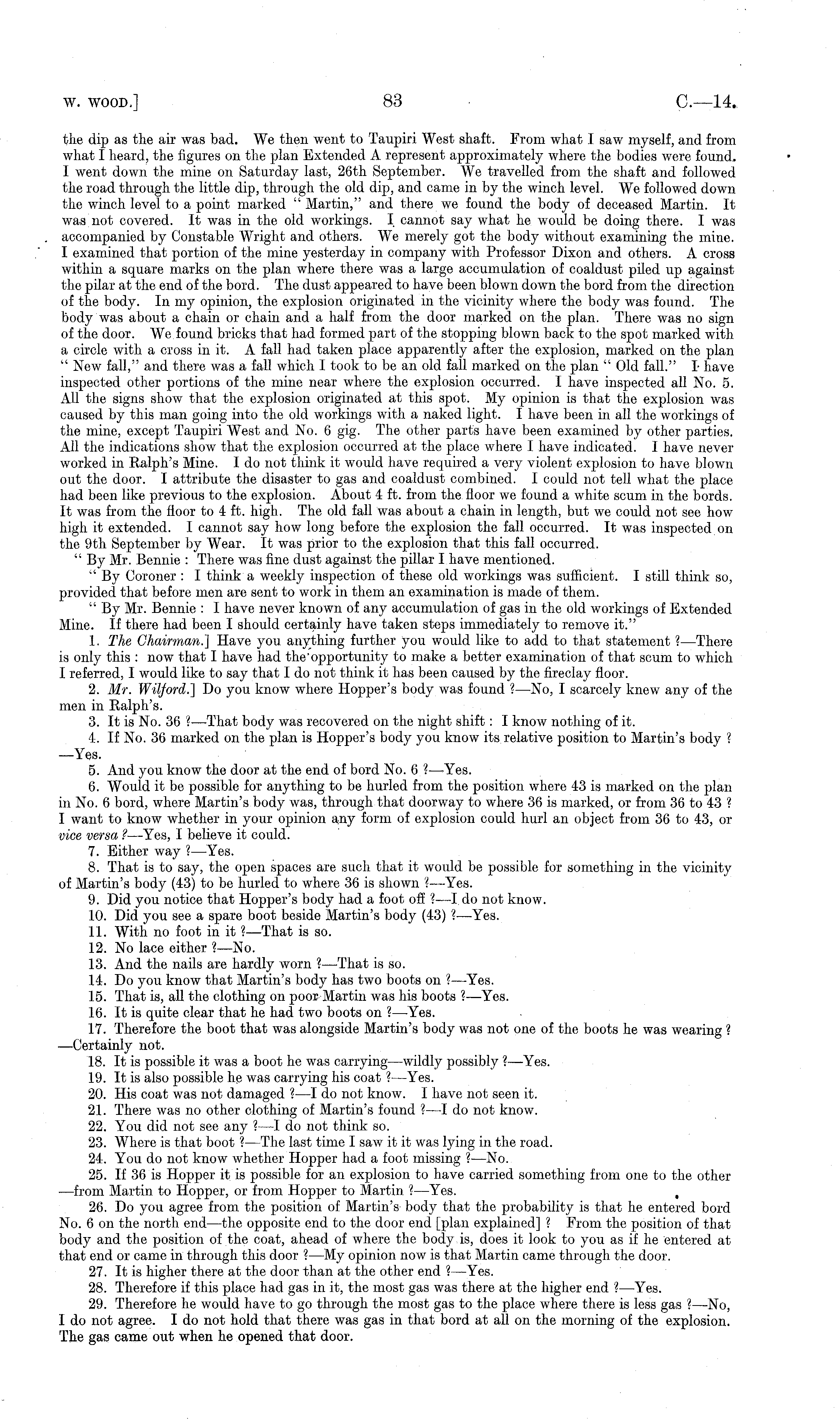 tlie dip as the air was bad. We then went to Taupiri West shaft. From what I saw myself, and from what I heard, the figures on the plan Extended A represent approximately where the bodies were found. I went down the mine on Saturday last, 26th September. We travelled from the shaft and followed the road through the little dip, through the old dip, and came in by the winch level. We followed down the winch level to a point marked " Martin," and there we found the body of deceased Martin. It was not covered. It was in the old workings. I cannot say what he would be doing there. I was accompanied by Constable Wright and others. We merely got the body without examining the mine. I examined that portion of the mine yesterday in company with Professor Dixon and others. A cross within a square marks on the plan where there was a large accumulation of coaldust piled up against the pilar at the end of the bord. The dust appeared to have been blown down the bord from the direction of the body. In my opinion, the explosion originated in the vicinity where the body was found. The body was about a chain or chain and a half from the door marked on the plan. There was no sign of the door. We found bricks that had formed part of the stopping blown back to the spot marked with a circle with a cross in it. A fall had taken place apparently after the explosion, marked on the plan " New fall," and there was a fall which I took to be an old fall marked on the plan " Old fall." I have inspected other portions of the mine near where the explosion occurred. I have inspected all No. 5. All the signs show that the explosion originated at this spot. My opinion is that the explosion was caused by this man going into the old workings with a naked light. I have been in all the workings of the mine, except Taupiri West and No. 6 gig. The other parts have been examined by other parties. All the indications show that the explosion occurred at the place where I have indicated. I have never worked in Ralph's Mine. Ido not think it would have required a very violent explosion to have blown out the door. I attribute the disaster to gas and coaldust combined. I could not tell what the place had been like previous to the explosion. About 4 ft. from the floor we found a white scum in the bords. It was from the floor to 4 ft. high. The old fall was about a chain in length, but we could not see how high it extended. I cannot say how long before the explosion the fall occurred. It was inspected on the 9th September by Wear. It was prior to the explosion that this fall occurred. "By Mr. Bennie : There was fine dust against the pillar I have mentioned. "By Coroner : I think a weekly inspection of these old workings was sufficient. I still think so, provided that before men are sent to work in them an examination is made of them. " By Mr. Bennie : I have never known of any accumulation of gas in the old workings of Extended Mine. If there had been I should certainly have taken steps immediately to remove it." 1. The Chairman.] Have you anything further you would like to add to that statement ?—There is only this : now that I have had the opportunity to make a better examination of that scum to which I referred, I would like to say that I do not think it has been caused by the fireclay floor. 2. Mr. Wilford.] Do you know where Hopper's body was found ?—No, I scarcely knew any of the men in Ealph's. 3. It is No. 36 ?—That body was recovered on the night shift: I know nothing of it. ■I. If No. 36 marked on the plan is Hopper's body you know its relative position to Martin's body ? —Yes. 5. And you know the door at the end of bord No. 6 ?—Yes. 6. Would it be possible for anything to be hurled from the position where 43 is marked on the plan in No. 6 bord, where Martin's body was, through that doorway to where 36 is marked, or from 36 to 43 ? I want to know whether in your opinion any form of explosion could hurl an object from 36 to 43, or vice versa ? —Yes, I believe it could. 7. Either way ?—Yes. 8. That is to say, the open spaces are such that it would be possible for something in the vicinity of Martin's body (43) to be hurled to where 36 is shown ?—Yes. 9. Did you notice that Hopper's body had a foot off % —I do not know. 10. Did you see a spare boot beside Martin's body (43) ?—Yes. 11. With no foot in it ?—That is so. 12. No lace either ?—-No. 13. And the nails are hardly worn ?—That is so. 14. Do you know that Martin's body has two boots on ?—Yes. 15. That is, all the clothing on poor Martin was his boots ?—Yes. 16. It is quite clear that he had two boots on ?—Yes. 17. Therefore the boot that was alongside Martin's body was not one of the boots he was wearing ? —Certainly not. 18. It is possible it was a boot he was carrying—wildly possibly ?—Yes. 19. It is also possible he was carrying his coat ? —Yes. 20. His coat was not damaged ? —I do not know. I have not seen it. 21. There was no other clothing of Martin's found ? —I do not know. 22. You did not see any ? —I do not think so. 23. Where is that boot ? —The last time I saw it it was lying in the road. 24. You do not know whether Hopper had a foot missing ?—No. 25. If 36 is Hopper it is possible for an explosion to have carried something from one to the other —from Martin to Hopper, or from Hopper to Martin ?—Yes. % 26. Do you agree from the position of Martin's body that the probability is that he entered bord No. 6on the north end —the opposite end to the door end [plan explained] ? From the position of that body and the position of the coat, ahead of where the body is, does it look to you as if he entered at that end or came in through this door ?—My opinion now is that Martin came through the door. 27. It is higher there at the door than at the other end ? —Yes. 28. Therefore if this place had gas in it, the most gas was there at the higher end ?—Yes. 29. Therefore he would have to go through the most gas to th