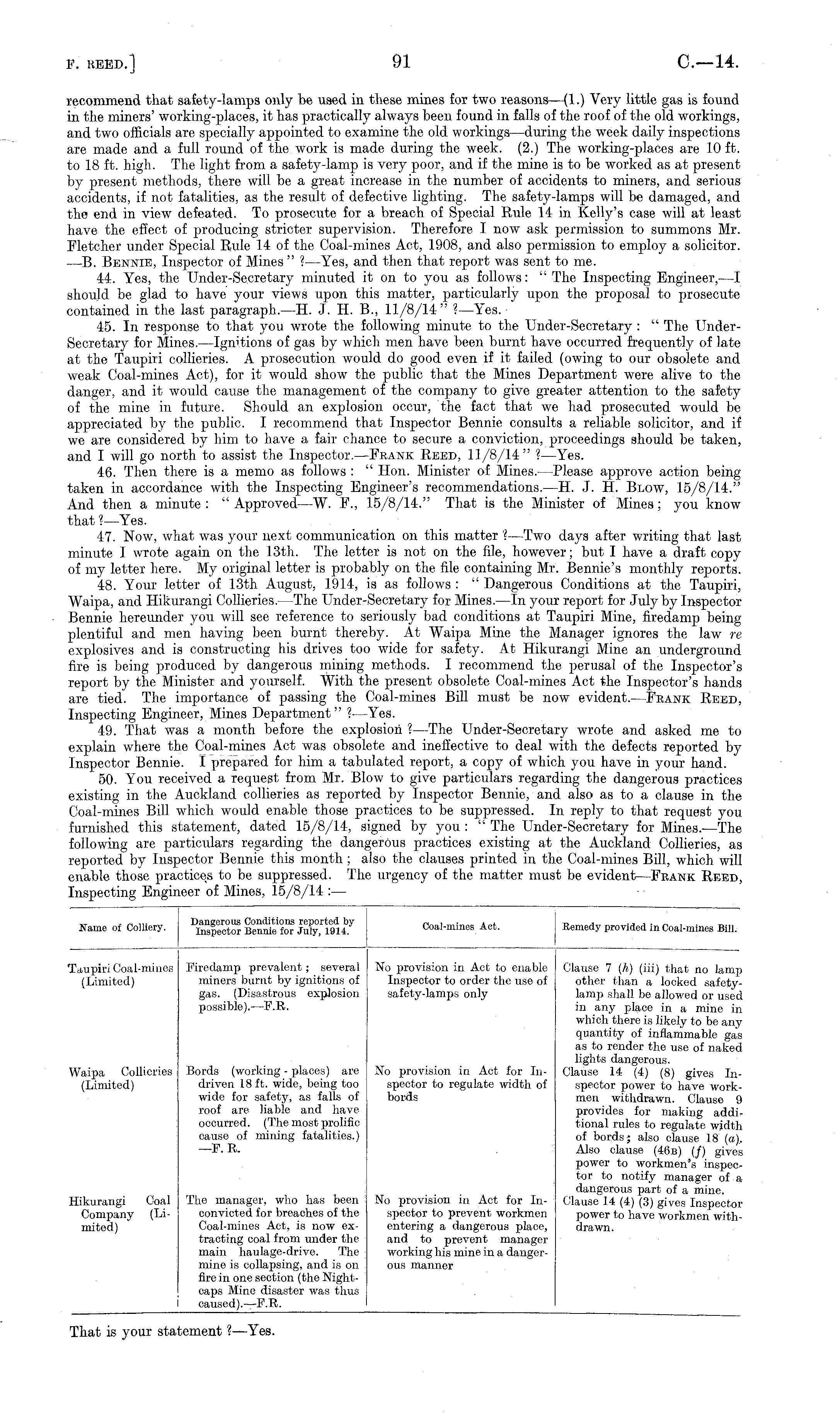 recommend that safety-lamps only be used in these mines for two reasons—(l.) Very little gas is found in the miners' working-places, it has practically always been found in falls of the roof of the old workings, and two officials are specially appointed to examine the old workings —during the week daily inspections are made and a full round of the work is made during the week. (2.) The working-places are 10 ft. to 18 ft. high. The light from a safety-lamp is very poor, and if the. mine is to be worked as at present by present methods, there will be a great increase in the number of accidents to miners, and serious accidents, if not fatalities, as the result of defective lighting. The safety-lamps will be damaged, and the end in view defeated. To prosecute for a breach of Special Rule 14 in Kelly's case will at least have the effect of producing stricter supervision. Therefore I now ask permission to summons Mr. Fletcher under Special Rule 14 of the Coal-mines Act, 1908, and also permission to employ a solicitor. —B. Bennie, Inspector of Mines " ? —Yes, and then that report was sent to me. 44. Yes, the Under-Secretary minuted it on to you as follows: " The Inspecting Engineer,—l should be glad to have your views upon this matter, particularly upon the proposal to prosecute contained in the last paragraph.—H. J. H. 8., 11/8/14" ?—Yes. 45. In response to that you wrote the following minute to the Under-Secretary : " The Undersecretary for Mines.—lgnitions of gas by which men have been burnt have occurred frequently of late at the Taupiri collieries. A prosecution would do good even if it failed (owing to our obsolete and weak Coal-mines Act), for it would show the public that the Mines Department were alive to the danger, and it would cause the management of the company to give greater attention to the safety of the mine in future. Should an explosion occur, the fact that we had prosecuted would be appreciated by the public. I recommend that Inspector Bennie consults a reliable solicitor, and if we are considered by him to have a fair chance to secure a conviction, proceedings should be taken, and I will go north to assist the Inspector.—Frank Reed, 11/8/14" ?—Yes. 46. Then there is a memo as follows : " Hon. Minister of Mines.—Please approve action being taken in accordance with the Inspecting Engineer's recommendations.—H. J. H. Blow, 15/8/14." And then a minute : " Approved—W. F., 15/8/14." That is the Minister of Mines ; you know that ?— Yes. 47. Now, what was your next communication on this matter ?—Two days after writing that last minute I wrote again on the 13th. The letter is not on the file, however; but I have a draft copy of my letter here. My original letter is probably on the file containing Mr. Bennies monthly reports. 48. Your letter of 13th August, 1914, is as follows : " Dangerous Conditions at the Taupiri, Waipa, and Hikurangi Collieries.—The Under-Secretary for Mines.—ln your report for July by Inspector Bennie hereunder you will see reference to seriously bad conditions at Taupiri Mine, firedamp being plentiful and men having been burnt thereby. At Waipa Mine the Manager ignores the law re explosives and is constructing his drives too wide for safety. At Hikurangi Mine an underground fire is being produced by dangerous mining methods. I recommend the perusal of the Inspector's report by the Minister and yourself. With the present obsolete Coal-mines Act the Inspector's hands are tied. The importance of passing the Coal-mines Bill must be now evident.—Frank Reed, Inspecting Engineer, Mines Department" ?—Yes. 49. That was a month before the explosion ?—The Under-Secretary wrote and asked me to explain where the Coal-mines Act was obsolete and ineffective to deal with the defects reported by Inspector Bennie. I prepared for him a tabulated report, a copy of which you have in your hand. 50. You received a request from Mr. Blow to give particulars regarding the dangerous practices existing in the Auckland collieries as reported by Inspector Bennie, and also as to a clause in the Coal-mines Bill which would enable those practices to be suppressed. In reply to that request you furnished this statement, dated 15/8/14, signed by you : " The Under-Secretary for Mines.—The following are particulars regarding the dangerous practices existing at the Auckland Collieries, as reported by Inspector Bennie this month ; also the clauses printed in the Coal-mines Bill, which will enable those practices to be suppressed. The urgency of the matter must be evident—Frank Reed, Inspecting Engineer of Mines, 15/8/14 : —