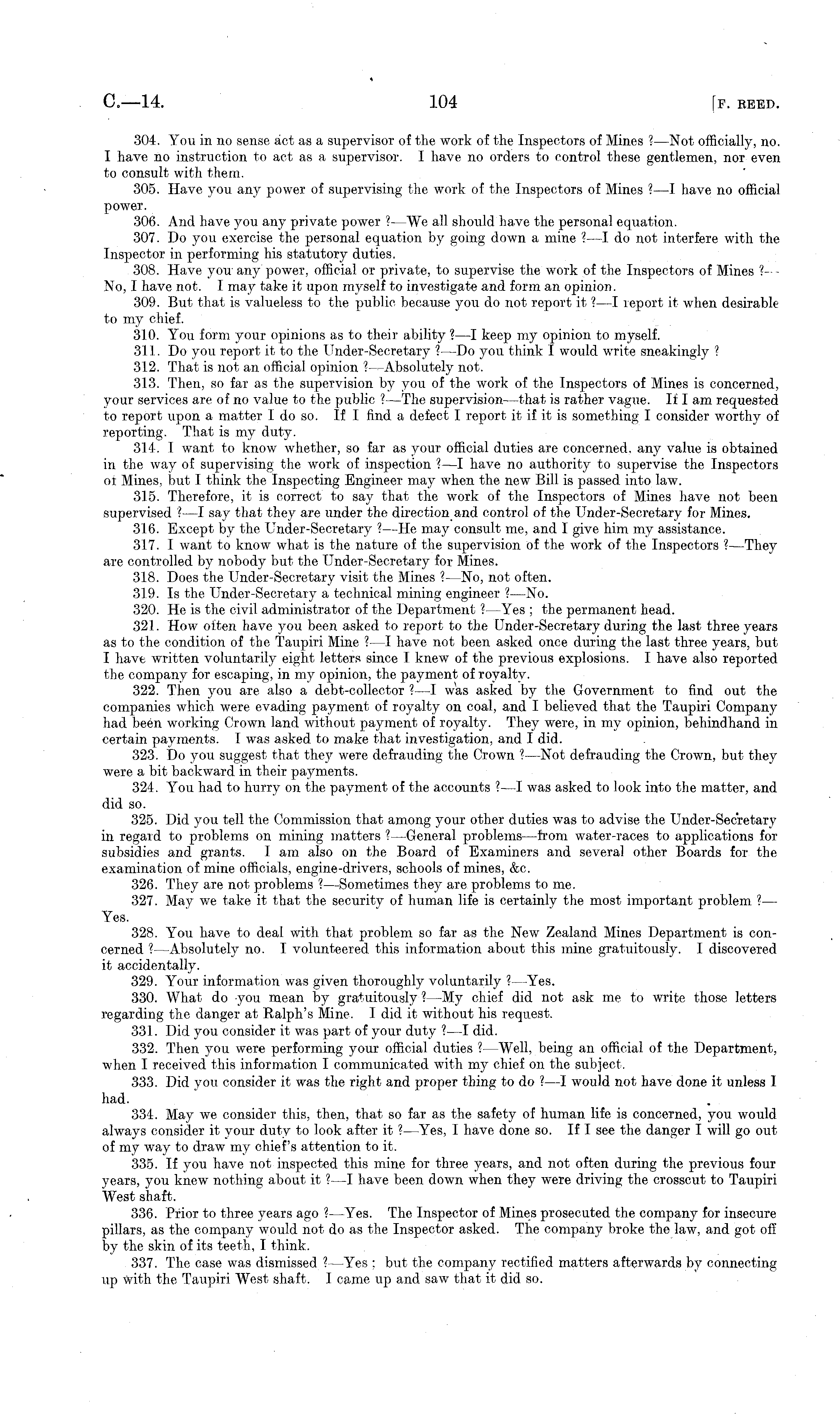 304. You in no sense act as a supervisor of the work of the Inspectors of Mines ?—Not officially, no. I have no instruction to act as a supervisor. I have no orders to control these gentlemen, nor even to consult with them. 305. Have you any power of supervising the work of the Inspectors of Mines ?—I have no official power. 306. And have you any private power ?—We all should have the personal equation. 307. Do you exercise the personal equation by going down a mine ?—I do not interfere with the Inspector in performing his statutory duties. 308. Have you any power, official or private, to supervise the work of the Inspectors of Mines ?-- No, I have not. I may take it upon myself to investigate and form an opinion. 309. But that is valueless to the public because you do not report it ?—I report it when desirable to my chief. 310. You form your opinions as to their ability ?—I keep my opinion to myself. 311. Do you report it to the Under-Secretary ?—Do you think I would write sneakingly ? 312. That is not an official opinion ?—Absolutely not. 313. Then, so far as the supervision by you of the work of the Inspectors of Mines is concerned, your services are of no value to the public ?—The supervision—that is rather vague. If lam requested to report upon a matter Ido so. If I find a defect I report it if it is something I consider worthy of reporting. That is my duty. 314. I want to know whether, so far as your official duties are concerned, any value is obtained in the way of supervising the work of inspection ?—I have no authority to supervise the Inspectors of Mines, but I think the Inspecting Engineer may when the new Bill is passed into law. 315. Therefore, it is correct to say that the work of the Inspectors of Mines have not been supervised ?—I say that they are under the direction and control of the Under-Secretary for Mines. 316. Except by the Under-Secretary ?— -He may consult me, and I give him my assistance. 317. I want to know what is the nature of the supervision of the work of the Inspectors ?—They are controlled by nobody but the Under-Secretary for Mines. 318. Does the Under-Secretary visit the Mines ?—No, not often. 319. Is the Under-Secretary a technical mining engineer ?—No. 320. He is the civil administrator of the Department ?—Yes ; the permanent head. 321. How often have you been asked to report to the Under-Secretary during the last three years as to the condition of the Taupiri Mine ?—I have not been asked once during the last three years, but I have written voluntarily eight letters since I knew of the previous explosions. I have also reported the company for escaping, in my opinion, the payment of royalty. 322. Then you are also a debt-collector ?—I was asked by the Government to find out the companies which were evading payment of royalty on coal, and I believed that the Taupiri Company had been working Crown land without payment of royalty. They were, in my opinion, behindhand in certain payments. I was asked to make that investigation, and I did. 323. Do you suggest that they were defrauding the Crown ?—Not defrauding the Crown, but they were a bit backward in their payments. 324. You had to hurry on the payment of the accounts ?—I was asked to look into the matter, and did so. 325. Did you tell the Commission that among your other duties was to advise the Under-Secretary in regard to problems on mining matters ?—General problems—from water-races to applications for subsidies and grants. lam also on the Board of Examiners and several other Boards for the examination of mine officials, engine-drivers, schools of mines, &c. 326. They are not problems ?—Sometimes they are problems to me. 327. May we take it that the security of human life is certainly the most important problem ?— Yes. 328. You have to deal with that problem so far as the New Zealand Mines Department is concerned ?—Absolutely no. I volunteered this information about this mine gratuitously. I discovered it accidentally. 329. Your information was given thoroughly voluntarily I —Yes. 330. What do you mean by gratuitously ?—My chief did not ask me to write those letters regarding the danger at Ralph's Mine. I did it without his request. 331. Did you consider it was part of your duty ?—I did. 332. Then you were performing your official duties ?—Well, being an official of the Department, when I received this information I communicated with my chief on the subject. 333. Did you consider it was the right and proper thing to do ?—I would not have done it unless I had. 334. May we consider this, then, that so far as the safety of human life is concerned, you would always consider it your duty to look after it ?—Yes, I have done so. If I see the danger I will go out of my way to draw my chief's attention to it. 335. If you have not inspected this mine for three years, and not often during the previous four years, you knew nothing about it ?—I have been down when they were driving the crosscut to Taupiri West shaft. 336. Prior to three years ago ?—Yes. The Inspector of Mines prosecuted the company for insecure pillars, as the company would not do as the Inspector asked. The company broke the law, and got off by the skin of its teeth, I think. 337. The case was dismissed ?—Yes ; but the company rectified matters afterwards by connecting up with the Taupiri West shaft. I came up and saw that it did so.