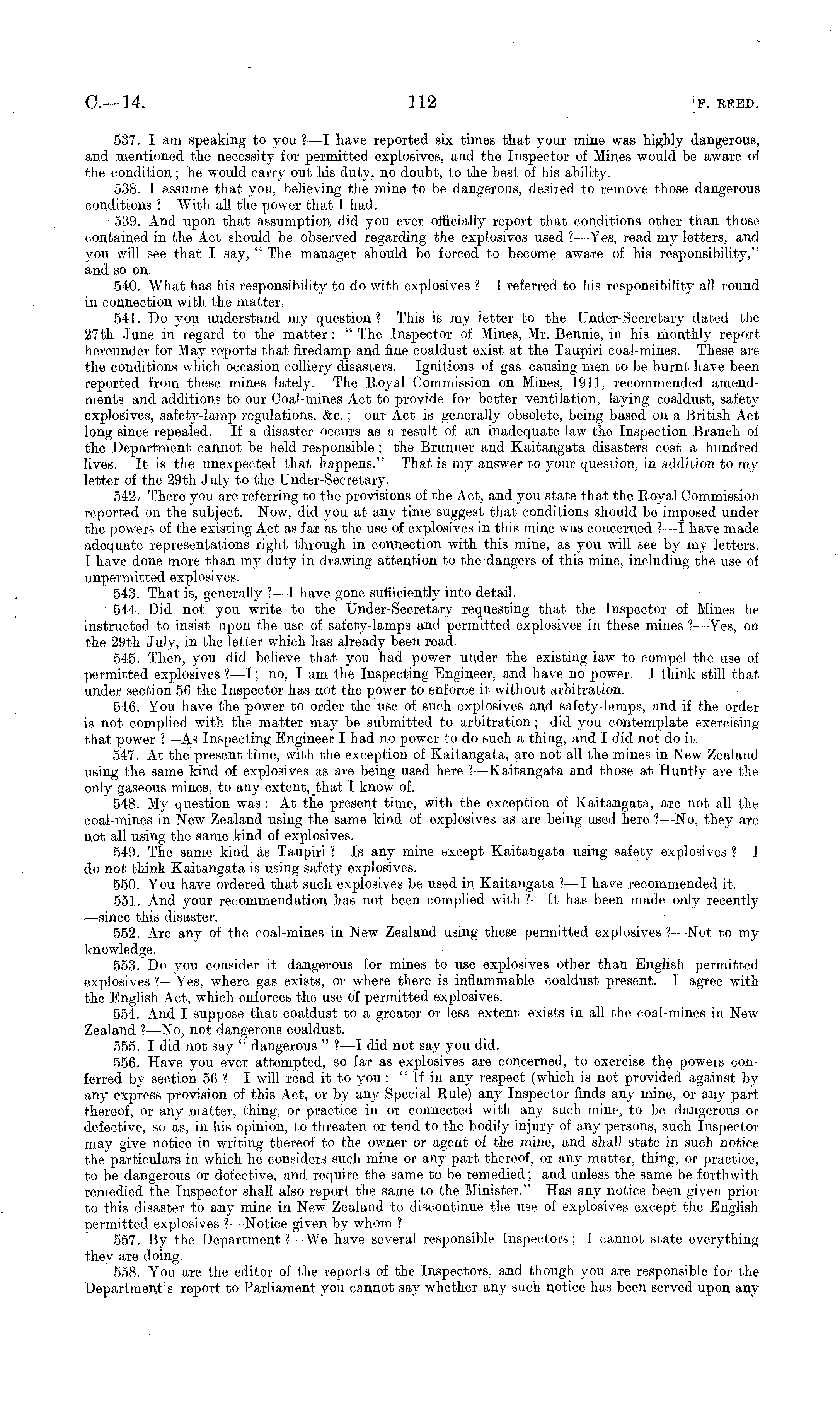 537. I am speaking to you ?—I have reported six times that your mine was highly dangerous, and mentioned the necessity for permitted explosives, and the Inspector of Mines would be aware of the condition.; he would carry out his duty, no doubt, to the best of his ability. 538. I assume that you, believing the mine to be dangerous, desired to remove those dangerous conditions ?— With all the power that I had. 539. And upon that assumption did you ever officially report that conditions other than those contained in the Act should be observed regarding the explosives used ?— Yes, read my letters, and you will see that I say, " The manager should be forced to become aware of his responsibility," and so on. 540. What has his responsibility to do with explosives ?—I referred to his responsibility all round in connection with the matter, 541. Do you understand my question ?—This is my letter to the Under-Secretary dated the 27th June in regard to the matter : " The Inspector of Mines, Mr. Bennie, in his monthly report hereunder for May reports that firedamp and fine coaldust exist at the Taupiri coal-mines. These are. the conditions which occasion colliery disasters. Ignitions of gas causing men to be burnt have been reported from these mines lately. The Royal Commission on Mines, 1911, recommended amendments and additions to our Coal-mines Act to provide for better ventilation, laying coaldust, safety explosives, safety-lamp regulations, &c.; our Act is generally obsolete, being based on a British Act long since repealed. If a disaster occurs as a result of an inadequate law the Inspection Branch of the Department cannot be held responsible; the Brunner and Kaitangata disasters cost a hundred lives. It is the unexpected that happens." That is my answer to your question, in addition to my letter of the 29th July to the Under-Secretary. 542.. There you are referring to the provisions of the Act, and you state that the Royal Commission reported on the subject. Now, did you at any time suggest that conditions should be imposed under the powers of the existing Act as far as the use of explosives in this mine was concerned ?- -I have made adequate representations right through in connection with this mine, as you will see by my letters. f have done more than my duty in drawing attention to the dangers of this mine, including the use of unpermitted explosives. 543. That is, generally ?—I have gone into detail. 544. Did not you write to the Under-Secretary requesting that the Inspector of Mines be instructed to insist upon the use of safety-lamps and permitted explosives in these mines ? Yes, on the 29th July, in the letter which has already been read. 545. Then, you did believe that you had power under the existing law to compel the use of permitted explosives ?—I; no, lam the Inspecting Engineer, and have no power. I think still that under section 56 the Inspector has not the power to enforce it without arbitration. 546. You have the power to order the use of such explosives and safety-lamps, and if the order is not complied with the matter may be submitted to arbitration; did you contemplate exercising that power ? ■— As Inspecting Engineer I had no power to do such a thing, and I did not do it. 547. At the present time, with the exception of Kaitangata, are not all the mines in New Zealand using the same kind of explosives as are being used here ? —Kaitangata and those at Huntly are the only gaseous mines, to any extent, _that I know of. 548. My question was : At the present time, with the exception of Kaitangata, are not all the coal-mines in New Zealand using the same kind of explosives as are being used here ?- No, they are not all using the same kind of explosives. 549. The same kind as Taupiri ? Is any mine except Kaitangata using safety explosives ? —] do not think Kaitangata is using safety explosives. 550. You have ordered that such explosives be used in Kaitangata ?—I have recommended it. 551. And your recommendation has not been complied with ? —lt has been made only recently —since this disaster. 552. Are any of the ooal-mines in New Zealand using these permitted explosives ?— -Not to my knowledge. 553. Do you consider it dangerous for mines to use explosives other than English permitted explosives ?—Yes, where gas exists, or where there is inflammable coaldust present. I agree with the English Act, which enforces the use of permitted explosives. 554. And I suppose that coaldust to a greater or less extent exists in all the coal-mines in New Zealand ?—No, not dangerous coaldust. 555. I did not say " dangerous " ? —I did not say you did. 556. Have you ever attempted, so far as explosives are concerned, to exercise the powers conferred by section 56 ? I will read it to you :"If in any respect (which is not provided against by any express provision of this Act, or by any Special Rule) any Inspector finds any mine, or any part thereof, or any matter, thing, or practice in or connected with any such mine, to be dangerous or defective, so as, in his opinion, to threaten or tend to the bodily injury of any persons, such Inspector may give notice in writing thereof to the owner or agent of the mine, and shall state in such notice the particulars in which he considers such mine or any part thereof, or any matter, thing, or practice, to be dangerous or defective, and require the same to be remedied; and unless the same be forthwith remedied the Inspector shall also report the same to the Minister." Has any notice been given prior to this disaster to any mine in New Zealand to discontinue the use of explosives except the English permitted explosives '---Notice given by whom ? 557. By the Department? —We have several responsible Inspectors; I cannot state everything they are doing. 558. You are the editor of the reports of the Inspectors, and though you are responsible for the Department's report to Parliament you caunot say whether any such notice has been ser