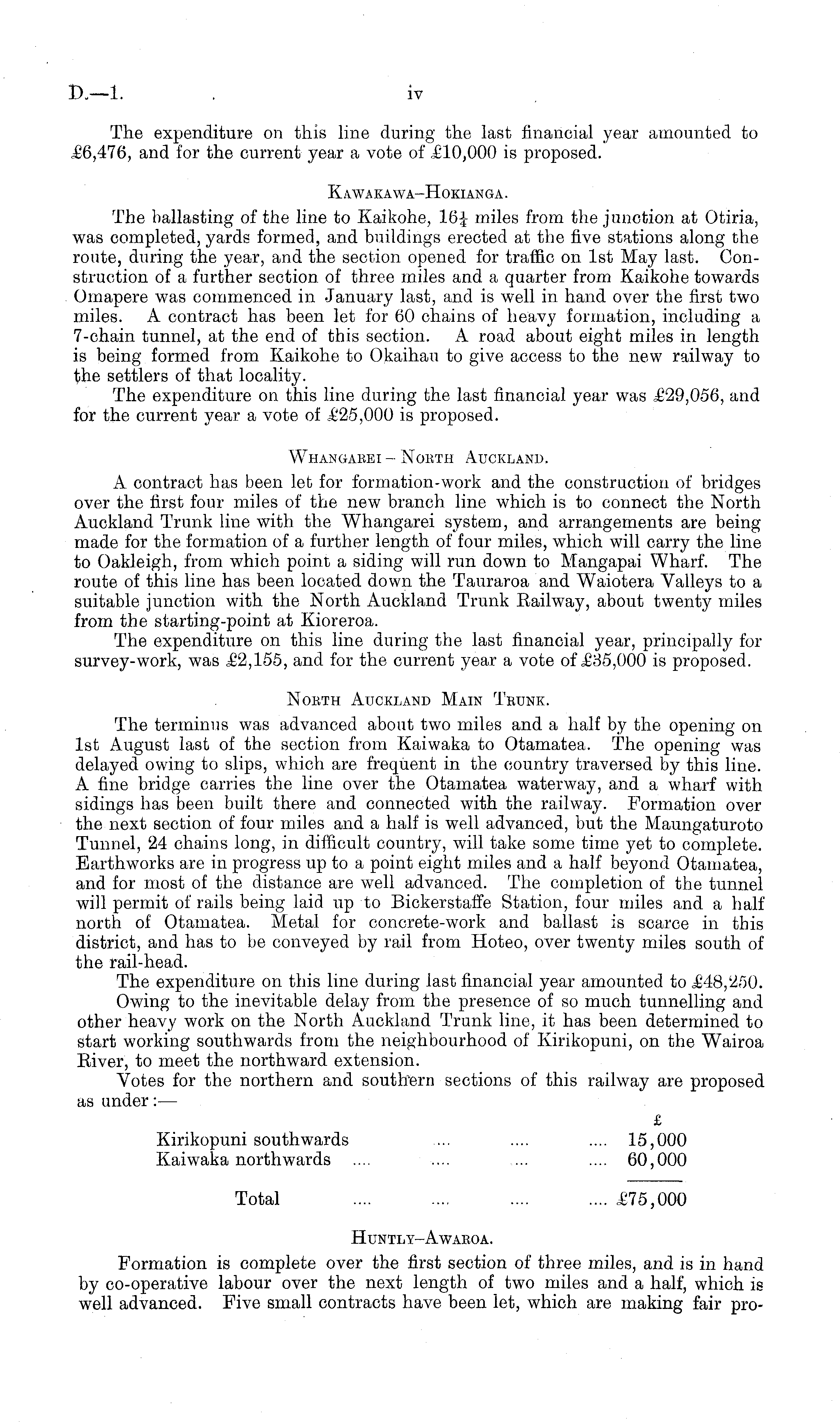 The expenditure on this line during the last financial year amounted to £6,476, and for the current year a vote of £10,000 is proposed. Kawakawa-Hokianga. The ballasting of the line to Kaikohe, 16 J miles from the junction at Otiria, was completed, yards formed, and buildings erected at the five stations along the route, during the year, and the section opened for traffic on Ist May last. Construction of a further section of three miles and a quarter from Kaikohe towards Omapere was commenced in January last, and is well in hand over the first two miles. A contract has been let for 60 chains of heavy formation, including a 7-chain tunnel, at the end of this section. A road about eight miles in length is being formed from Kaikohe to Okaihau to give access to the new railway to the settlers of that locality. The expenditure on this line during the last financial year was £29,056, and for the current year a vote of £25,000 is proposed. Whangabei - North Auckland. A contract has been let for formation-work and the construction of bridges over the first four miles of the new branch line which is to connect the North Auckland Trunk line with the Whangarei system, and arrangements are being made for the formation of a further length of four miles, which will carry the line to Oakleigh, from which point a siding will run down to Mangapai Wharf. The route of this line has been located down the Tauraroa and Waiotera Valleys to a suitable junction with the North Auckland Trunk Eailway, about twenty miles from the starting-point at Kioreroa. The expenditure on this line during the last financial year, principally for survey-work, was £2,155, and for the current year a vote of £85,000 is proposed. North Auckland Main Trunk. The terminus was advanced about two miles and a half by the opening on Ist August last of the section from Kaiwaka to Otamatea. The opening was delayed owing to slips, which are frequent in the country traversed by this line. A fine bridge carries the line over the Otamatea waterway, and a wharf with sidings has been built there and connected with the railway. Formation over the next section of four miles and a half is well advanced, but the Maungaturoto Tunnel, 24 chains long, in difficult country, will take some time yet to complete. Earthworks are in progress up to a point eight miles and a half beyond Otamatea, and for most of the distance are well advanced. The completion of the tunnel will permit of rails being laid up to Bickerstaffe Station, four miles and a half north of Otamatea. Metal for concrete-work and ballast is scarce in this district, and has to be conveyed by rail from Hoteo, over twenty miles south of the rail-head. The expenditure on this line during last financial year amounted to £48,250. Owing to the inevitable delay from the presence of so much tunnelling and other heavy work on the North Auckland Trunk line, it has been determined to start working southwards from the neighbourhood of Kirikopuni, on the Wairoa River, to meet the northward extension. Votes for the northern and southern sections of this railway are proposed as under: — £ Kirikopuni southwards ... .... .... 15,000 Kaiwaka northwards .... .... ... .... 60,000 Total .... .... .... .... £75,000 HUNTLY-AWAEOA. Formation is complete over the first section of three miles, and is in hand by co-operative labour over the next length of two miles and a half, which is well advanced. Five small contracts have been let, which are making fair pro-