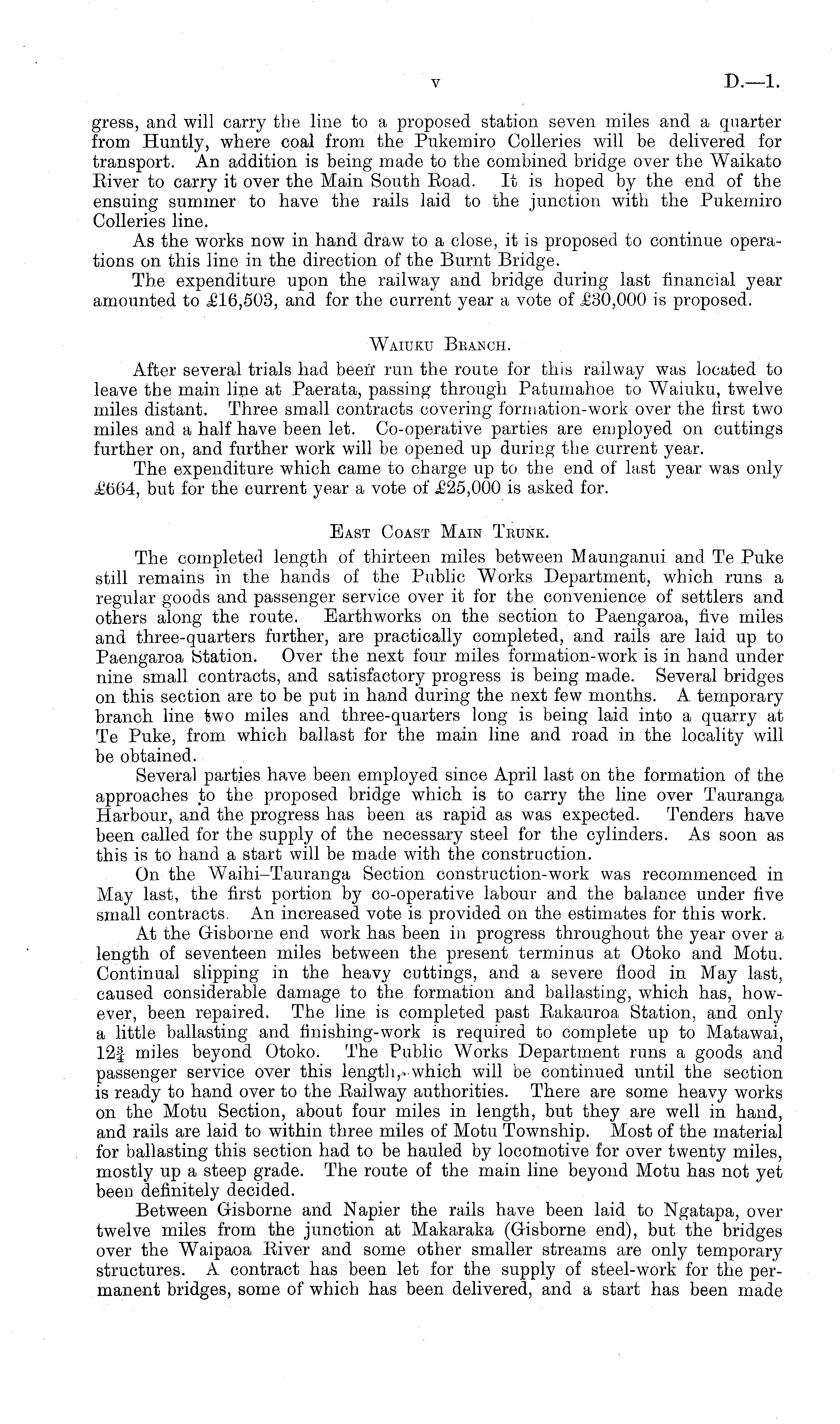 gress, and will carry the line to a proposed station seven miles and a quarter from Huntly, where coal from the Pukemiro Colleries will be delivered for transport. An addition is being made to the combined bridge over the Waikato Eiver to carry it over the Main South Road. It is hoped by the end of the ensuing summer to have the rails laid to the junction with the Pukemiro Colleries line. As the works now in hand draw to a close, it is proposed to continue operations on this line in the direction of the Burnt Bridge. The expenditure upon the railway and bridge during last financial year amounted to J616,503, and for the current year a vote of .£30,000 is proposed. WaIUKU BIiANCH. After several trials had been" run the route for this railway was located to leave the main line at Paerata, passing through Patumahoe to Waiuku, twelve miles distant. Three small contracts covering formation-work over the first two miles and a half have been let. Co-operative parties are employed on cuttings further on, and further work will be opened up during the current year. The expenditure which came to charge up to the end of last year was only £(564, but for the current year a vote of £25,000 is asked for. Bast Coast Main Teunk. The completed length of thirteen miles between Maunganui and Te Puke still remains in the hands of the Public Works Department, which runs a regular goods and passenger service over it for the convenience of settlers and others along the route. Earthworks on the section to Paengaroa, five miles and three-quarters further, are practically completed, and rails are laid up to Paengaroa Station. Over the next four miles formation-work is in hand under nine small contracts, and satisfactory progress is being made. Several bridges on this section are to be put in hand during the next few months. A temporary branch line two miles and three-quarters long is being laid into a quarry at Te Puke, from which ballast for the main line and road in the locality will be obtained. Several parties have been employed since April last on the formation of the approaches to the proposed bridge which is to carry the line over Tauranga Harbour, and the progress has been as rapid as was expected. Tenders have been called for the supply of the necessary steel for the cylinders. As soon as this is to hand a start will be made with the construction. On the Waihi-Tauranga Section construction-work was recommenced in May last, the first portion by co-operative labour and the balance under five small contracts. An increased, vote is provided on the estimates for this work. At the Gisborne end work has been in progress throughout the year over a length of seventeen miles between the present terminus at Otoko and Motu. Continual slipping in the heavy cuttings, and a severe flood in May last, caused considerable damage to the formation and ballasting, which has, however, been repaired. The line is completed past Rakauroa Station, and only a little ballasting and finishing-work is required to complete up to Matawai, 12f miles beyond Otoko. The Public Works Department runs a goods and passenger service over this length,- which will be continued until the section is ready to hand over to the Railway authorities. There are some heavy works on the Motu Section, about four miles in length, but they are well in hand, and rails are laid to within three miles of Motu Township. Most of the material for ballasting this section had to be hauled by locomotive for over twenty miles, mostly up a steep grade. The route of the main line beyond Motu has not yet been definitely decided. Between Gisborne and Napier the rails have been laid to Ngatapa, over twelve miles from the junction at Makaraka (Gisborne end), but the bridges over the Waipaoa River and some other smaller streams are only temporary structures. A contract has been let for the supply of steel-work for the permanent bridges, some of which has been delivered, and a start has been made