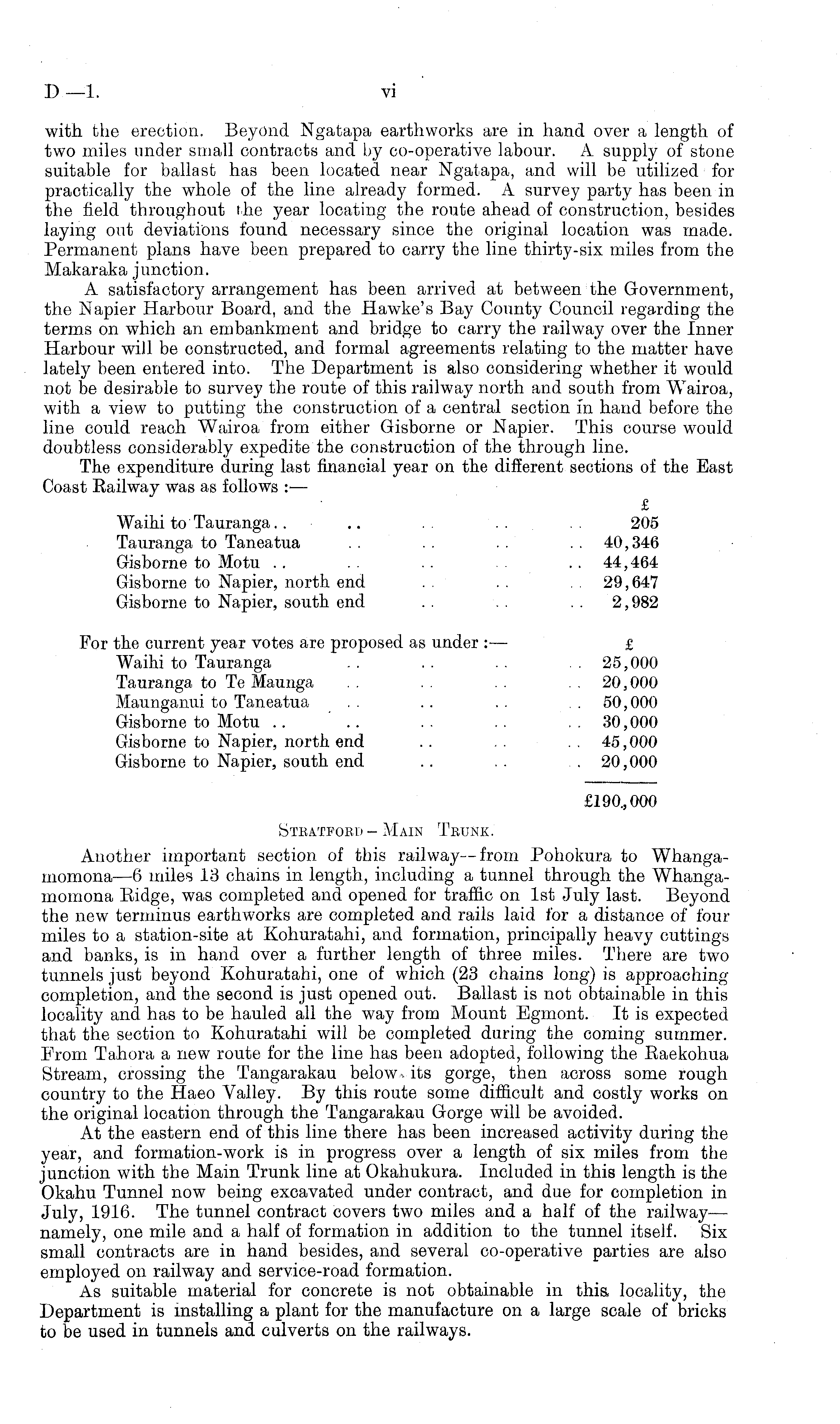 with the erection. Beyond Ngatapa earthworks are in hand over a length of two miles under small contracts and by co-operative labour. A supply of stone suitable for ballast has been located near Ngatapa, and will be utilized for practically the whole of the line already formed. A survey party has been in the field throughout rhe year locating the route ahead of construction, besides laying out deviations found necessary since the original location was made. Permanent plans have been prepared to carry the line thirty-six miles from the Makaraka junction. A satisfactory arrangement has been arrived at between the Government, the Napier Harbour Board, and the Hawke's Bay County Council regarding the terms on which an embankment and bridge to carry the railway over the Inner Harbour will be constructed, and formal agreements relating to the matter have lately been entered into. The Department is also considering whether it would not be desirable to survey the route of this railway north and south from Wairoa, with a view to putting the construction of a central section in hand before the line could reach Wairoa from either Gisborne or Napier. This course would doubtless considerably expedite the construction of the through line. The expenditure during last financial year on the different sections of the East Coast Railway was as follows : — £ Waihi to Tauranga. . .. . . . . . . 205 Tauranga to Taneatua . . . . . . . . 40,346 Gisborne to Motu .. . . . . . . .. 44,464 Gisborne to Napier, north end . . . . . . 29,647 Gisborne to Napier, south end . . . . . . 2,982 For the current year votes are proposed as under : — £ Waihi to Tauranga . . . . . . .. 25,000 Tauranga to Te Maunga . . . . . . .. 20,000 Maunganui to Taneatua . . . . . . . . 50,000 Gisborne to Motu .. .. .. .. .. 30,000 Gisborne to Napier, north end .. . . . . 45,000 Gisborne to Napier, south end . . . . . . 20,000 £190., 000 Stbatfobd- Main Trunk. Another important section of this railway—from Pohokura to Whangamomona —6 miles 13 chains in length, including a tunnel through the Whangamomona Eidge, was completed and opened for traffic on Ist July last. Beyond the new terminus earthworks are completed and rails laid for a distance of four miles to a station-site at Kohuratahi, and formation, principally heavy cuttings and banks, is in hand over a further length of three miles. There are two tunnels just beyond Kohuratahi, one of which (23 chains long) is approaching completion, and the second is just opened out. Ballast is not obtainable in this locality and has to be hauled all the way from Mount Egmont. It is expected that the section to Kohuratahi will be completed during the coming summer. From Tahora a new route for the line has been adopted, following the Eaekohua Stream, crossing the Tangarakau below its gorge, then across some rough country to the Haeo Valley. By this route some difficult and costly works on the original location through the Tangarakau Gorge will be avoided. At the eastern end of this line there has been increased activity during the year, and formation-work is in progress over a length of six miles from the junction with the Main Trunk line at Okahukura. Included in this length is the Okahu Tunnel now being excavated under contract, and due for completion in July, 1916. The tunnel contract covers two miles and a half of the railway— namely, one mile and a half of formation in addition to the tunnel itself. Six small contracts are in hand besides, and several co-operative parties are also employed on railway and service-road formation. As suitable material for concrete is not obtainable in this, locality, the Department is installing a plant for the manufacture on a large scale of bricks to be used in tunnels and culverts on the railways.