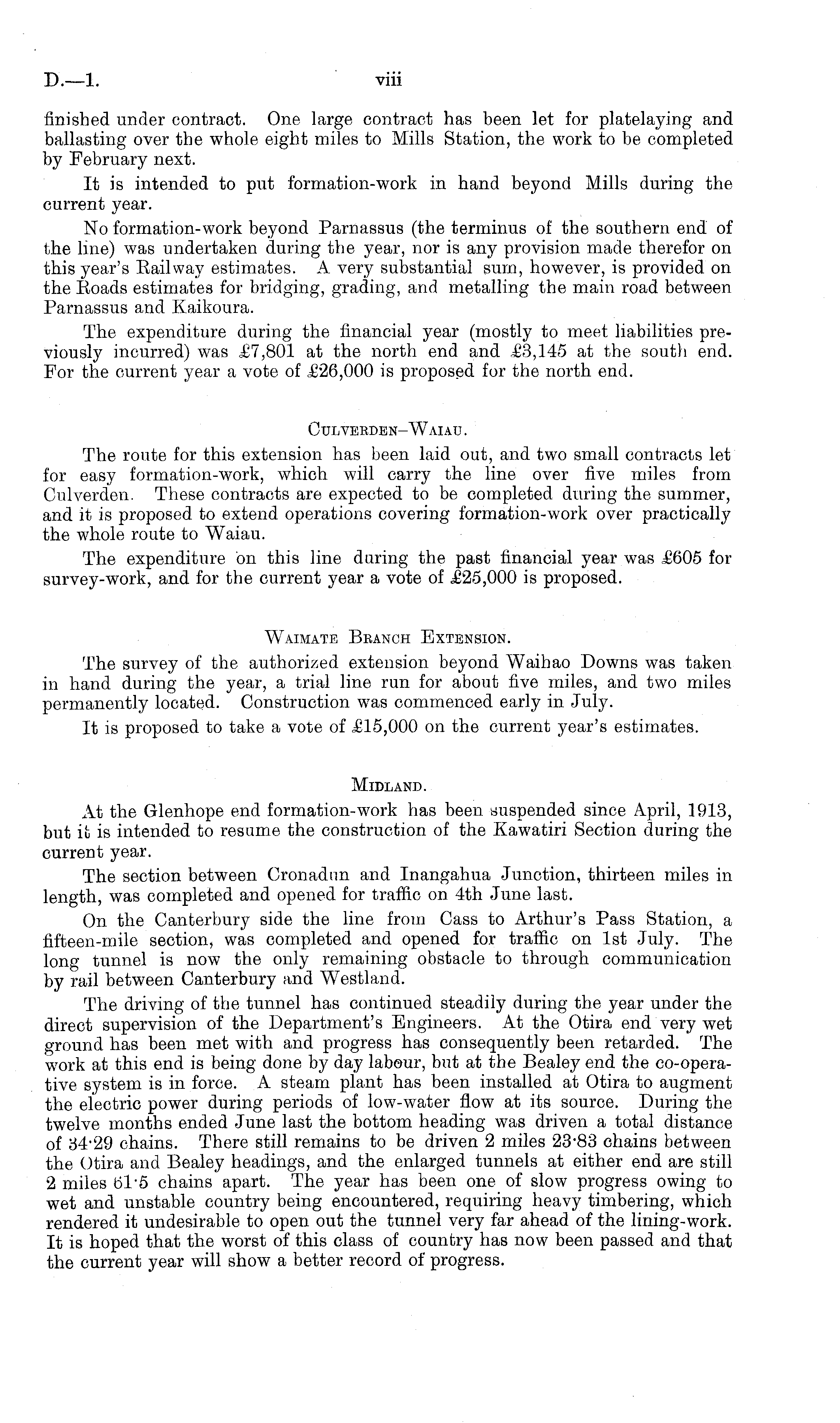 finished under contract. One large contract has been let for platelaying and ballasting over the whole eight miles to Mills Station, the work to be completed by February next. It is intended to put formation-work in hand beyond Mills during the current year. No formation-work beyond Parnassus (the terminus of the southern end of the line) was undertaken during the year, nor is any provision made therefor on this year's Eailway estimates. A very substantial sum, however, is provided on the Roads estimates for bridging, grading, and metalling the main road between Parnassus and Kaikoura. The expenditure during the financial year (mostly to meet liabilities previously incurred) was £7,801 at the north end and ,£3,145 at the south end. For the current year a vote of £26,000 is proposed for the north end. CULVEEDEN-WaIAU . The route for this extension has been laid out, and two small contracts let for easy formation-work, which will carry the line over five miles from Culverden. These contracts are expected to be completed during the summer, and it is proposed to extend operations covering formation-work over practically the whole route to Waiau. The expenditure on this line during the past financial year was £605 for survey-work, and for the current year a vote of £25,000 is proposed. Waimate Branch Extension. The survey of the authorized extension beyond Waihao Downs was taken in hand during the year, a trial line run for about five miles, and two miles permanently located. Construction was commenced early in July. It is proposed to take a vote of £15,000 on the current year's estimates. Midland. At the Glenhope end formation-work has been suspended since April, 1913, but it is intended to resume the construction of the Kawatiri Section during the current year. The section between Cronadun and Inangahua Junction, thirteen miles in length, was completed and opened for traffic on 4th June last. On the Canterbury side the line from Cass to Arthur's Pass Station, a fifteen-mile section, was completed and opened for traffic on Ist July. The long tunnel is now the only remaining obstacle to through communication by rail between Canterbury and Westland. The driving of the tunnel has continued steadily during the year under the direct supervision of the Department's Engineers. At the Otira end very wet ground has been met with and progress has consequently been retarded. The work at this end is being done by day labour, but at the Bealey end the co-opera-tive system is in force. A steam plant has been installed at Otira to augment the electric power during periods of low-water flow at its source. During the twelve months ended June last the bottom heading was driven a total distance of 34*29 chains. There still remains to be driven 2 miles 2383 chains between the Otira and Bealey headings, and the enlarged tunnels at either end are still 2 miles b'l - 5 chains apart. The year has been one of slow progress owing to wet and unstable country being encountered, requiring heavy timbering, which rendered it undesirable to open out the tunnel very far ahead of the lining-work. It is hoped that the worst of this class of country has now been passed and that the current year will show a better record of progress.