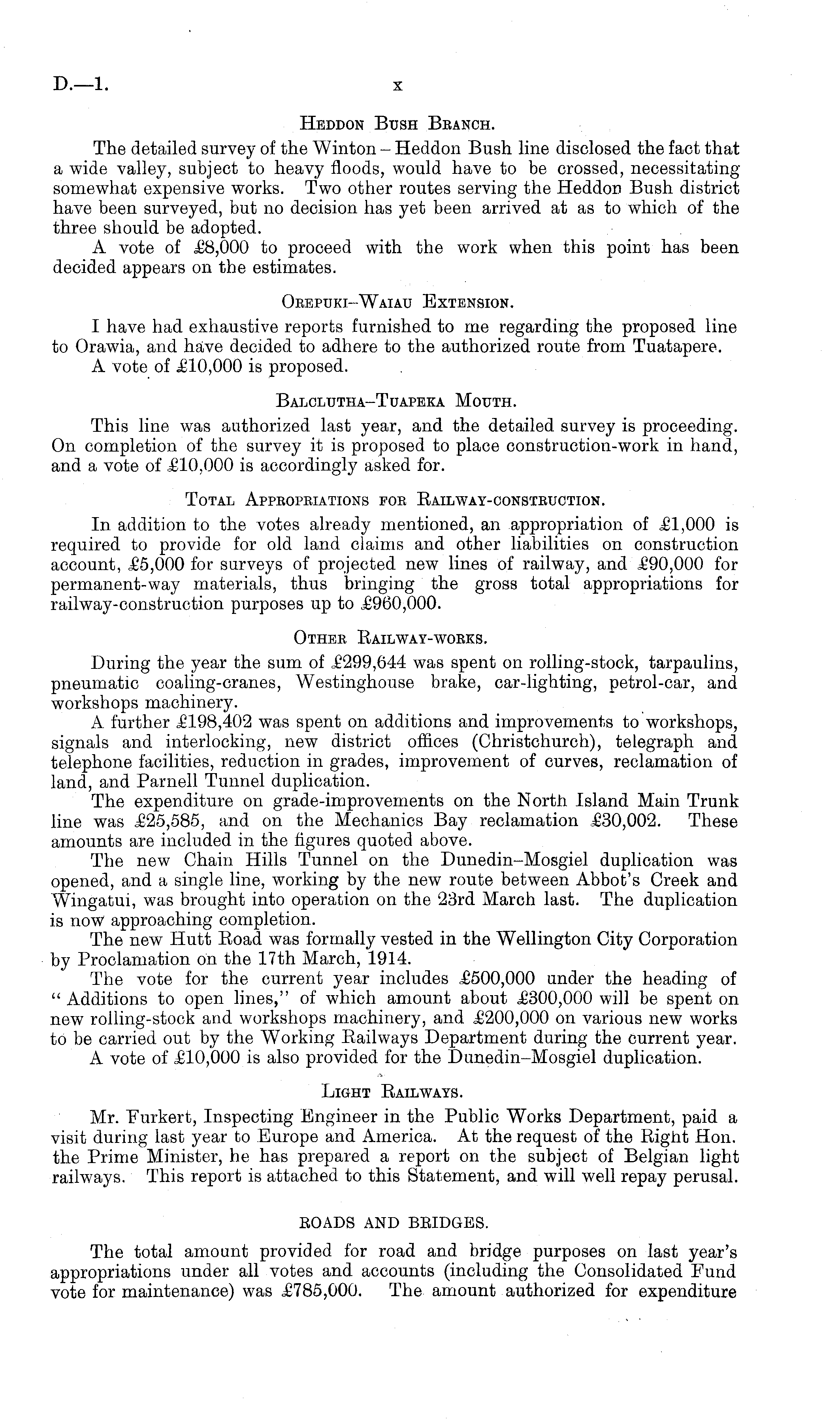 Heddon Bush Bbanch. The detailed survey of the Winton - Heddon Bush line disclosed the fact that a wide valley, subject to heavy floods, would have to be crossed, necessitating somewhat expensive works. Two other routes serving the Heddon Bush district have been surveyed, but no decision has yet been arrived at as to which of the three should be adopted. A vote of £8,000 to proceed with the work when this point has been decided appears on the estimates. Oeepuki-Waiau Extension. I have had exhaustive reports furnished to me regarding the proposed line to Orawia, and have decided to adhere to the authorized route from Tuatapere. A vote of £10,000 is proposed. Balclutha-Tuapeka Mouth. This line was authorized last year, and the detailed survey is proceeding. On completion of the survey it is proposed to place construction-work in hand, and a vote of £10,000 is accordingly asked for. Total Appropriations for Railway-construction. In addition to the votes already mentioned, an appropriation of £1,000 is required to provide for old land claims and other liabilities on construction account, £5,000 for surveys of projected new lines of railway, and £90,000 for permanent-way materials, thus bringing the gross total appropriations for railway-construction purposes up to £960,000. Other Rail way-works. During the year the sum of £299,644 was spent on rolling-stock, tarpaulins, pneumatic coaling-cranes, Westinghouse brake, car-lighting, petrol-car, and workshops machinery. A further £198,402 was spent on additions and improvements to workshops, signals and interlocking, new district offices (Ohristchurch), telegraph and telephone facilities, reduction in grades, improvement of curves, reclamation of land, and Parnell Tunnel duplication. The expenditure on grade-improvements on the North Island Main Trunk line was £25,585, and on the Mechanics Bay reclamation £30,002. These amounts are included in the figures quoted above. The new Chain Hills Tunnel on the Dunedin-Mosgiel duplication was opened, and a single line, working by the new route between Abbot's Creek and Wingatui, was brought into operation on the 23rd March last. The duplication is now approaching completion. The new Hutt Road was formally vested in the Wellington City Corporation by Proclamation on the 17th March, 1914. The vote for the current year includes £500,000 under the heading of " Additions to open lines," of which amount about £300,000 will be spent on new rolling-stock and workshops machinery, and £200,000 on various new works to be carried out by the Working Railways Department during the current year. A vote of £10,000 is also provided for the Dunedin-Mosgiel duplication. Light Railways. Mr. Furkert, Inspecting Engineer in the Public Works Department, paid a visit during last year to Europe and America. At the request of the Right Hon. the Prime Minister, he has prepared a report on the subject of Belgian light railways. This report is attached to this Statement, and will well repay perusal. EOADS AND BEIDGES. The total amount provided for road and bridge purposes on last year's appropriations under all votes and accounts (including the Consolidated Fund vote for maintenance) was £785,000. The amount authorized for expenditure