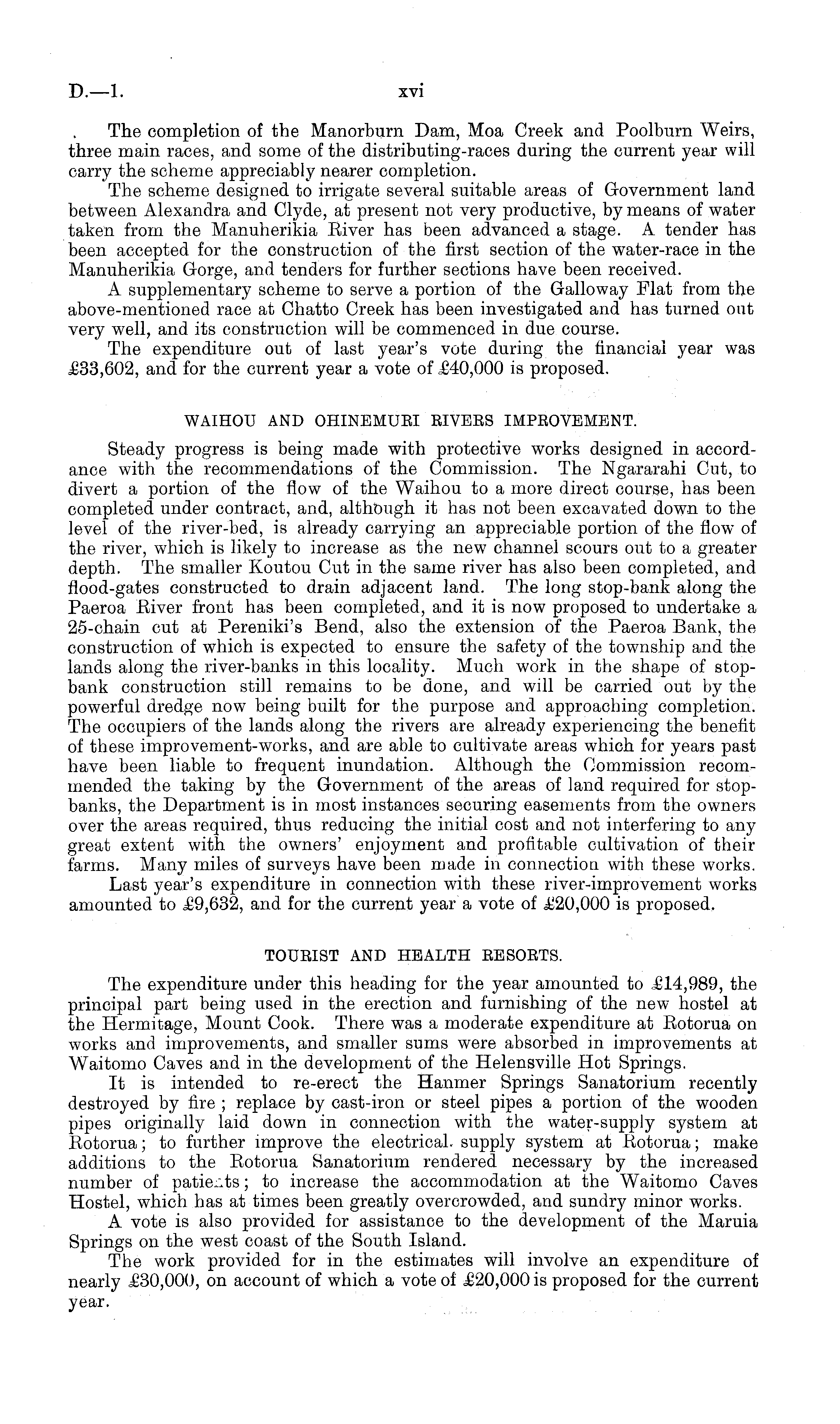 The completion of the Manorburn Dam, Moa Creek and Poolbum Weirs, three main races, and some of the distributing-races during the current year will carry the scheme appreciably nearer completion. The scheme designed to irrigate several suitable areas of Government land between Alexandra and Clyde, at present not very productive, by means of water taken from the Manuherikia River has been advanced a stage. A tender has been accepted for the construction of the first section of the water-race in the Manuherikia Gorge, and tenders for further sections have been received. A supplementary scheme to serve a portion of the Galloway Flat from the above-mentioned race at Chatto Creek has been investigated and has turned out very well, and its construction will be commenced in due course. The expenditure out of last year's vote during the financial year was £33,602, and for the current year a vote of £40,000 is proposed. WAIHOU AND OHINEMUEI KIVEES IMPEOVEMENT. Steady progress is being made with protective works designed in accordance with the recommendations of the Commission. The Ngararahi Cut, to divert a portion of the flow of the Waihou to a more direct course, has been completed under contract, and, although it has not been excavated down to the level of the river-bed, is already carrying an appreciable portion of the flow of the river, which is likely to increase as the new channel scours out to a greater depth. The smaller Koutou Cut in the same river has also been completed, and flood-gates constructed to drain adjacent land. The long stop-bank along the Paeroa River front has been completed, and it is now proposed to undertake a 25-chain cut at Pereniki's Bend, also the extension of the Paeroa Bank, the construction of which is expected to ensure the safety of the township and the lands along the river-banks in this locality. Much work in the shape of stopbank construction still remains to be done, and will be carried out by the powerful dredge now being built for the purpose and approaching completion. The occupiers of the lands along the rivers are already experiencing the benefit of these improvement-works, and are able to cultivate areas which for years past have been liable to frequent inundation. Although the Commission recommended the taking by the Government of the a,reas of land required for stopbanks, the Department is in most instances securing easements from the owners over the areas required, thus reducing the initial cost and not interfering to any great extent with the owners' enjoyment and profitable cultivation of their farms. Many miles of surveys have been made in connection with these works. Last year's expenditure in connection with these river-improvement works amounted to £9,632, and for the current year a vote of £20,000 is proposed. TOUEIST AND HEALTH EEBOETS. The expenditure under this heading for the year amounted to £14,989, the principal part being used in the erection and furnishing of the new hostel at the Hermitage, Mount Cook. There was a moderate expenditure at Eotorua on works and improvements, and smaller sums were absorbed in improvements at Waitomo Caves and in the development of the Helensville Hot Springs. It is intended to re-erect the Hanmer Springs Sanatorium recently destroyed by fire ; replace by cast-iron or steel pipes a portion of the wooden pipes originally laid down in connection with the water-supply system at Rotorua; to further improve the electrical, supply system at Eotorua; make additions to the Rotorua Sanatorium rendered necessary by the increased number of patients; to increase the accommodation at the Waitomo Caves Hostel, which has at times been greatly overcrowded, and sundry minor works. A vote is also provided for assistance to the development of the Maruia Springs on the west coast of the South Island. The work provided for in the estimates will involve an expenditure of nearly £30,000, on account of which a vote of £20,000 is proposed for the current year.
