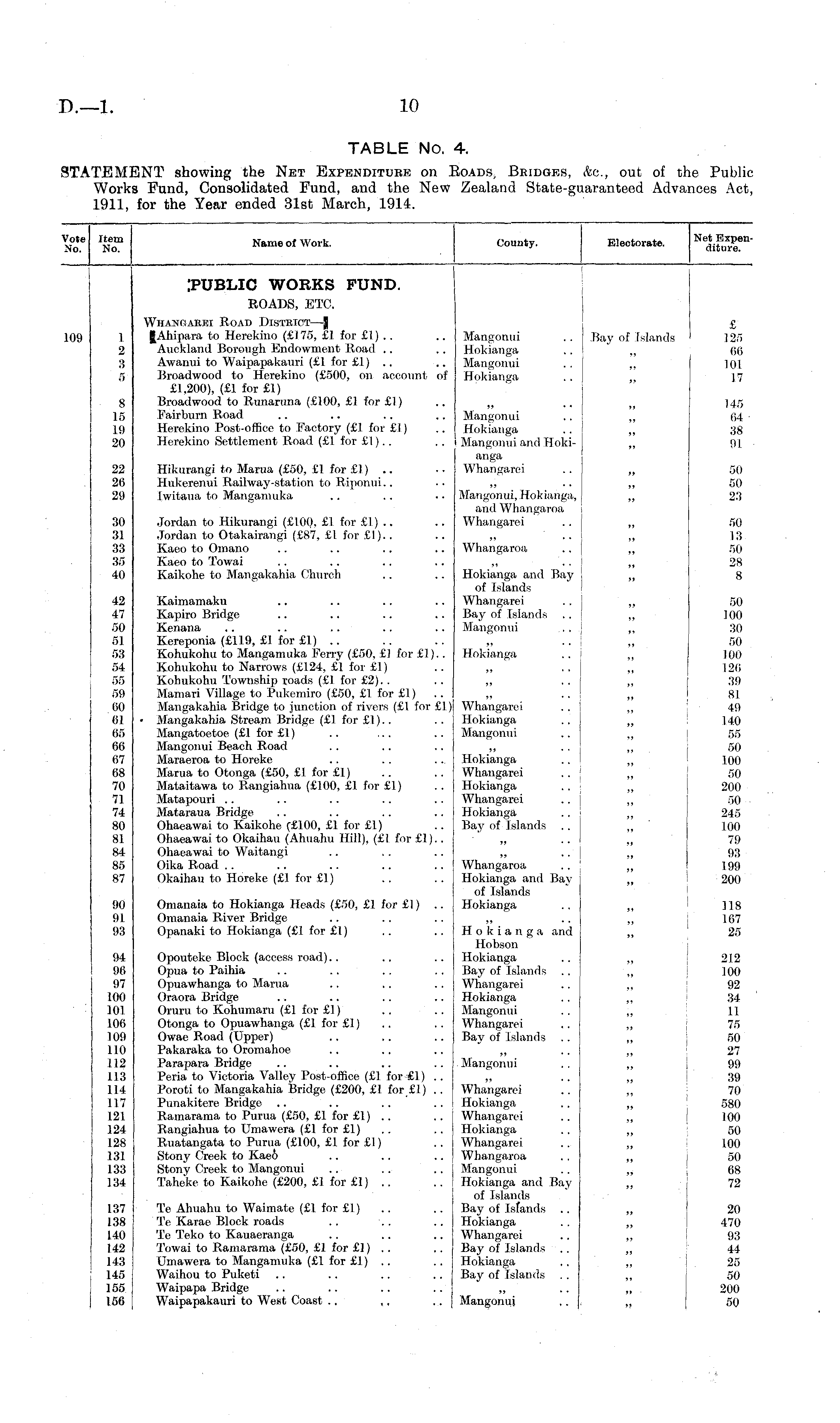 TABLE No. 4. STATEMENT showing the Net Expenditure on Roads, Bridges, &c., out of the Public Works Fund, Consolidated Fund, and the New Zealand State-guaranteed Advances Act, 1911, for the Year ended 31st March, 1914.