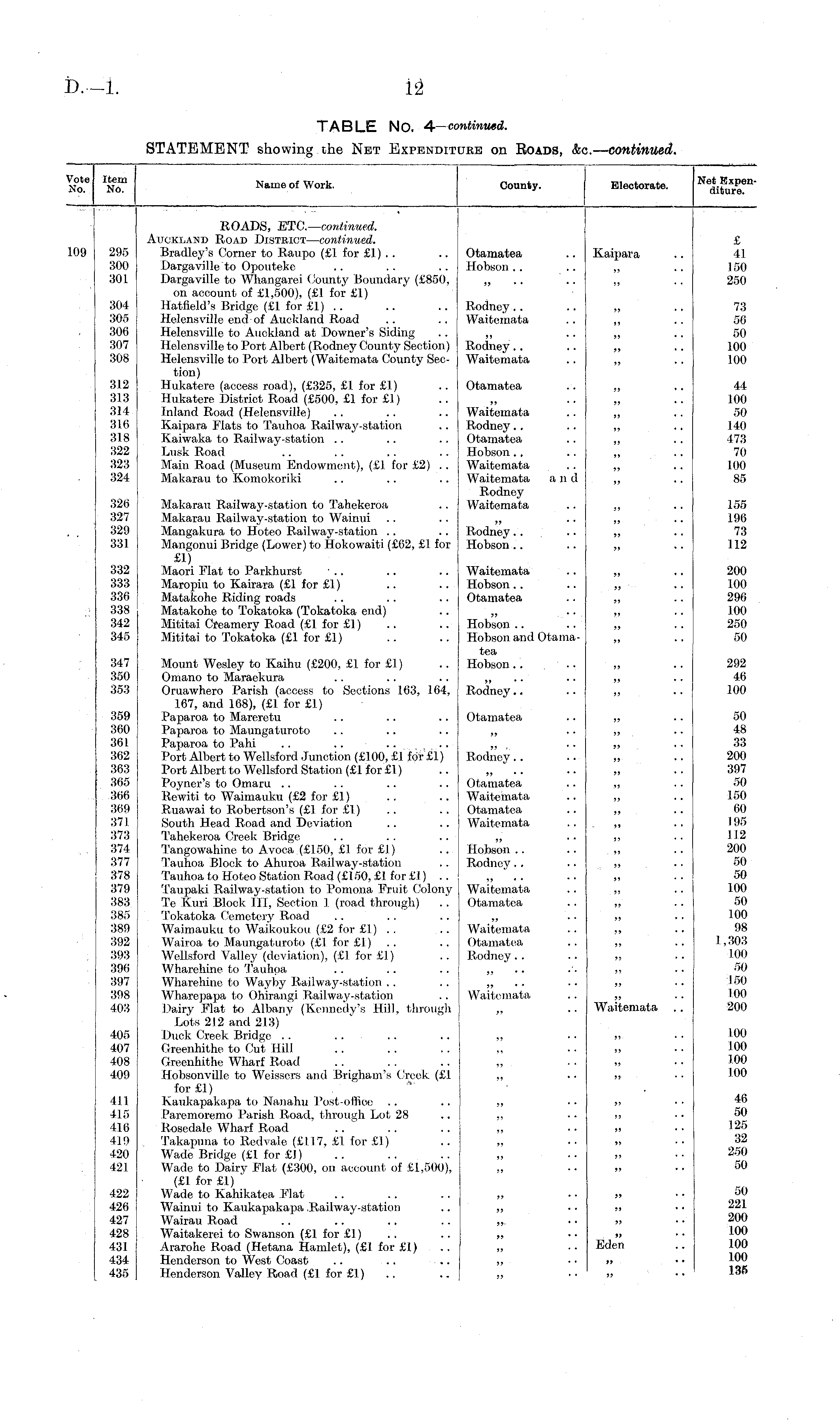 Vote No. Item No. Name of Work. County. Electorate. Net Expenditure. 109 295 300 301 304 305 306 307 308 ROADS, ETC.— continued. Auckland Road District — continued. Bradley's Corner to Raupo (£1 for £1) . . Dargaville to Opouteke Dargaville to Whangarei County Boundary (£850, on account of £1,500), (£1 for £1) Hatfield's Bridge (£1 for £1) .. Helensville end of Auckland Road Helensville to Auckland at Downer's Siding Helensville to Port Albert (Rodney County Section) Helensville to Port Albert (Waitemata County Section) Hukatore (access road), (£325, £1 for £1) Hukatere District Road (£500, £1 for £1) Inland Road (Helensville) Kaipara Hats to Tauhoa Railwa3r-station Kaiwaka to Railway-station . . Lusk Road Main Road (Museum Endowment), (£1 for £2) .. Makarau to Komokoriki Otamatea Hobson Rodney Waitomata Rodney Waitemata Kaipara £ 41 150 250 73 56 50 100 100 312 313 314 316 318 322 323 324 Otamatea Waitemata Rodney Otamatea Hobson Waitemata Waitemata a n d Rodney Waitemata 44 100 50 140 473 70 100 85 326 327 329 331 Makarau Railway-station to Tahekeroa Makarau Railway-station to Wainui Mangakura to Hoteo Railway-station Mangonui Bridge (Lower) to Hokowaiti (£62, £1 for £1) Maori Flat to Parkhurst Maropiu to Kairara (£1 for £1) Matakohe Riding roads Matakohe to Tokatoka (Tokatoka end) Mititai Creamery Road (£1 for £1) Mititai to Tokatoka (£1 for £1) Rodney Hobson J 55 196 73 112 332 333 336 338 342 345 Waitemata Hobson Otamatea 200 100 296 100 250 50 Hobson Hobson and Otamatea Hobson. . ... 347 350 353 Mount Wesley to Kaihu (£200, £1 for £1) Omano to Maraekura Oruawhero Parish (access to Sections 163, 164, 167, and 168), (£1 for £1) Paparoa to Mareretu Paparoa to Maungaturoto Paparoa to Pahi Port Albert to Wellsford Junction (£100, £J for £]) Port Albert to Wellsford Station (£1 for £1) Poyner's to Omaru Rewiti to Waimauku (£2 for £1) Ruawai to Robertson's (£1 for £1) South Head Road and Deviation Tahekeroa Creek Bridge Tangowahine to Avoca (£150, £1 for £1) Tauhoa Block to Ahuroa Railway-station Tauhoa to Hoteo Station Road (£150, £1 for £1) .. Taupaki Railway-station to Pomona Fruit Colony Te ituri Block III, Section 1 (road through) Tokatoka Cemetery Road Waimauku to Waikoukou (£2 for £1) Wairoa to Maungaturoto (£1 for £1) Wellsford Valley (deviation), (£1 for £1) Wharehine to Tauhoa Wharehinc to Wayby Railway-station .. Wharepapa to Ohirangi Railway-station Dairy Flat to Albany (Kennedy's Hill, through Lots 212 and 213) Duck Creek Bridge Greenhithe to Cut Hill Greenhithe Wharf Road Hobsonvillc to Weissers and Brighain's Crock (£1 for £1) Kaukapakapa to Nanahu Post-office, Paremoremo Parish Road, through Lot 28 Rosedale Wharf Road Takapuna to Rcdvale (£1 17, £1 for £1) Wade Bridge (£1 for £1) Wade to Dairy Flat (£300, on account of £1,500), (£1 for £1) ' Wade to Kahikatea Flat Wainui to Kaukapakapa Railway-station Wairau Road Waitakerei to Swanson (£1 for £1) Ararohe Road (Hetana Hamlet), (£1 for £1) Henderson to West Coast .. .. Henderson Valley Road (£] for £1) Rodney 292 46 100 359 360 361 362 363 365 366 369 371 373 374 377 378 379 383 385 389 392 393 396 397 398 403 Otamatea Rodney Otamatea Waitemata Otamatea Waitemata Hobson Rodney 50 48 33 200 397 50 150 60 195 112 200 50 50 100 50 100 98 1,303 100 50 150 100 200 Waitemata Otamatea . . Waitemata Otaraatea Rodney. . Waitemata Waitemata 405 407 408 409 100 100 100 100 411 415 416 419 420 421 ,, • • 46 50 125 32 250 50 422 426 427 428 431 434 435 50 221 200 100 100 100 135 »» •' Eden