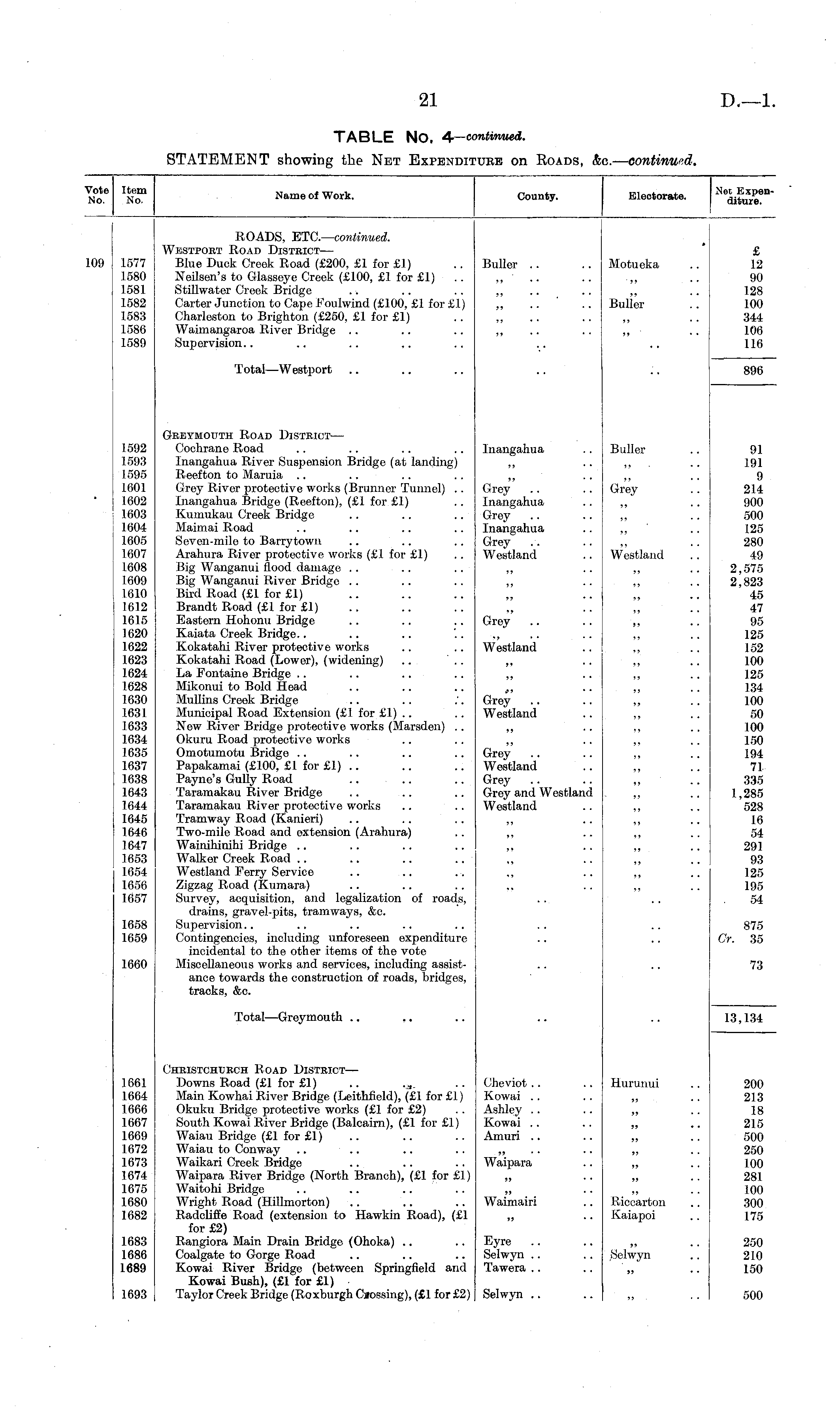 Vote Item No. No. Name of Work. County. Electorate. Net Expenditure. 109 1577 1580 1581 1582 1583 1586 1589 ROADS, ETC.— continued. Westport Road Distbiot— Blue Duck Creek Road (£200, £1 for £1) Neilsen's to Glasseye Creek (£100, £1 for £1) Stillwater Creek Bridge Carter Junction to Cape Foulwind (£100, £1 for £1) Charleston to Brighton (£250, £1 for £1) Waimangaroa River Bridge Supervision.. Buller .. Motueka Buller £ 12 90 128 100 344 106 116 Total—Westport .. 896 1592 1593 1595 L601 1602 1603 1604 1605 1607 1608 1609 1610 1612 1615 1620 1622 1623 1624 1628 1630 1631 1633 1634 1635 1637 1638 1643 1644 1645 1646 1647 1653 1654 1656 1657 Geeymouth Road District— Cochrane Road Inangahua River Suspension Bridge (at landing) Reefton to Maruia Grey River protective works (Brunner Tunnel) . . Inangahua Bridge (Reefton), (£1 for £1) Kumukau Creek Bridge Maimai Road Seven-mile to Barrytown Arahura River protective works (£1 for £1) Big Wanganui flood damage Big Wanganui River Bridge Bird Road (£1 for £1) Brandt Road (£1 for £1) Kastern Hohonu Bridge Kaiata Creek Bridge.. Kokatahi River protective works Kokatahi Road (Lower), (widening) La Fontaine Bridge Mikonui to Bold Head Mullins Creek Bridge Municipal Road Extension (£1 for £1) New River Bridge protective works (Marsden) .. Okuru Road protective works Omotumotu Bridge Papakamai (£100, £1 for £1) .. Payne's Gully Road Taramakau River Bridge Taramakau River protective works Tramway Road (Kanieri) Two-mile Road and extension (Arahura) Wainihinihi Bridge Walker Creek Road Westland Ferry Service Zigzag Road (Kumara) Survey, acquisition, and legalization of roads, drains, gravel-pits, tramways, &c. Supervision Contingencies, including unforeseen expenditure incidental to the other items of the vote Miscellaneous works and services, including assistance towards the construction of roads, bridges, tracks, &c. Inangahua Grey Inangahua Grey Inangahua Grey Westland Grey Westland Grey Westland Buller Grey Westland j, 91 191 9 214 900 500 125 280 49 2,575 2,823 45 47 95 125 152 100 125 134 100 50 100 150 194 71 335 1,285 528 16 54 291 93 125 195 54 Grey Westland Grey Grey and Westland Westland 1658 1659 875 Or. 35 1660 73 Total—Greymouth .. 13,134 1661 1664 1666 1667 1669 1672 1673 1674 1675 1680 1682 Chbistohuech Road District — Downs Road (£1 for £1) Main Kowhai River Bridge (Leithfield), (£1 for £1) Okuku Bridge protective works (£1 for £2) South Kowai River Bridge (Balcairn), (£1 for £1) Waiau Bridge (£1 for £1) Waiau to Conway Waikari Creek Bridge Waipara River Bridge (North Branch), (£1 for £1) Waitohi Bridge Wright Road (Hillmorton) Radcliffe Road (extension to Hawkin Road), (£1 for £2) Rangiora Main Drain Bridge (Ohoka) Coalgate to Gorge Road Kowai River Bridge (between Springfield and Kowai Bush), (£1 for £1) Taylor Creek Bridge (Roxburgh Crossing), (£1 for £2) Cheviot Kowai Ashley Kowai Amuri Waipara Hurunui 200 213 18 215 500 250 100 281 100 300 175 Waimairi Riccarton Kaiapoi ,5 • ■ 1683 1686 1689 Eyre Selwyn .. Tawera Selwyn 250 210 150 )» 1693 Selwyn 500