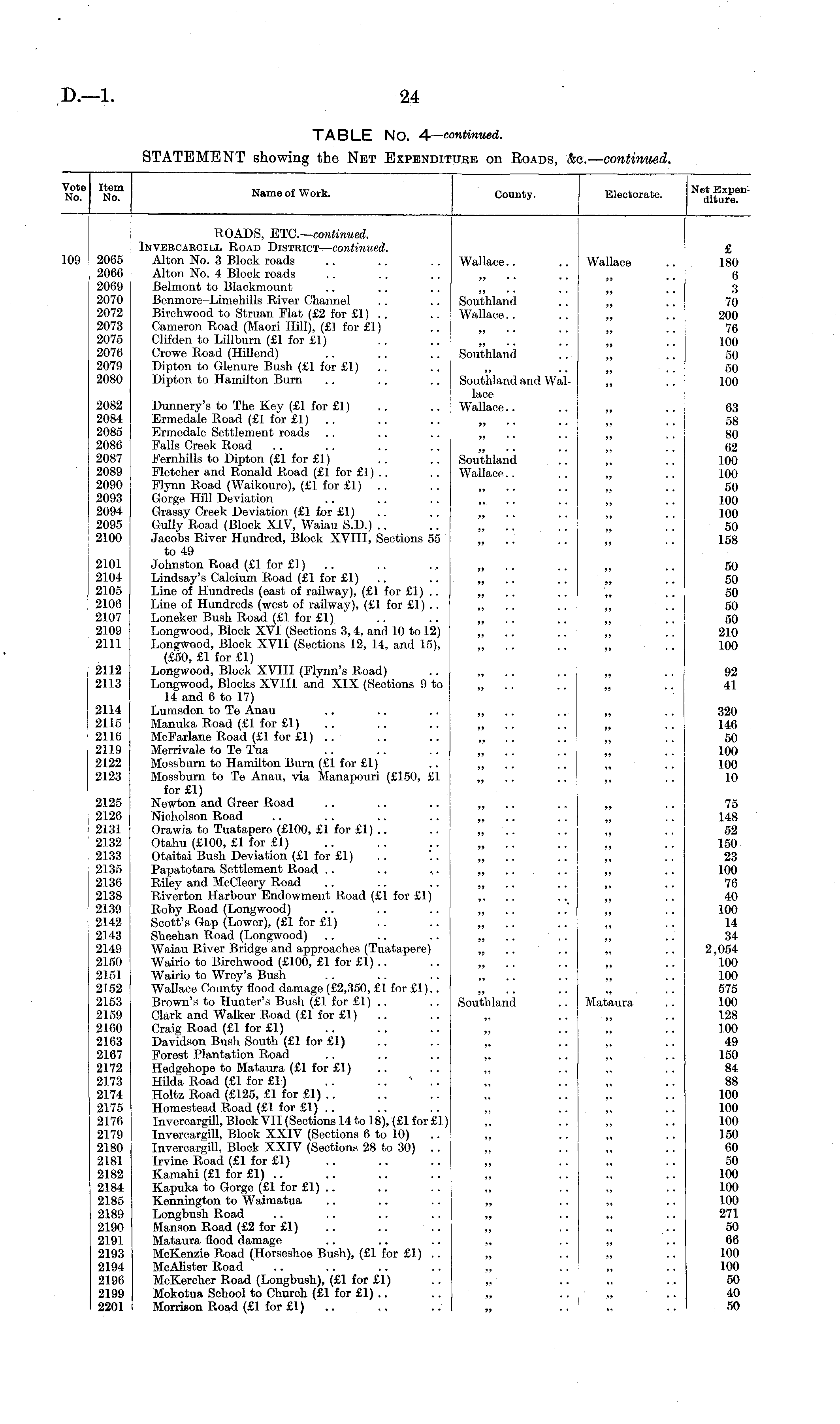 Vote No. Item No. Name of Work. County. Electorate. Net Expenditure. 09 2065 2066 2069 2070 2072 2073 2075 2076 2079 2080 ROADS, ETC.—continued. Inveecabgill Road District— continued. Alton No. 3 Block roads Alton No. 4 Block roads Belmont to Blackmount Benmore-Limehills River Channel Birchwood to Struan Flat (£2 for £1) Cameron Road (Maori Hill), (£1 for £1) Clifden to Lillburn (£1 for £1) Crowe Road (Hillend) Dipton to Glenure Bush (£1 for £1) Dipton to Hamilton Bnrn Wallace.. Southland Wallace.. Wallace »> £ 180 6 3 70 200 76 100 50 50 100 >> ,, >» Southland Southland and Wallace Wallace.. 2082 2084 2085 2086 2087 2089 2090 2093 2094 2095 2100 2101 2104 2105 2106 2107 2109 2111 2112 2113 2114 2115 2116 2119 2122 2123 2125 2126 2131 2132 2133 2135 2136 2138 2139 2142 2143 2149 2150 2151 2152 2153 2159 2160 2163 2167 2172 2173 2174 2175 2176 2179 2180 2181 2182 2184 2185 2189 2190 2191 2193 2194 2196 2199 2201 Dunnery's to The Key (£1 for £1) Ermedale Road (£1 for £1) .. Ermedale Settlement roads Falls Creek Road Fernhills to Dipton (£1 for £1) Fletcher and Ronald Road (£1 for £1) .. Flynn Road (Waikouro), (£1 for £1) Gorge Hill Deviation Grassy Creek Deviation (£1 for £1) Gully Road (Block XIV, Waiau S.D.) .. Jacobs River Hundred, Block XVIII, Sections 55 to 49 Johnston Road (£1 for £1) Lindsay's Calcium Road (£1 for £1) Line of Hundreds (east of railway), (£1 for £1) .. Line of Hundreds (west of I'ailway), (£1 for £1) .. Loneker Bush Road (£1. for £1) Longwood, Block XVI (Sections 3,4, and 10 to 12) Longwood, Block XVII (Sections 12, 14, and 15), (£50, £1 for £1) Longwood, Block XVIII (Flynn's Road) Longwood, Blocks XVIII and XIX (Sections 9 to 14 and 6 to 17) Lumsden to Te Anau Manuka Road (£1 for £1) McFarlane Road (£1 for £1) .. Merrivale to Te Tua Mossburn to Hamilton Burn (£1 for £1) Mossburn to Te Anau, via Manapouri (£150, £1 for £1) Newton and Greer Road Nicholson Road Orawia to Tuatapere (£100, £1 for £1) .. Otahu (£100, £1 for £1) Otaitai Bush Deviation (£1 for £1) Papatotara Settlement Road Riley and McCleery Road Riverton Harbour Endowment Road (£1 for £1) Roby Road (Longwood) Scott's Gap (Lower), (£1 for £1) Sheehan Road (Longwood) Waiau River Bridge and approaches (Tuatapere) Wairio to Birchwood (£100, £1 for £1) .. Wairio to Wrey's Bush Wallace County flood damage (£2,350, £1 for £1).. Brown's to Hunter's Bush (£1 for £1) .. Clark and Walker Road (£1 for £1) Craig Road (£1 for £1) Davidson Bush South (£1 for £1) Forest Plantation Road Hedgehope to Mataura (£1 for £1) Hilda Road (£1 for £1) .. .. Holtz Road (£125, £1 for £1) .. Homestead Road (£1 for £1) .. Tnvercargill, Block VII (Sections 14 to 18), (£1 for £1) Invercargill, Block XXIV (Sections 6 to 10) Invercargill, Block XXIV (Sections 28 to 30) .. Irvine Road (£1 for £1) Kamahi (£1 for £1) .. Kapuka to Gorge (£1 for £1) .. Kennington to Waimatua Longbush Road Manson Road (£2 for £1) Mataura flood damage McKenzie Road (Horseshoe Bush), (£1 for £1) McAlister Road McKercher Road (Longbush), (£1 for £1) Mokotua School to Church (£1 for £1) .. Morrison Road (£1 for £1) 15 ,, Southland Wallace.. ,, ,, ,, .. >> >> >> yy >» >> 63 58 80 62 100 100 50 100 100 50 158 50 50 50 50 50 210 100 92 41 320 146 50 100 100 10 75 148 52 150 23 100 76 40 100 14 34 2,054 100 100 575 100 128 100 49 150 84 88 100 100 100 150 60 50 100 100 100 271 50 66 100 100 50 40 50 ,, Southland Mataura i>