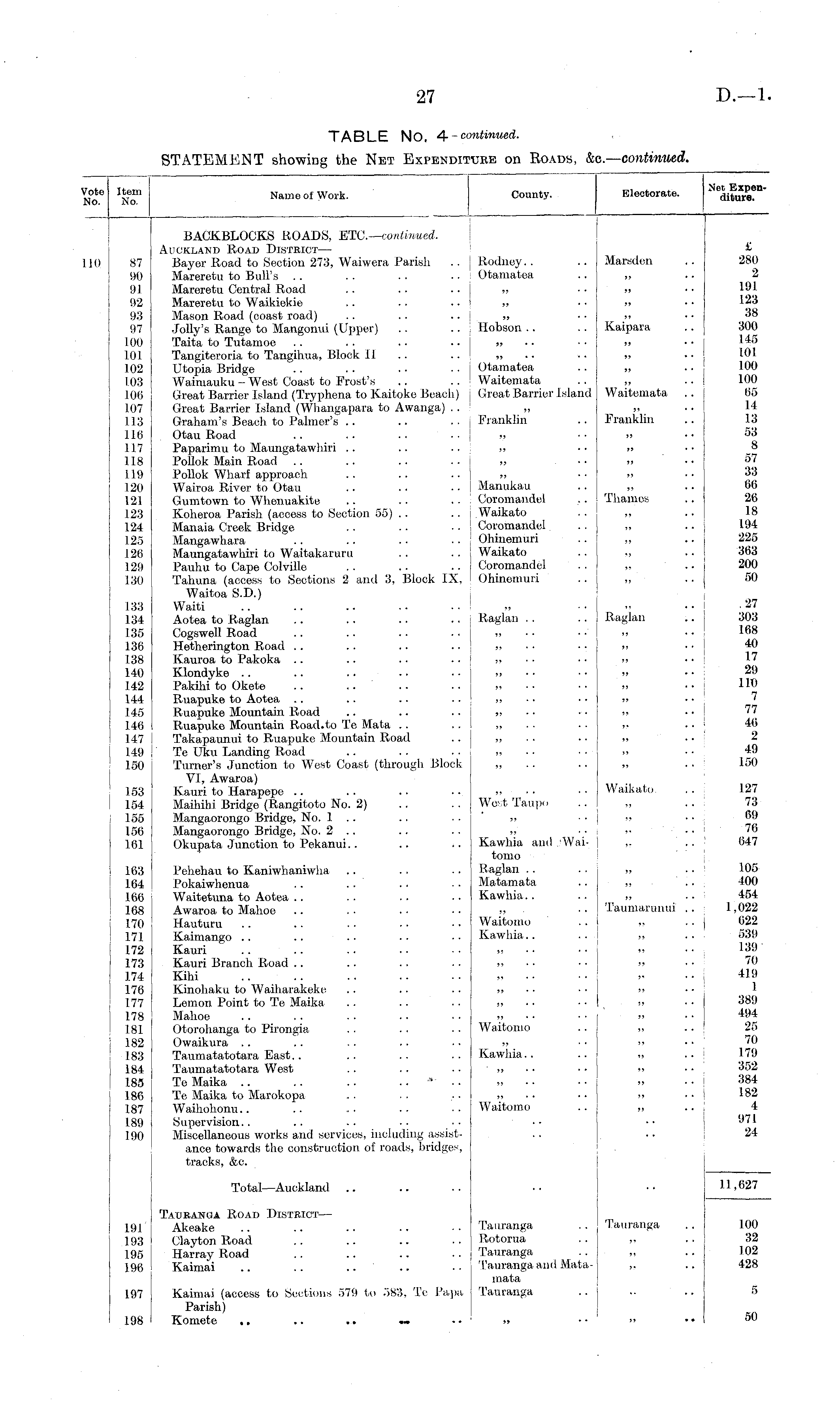 Vote No. Item No. Name of Work. County. Electorate. Net Expenditure. II) 87 90 91 92 93 97 100 101 102 103 106 107 113 116 117 118 119 120 121 123 124 125 126 129 130 BACKBLOOKS ROADS, ETC.— continued. Auckland Road District — Bayer Road to Section 27;!, Waiwera Parish Mareretu to Bull's Mareretu Central Road Mareretu to Waikiekie Mason Road (coast road) .Tolly's Range to Mangonui (Upper) Taita to Tutamoe Tangiteroria to Tangihua, Block 11 Utopia Bridge Waimauku - West Coast to Frost's Great Barrier Island (Tryphena to Kaitoke Beach) Great Barrier Island (Whangapara to Awanga) .. Graham's Beach to Palmer's .. Otau Road Paparimu to Maungatawhiri Pollok Main Road Pollok Wharf approach Wairoa River to Otau Gumtown to Whenuakito Koheroa Parish (access to Section 55) Manaia Creek Bridge Mangawhara Maungatawhiri to Waitakaruru Pauhu to Cape Colville Tahuna (access to Sections 2 and 3, Block IX, Waitoa S.D.) Waiti Aotea to Raglan Cogswell Road Hetherington Road Kauroa to Pakoka Klondyke Pakihi to Okete Ruapuke to Aotea Ruapuke Mountain Road Ruapuke Mountain Road.to Tc Mata Takapaunui to Ruapuke Mountain Road Te Uku Landing Road Turner's Junction to West Coast (through Block VI, Awaroa) Kauri to Harapepe Maihihi Bridge (Rangitoto No. 2) Mangaorongo Bridge, No. 1 .. Mangaorongo Bridge, No. 2 .. Okupata Junction to Pekanui.. Rodney Otamatea Hobson Otamatea Waitemata Great Barrier Island Franklin Manukau Coromandel Waikato Coromandel Ohinemuri ' Waikato i Coromandel Ohinemuri Marsden Kaipara ',', '•'■ ' Waitemata Franklin .. i " . •■ j " • ■ J Thames £ 280 2 191 123 38 300 1.45 101 100 100 65 14 13 53 8 57 33 86 26 18 194 225 363 200 50 133 134 135 136 138 140 142 144 145 146 147 149 150 Raglan . . ,, I Raglan .27 303 168 40 17 29 lit) 7 77 ; 46 2 49 150 ,, 153 154 155 156 161 West Taupo Waikato 127 73 (59 76 647 163 164 166 168 170 171 172 173 174 176 177 178 181 182 183 184 185 186 187 189 190 Pehehau to Kaniwhaniwha Pokaiwhenua Waitetuna to Aotea Awaroa to Mahoe Hauturu Kaimango Kauri Kauri Branch Road Kihi Kinohaku to Waiharakeko Lemon Point to Te Maika Mahoo Otorohanga to Pirongia Owaikura Taumatatotara East. . Taumatatotara West Te Maika Te Maika to Marokopa Waihohonu.. Supervision. . Miscellaneous works and services, including assistance towards the construction of roads, bridges, tracks, &c. Kawhia and Waitomo Raglan Matamata Kawhia. . Taumarunui . . j 105 400 454 1,022 I 622 53!) 139 70 419 1 389 494 25 70 179 352 384 182 4 971 24 Waitomo Kawhia Waitomo Kawhia Waitomo 11,627 Total —Auckland .. 191 193 195 196 Taoranoa Road District — Akeake Clayton Road Harray Road Kaimai Tauranga Rotorua Tauranga Tauranga and Matamata Tauranga 100 32 102 428 197 Kaimai (access to Sections 57!) to 583, Te Papa Parish) Komete .. .. .. —. Tauranga 5 198 50