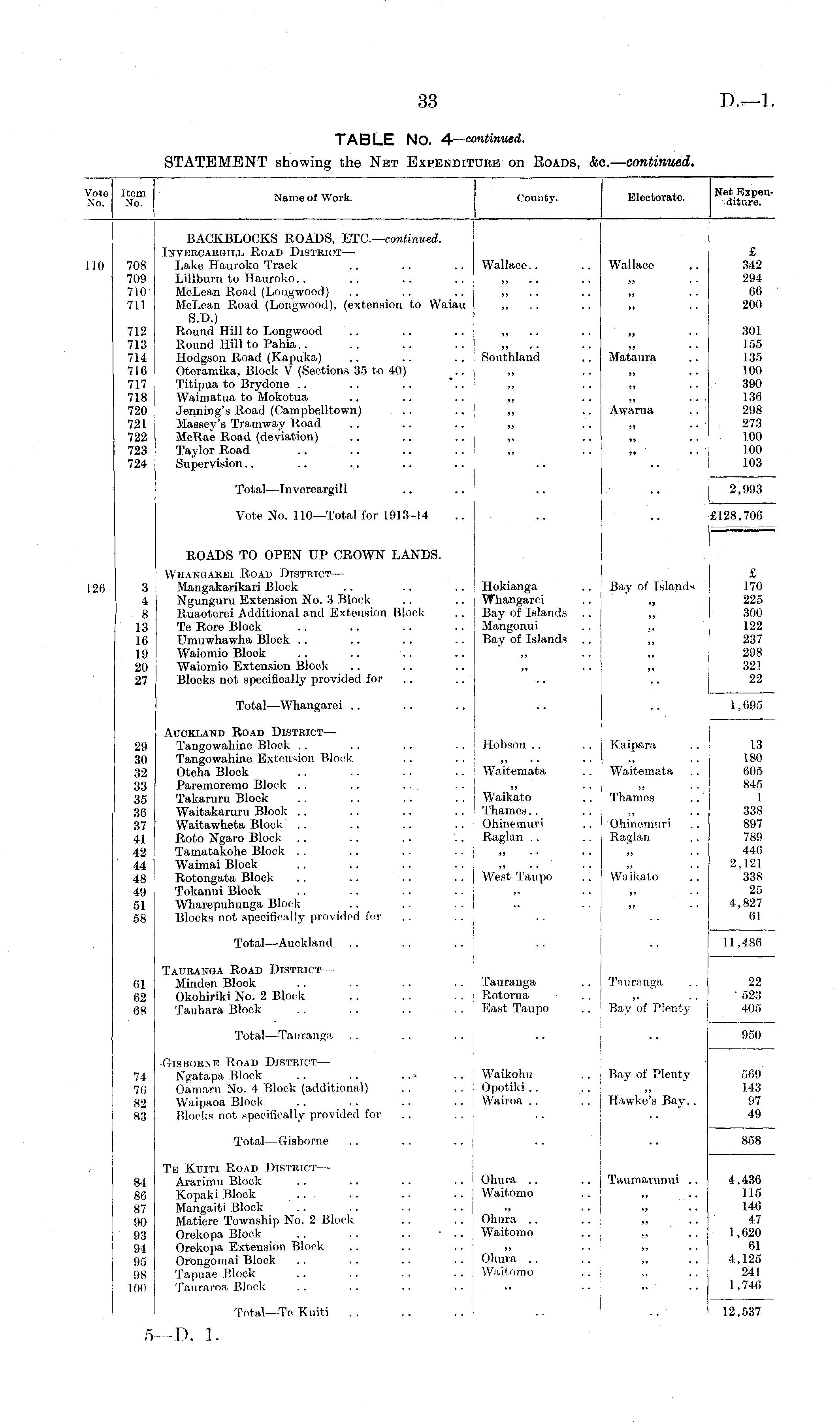 Vote No. Item No. Name of Work. County. Electorate. Net Expenditure. 110 708 709 710 711 712 713 714 716 717 718 720 721 722 723 724 BACKBLOCKS ROADS, ETC.— continued. Invercargill Road District — Lake Hauroko Track .. .. .. Wallace.. Lillburn to Hauroko.. .. .. .. I ,, McLean Road (Longwood) .. .. .. j „ McLean Road (Longwood), (extension to Waiau ,, S.D.) Round Hill to Longwood .. .. .. „ Round Hill to Pahia.. .. .. .. ,, Hodgson Road (Kapuka) .. .. .. Southland Oteramika, Block V (Sections 35 to 40) Titipua to Brydone .. .. .. *.. ,, Waimatua to Mokotua .. .. .. ,, Jenning's Road (Campbelltown) .. .. „ Massey's Tramway Road .. .. .. „ McRae Road (deviation) .. .. .. ,, Taylor Road .. .. .. .. ,, Supervision Wallace )» • ■ Mataura £ 342 294 60 200 301 155 135 100 390 136 298 273 100 100 103 Awarua )» • ■ Total—Invercargill 2,993 Vote No. 110—Total for 1913-14 £128,706 ROADS TO OPEN UP CROWN LANDS. Whangarei Road District — Mangakarikari Block .. .. .. Hokianga Ngunguru Extension No. 3 Block .. .. j Whangarei Ruaoterei Additional and Extension Block .. Bay of Islands Te Rore Block .. .. .. .. Mangonui Umuwhawha Block .. .. .. .. Bay of Islands Waiomio Block .. .. .. .. ,, Waiomio Extension Block .. .. .. ,, Blocks not specifically provided for .. Bay of Islands £ 170 225 300 122 237 298 321 22 126 3 4 8 13 u; 19 20 27 >> Total—Whangarei 1,695 2!) 30 .■{2 33 35 38 37 41 42 44 48 4!) 5] 58 Auckland Road District — Tangowahine Block .. . . . . . . Hobson .. Tangowahine Extension Block .. .. ,, Oteha Block .. .. .. .. ; Waitemata Paremoremo Block .. .. .. .. I ,, Takaruru Block .. .. . . .. Waikato Waitakaruru Block .. .. .. .. ! Thames.. Waitawheta Block .. .. .. .. I Ohinemuri Roto Ngaro Block .. .. .. .. I Raglan .. Tamatakohe Block .. .. .. .. ,, Waimai Block .. .. .. .. „ Rotongata Block .. .. .. .. West Taupo Tokanui Block .. .. .. .. ,. Wharepuhunga Block Blocks not specifically provided for .. .. j I Kaipara Waitemata Thames Ohineimiri Raglan 13 180 605 845 1 338 897 789 446 2,121 338 25 4,827 61 Waikato Total—Auckland 11,486 61 62 68 Tauranoa Road District — Minden Block .. . . .. . . Tauranga Okohiriki No. 2 Block .. .. . . ! Rotorua Tauhara Block .. . . . . . . East Taupo Tanranga 22 • 523 405 Bay 'of Plenty Total—Tauranga 950 •Otsborne Road District— Ngatapa Block .. .. .. .. Waikohu Oamaru No. 4 Block (additional) .. .. Opotiki .. Waipaoa Block .. .. .. .. Wairoa .. Block's not specifically provided for Bay of Plenty 569 143 97 49 74 76 82 83 Hawke's Bay.. Total— Gisborne 858 Te Kijtti Road District — Ararimu Block .. .. .. .. I Ohura .. Kopaki Block .. .. .. .. j Waitomo Mangaiti Block .. .. .. .. j ,, Matiere Township No. 2 Block .. .. j Ohura .. Orekopa Block .. . . .. • .. j Waitomo Orekopa Extension Block .. .. .. ; „ Orongomai Block . . .. .. .. I Ohura . . Tapuae Block .. .. .. .. Waitomo Tauraroa Block .. . . .. .. , ,, Taumarunui .. 4,436 115 146 47 1,620 61 4,125 241 1,740 84 86 87 90 93 94 95 98 100 . _ . 12,537 Total—Te Kuiti . . .. .. I