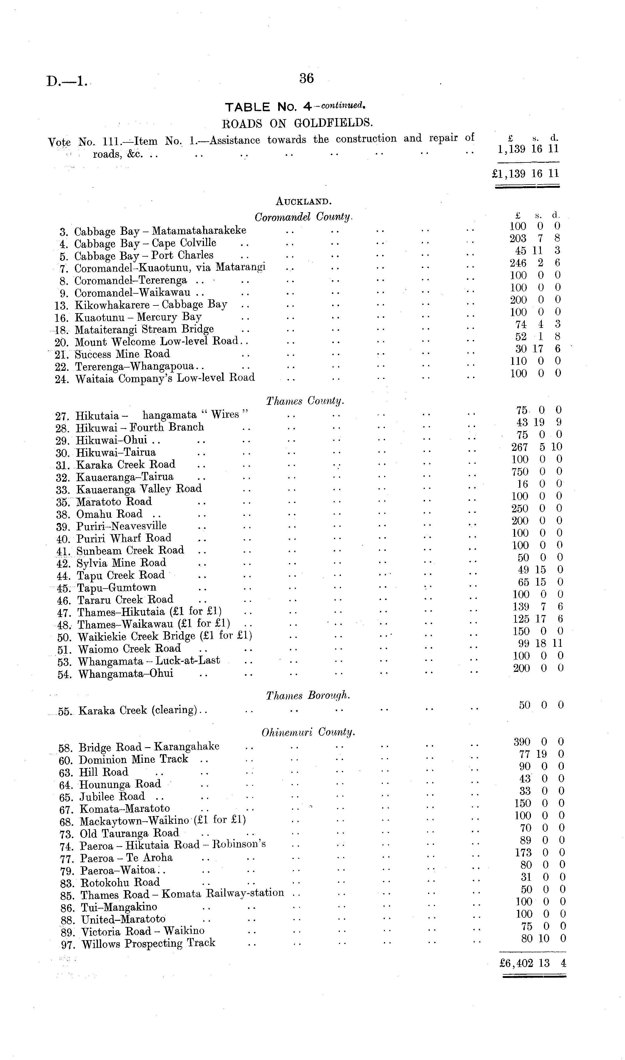 TABLE NO. 4— continued. ROADS ON GOLDFIELDS. Vote No 111 —Item No. I.—Assistance towards the construction and repair of £ s. d. roads, &c i' l39 16 U £1,139 16 11 Auckland. Goromandel County. £ »■ d 3. Cabbage Bay - Matamataharakeke .. ■ • • • • • • • J ( ' 4. Cabbage Bay - Cape Colville .. .. • • • • ■• ■ • . ° 5. Cabbage Bay - Port Charles .. ■• •• •• •• •• 9 _r or 7. Coromandel-Kuaotunu, via Matarangi ... .. •• •• •• fnn n n 8. Coromandel-Tererenga .. • .. •• •• •• •• •• " " 9. Coromandel-Waikawau .. .. • • • • ....... • • IUU U U 13. Kikowhakarere - Cabbage Bay tnn n 0 16. Kuaotunu - Mercury Bay . . • • • • • • • • • • V <* 18. Mataiterangi Stream Bridge .. .. • • • • • • • • ko . T 8 20. Mount Welcome Low-level Road. . .. .. •■• • • • on 17 a 21. Success Mine Road .. • • •• •• •• •• im n n 22. Tererenga-Whangapoua.. .. •• •• •• •• •• J 1 " " J 24. Waitaia Company's Low-level Road ... . • • • • ■ • ■ iUU v v Thames County. 27. Hikutaia- hangamata " Wires " .. .. •• •• •• Jj> 0. 0 28. Hikuwai - Fourth Branch .. ••••• • • • - tt n 29. Hikuwai-Ohui • <» u r " 30. Hikuwai-Tairua .. .. • • f b ' f 31. Karaka Creek Road •• "" " " 32. Kauaeranga-Tairua .. .. •• •• •• •• •• ?« n n 33. Kauaeranga Valley Road inn n n 35. Maratoto Road .. .. oka n n 38. Omahu Road om n n 39. Puriri-Neavesville • ™ „ " 40. Puriri Wharf Road Inn n n 41. Sunbeam Creek Road m n n 42. Sylvia Mine Road ~ .. ■• •■ •• •• •• ?q ir n 44. Tapu Creek Road ■ • ■ • « 1 k n 45. Tapu-Gumtown ••■ •• ™l° " 46. Tararu Creek Road \™ " " 47. Thames-Hikutaia (£1 for £3) , 48. Thames-Waikawau (£1 for £1) .. .. •• \f v b 50. Waikiekie Creek Bridge (£1 for £1) • •• •• ,» .11 51. Waiomo Creek Road inn n n 53. Whangamata-Luck-at-Last .. ■ onn n n 54. Whangamata-Ohui ™ v v Thames Borough. 55. Karaka Creek (clearing).. .. • • • • • • • • • • 50 0 0 Ohinemuri County. 58. Bridge Road - Karangahake .. .. •■ •• •• •• 0 0 60. Dominion Mine Track .. .. • • • • ■ • •;• • • '' ly " 63. Hill Road • • ,0 n n 64. Hoununga Road .. .. it n n 65. Jubilee Road ika n n 67. Komata-Maratoto .. ■ • ■ ■ • • Tnn n n 68. Mackaytown-Waikino (£1 for £1) «! n n 73. Old Tauranga Road «q n n 74. Paeroa - Hikutaia Road - Robinson's .. .-. ■■ •• •• °» v v 77. Paeroa -Te Aroha «n n n 79. Paeroa-Waitoa. ■• ■• •• •• oV n n 83. Rotokohu Road m n n 85. Thames Road - Komata Railway-station .. .. •• •■ •• W v v 86. Tui-Mangakino nn n n 88. United-Maratoto 7r n n 89. Victoria Road - Waikino .. ■■ •• ■■ •• ■• on in n 97. Willows Prospecting Track .. .. ••• • • • •■• ________ £6,402 13 4
