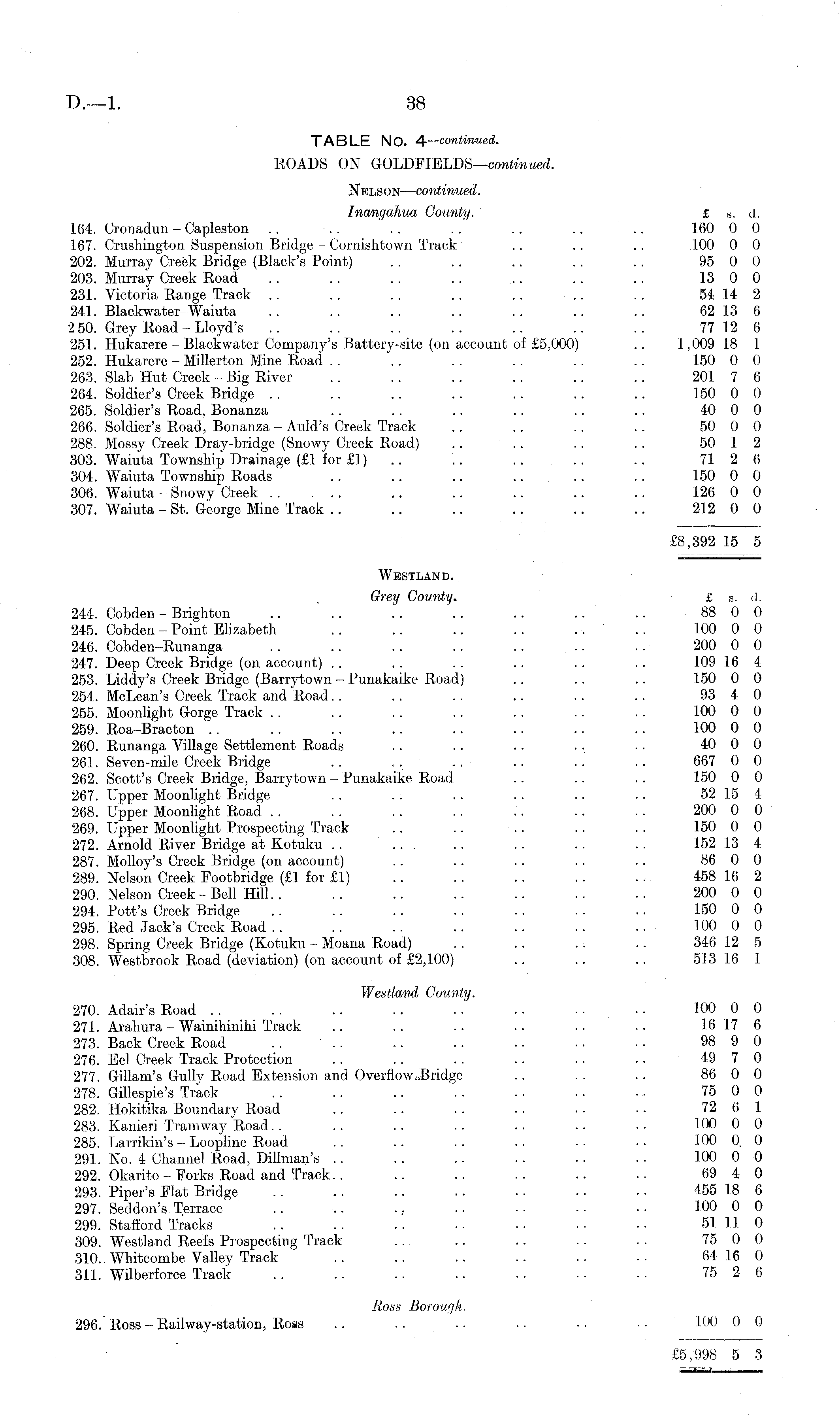 TABLE NO. A-~ con ti'n !u ed. ROADS ON GOLDFlELDS— continued. Nelson — continued. Inangahua County. £ s. d. 164. Oronadun - Capleston .. . . . . .. .. .. .. 160 0 0 1.67. Crushington Suspension Bridge - Cornishtown Track . . .. . . 100 0 0 202. Murray Creek Bridge (Black's Point) .. .. .. .. . . 95 0 0 203. Murray Creek Road . . .. .. . . ... .. .. 13 0 0 231. Victoria Range Track .. .. .. .. .. .. .'. 54 14 2 241. Blackwater-Waiuta .. .. .. .. .. .. .. 62 13 6 2 50. Grey Road - Lloyd's .. . . .. .. . . .. .. 77 12 6 251. Hukarere - Blackwater Company's Battery-site (on account of £S,OCX)) .. 1,009 18 1 252. Hukarere - Millerton Mine Road .. '.. .. .. .. .. 150 0 0 263. Slab Hut Creek - Big River .. .. .. .. .. .. 201 7 6 264. Soldier's Creek Bridge .. .. .. . . .. .. .. 150 0 0 265. Soldier's Road, Bonanza .. .. .. .. .. .. 40 0 0 266. Soldier's Road, Bonanza - Auld's Creek Track .. .. .. .. 50 0 0 288. Mossy Creek Dray-bridge (Snowy Creek Road) .. .. .. . . 50 1 2 303. Waiuta Township Drainage (£1 for £1) .. .. .. .. 71 2 6 304. Waiuta Township Roads .. .. .. .. .. .. 150 0 0 306. Waiuta - Snowy Creek .. .. .. .. .. 126 0 0 307. Waiuta - St. George Mine Track .. .. .. .. .. .. 212 0 0 £8,392 15 5 Westland. Grey County. £ s. d. 244. Cobden - Brighton .. .. .. .. .. .. .. 88 0 0 245. Cobden - Point Elizabeth . . .. .. .. .. . . 100 0 0 246. Cobden-Runanga .. .. .. .. .. .. . . 200 0 0 247. Deep Creek Bridge (on account) . . .. .. .. .. .. 109 16 4 253. Liddy's Creek Bridge (Barrytown - Punakaike Road) .. .. .. 150 0 0 254. McLean's Creek Track and Road. . .. .. .. .. .. 93 4 0 255. Moonlight Gorge Track . . . . .. .. . . .. .. 100 0 0 259. Roa-Braeton . . .. .. .. .. .. .. .. 100 0 0 260. Runanga Village Settlement Roads .. .. .. .. .. 40 0 0 261. Seven-mile Creek Bridge .. .. . . .. . . .. 667 0 0 262. Scott's Creek Bridge, Barrytown - Punakaike Road .. .. .. 150 0 0 267. Upper Moonlight Bridge .. .. .. .. .. .. 52 15 4 268. Upper Moonlight Road . . . . . . .. .. .. .. 200 0 0 269. Upper Moonlight Prospecting Track .. .. .. .. .. 150 0 0 272. Arnold River Bridge at Kotuku . . .. .. .. 152 13 4 287. Molloy's Creek Bridge (on account) .. .. .. .. .. 86 0 0 289. Nelson Creek Footbridge (£1 for £1) .. .. .. .. .. 458 16 2 290. Nelson Creek-Bell Hill.. .. .. .. .. .. ... 200 0 0 294. Pott's Creek Bridge .. .. .. .. .. . . .. 150 0 0 295. Red Jack's Creek Road . . .. . . .. .. . . .. 100 0 0 298. Spring Creek Bridge (Kotuku - Moana Road) .. .. .. .. 346 12 5 308. Westbrook Road (deviation) (on account of £2,100) .. .. .. 513 16 1 Westland County. 270. Adair's Road . . . . .. .. .. .-. .. • • 100 0 0 271. Arahura - Wainihinihi Track .. .. .. .. .. .. 16176 273. Back Creek Road . . 98 9 0 276. Eel Creek Track Protection .. .. . . .. .. .. 49 7 0 277. Gillam's Gully Road Extension and Overflow .Bridge .. .. .. 86 0 0 278. Gillespie's Track . . .. .. .. .. • • • • 75 0 0 282. Hokitika Boundary Road .. .. .. .. • ■ ■ • 72 6 1 283. Kanieri Tramway Road.. .. .. .. .. .. •• 100 0 0 285. Larrikin's - Loopline Road .. .. .. .. .. • • 100 0. 0 291. No. 4 Channel Road, Dillman's .. .. .. .. .. •• 100 0 0 292. Okarito - Forks Road and Track. . .. . . .. .. • • 69 4 0 293. Piper's Flat Bridge .. .. .. .. •. • ■ • • 455 18 6 297. Seddon's. Terrace .. .. ... .. .. .. .. 100 0 0 299. Stafford Tracks .. .. . . .. .. .. ... 51 11 0 309. Westland Reefs Prospecting Track .. .. .. .. .. 75 0 0 310.. Whitcombe Valley Track .. .. .. .. .. •• 64 16 0 311. Wilberforce Track .. .. .. .. .. • • ■ • 75 2 6 Ross Borough 296. Ross - Railway-station, Ross .. .. .. .. • • • • 100 0 0 £5,998 5 3