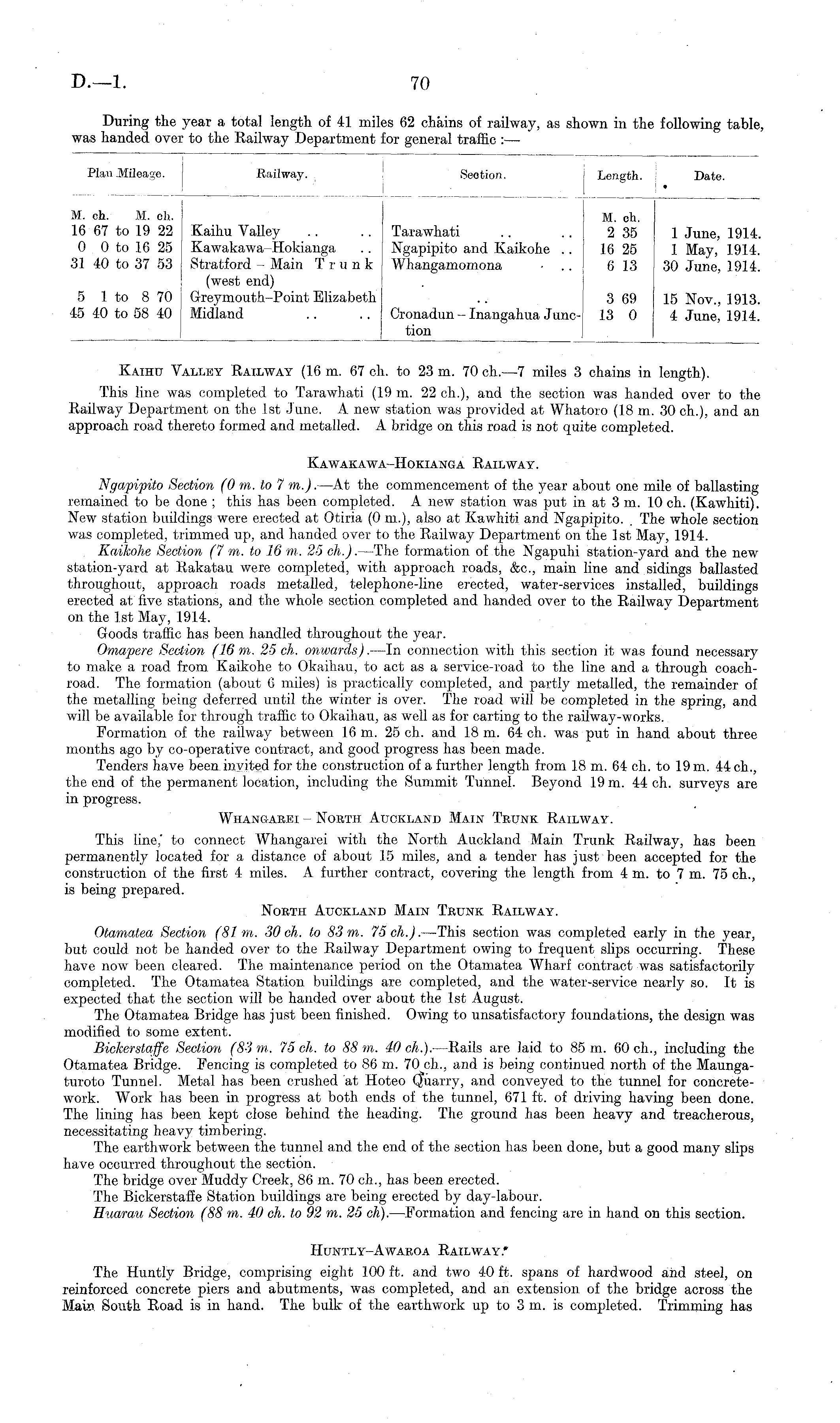 Plan Mileage. Railway. Seotion. Length. Date. M. oh. M. oh. 16 67 to 19 22 0 0 to 16 25 31 -10 to 37 53 Kaihu Valley Kawakawa-Hokianga Stratford - Main Trunk (west end) Greymouth-Point Elizabeth Midland Tarawhati Ngapipito and Kaikohe . . Whangamomona M. oh. 2 35 16 25 6 1.3 1 June, 1914. 1 May, 1914. 30 June, 1914. 5 1 to 8 70 45 40 to 58 40 Cronadun - Inangahua Junction 3 69 13 0 15 Nov., 1913. 4 June, 1914.