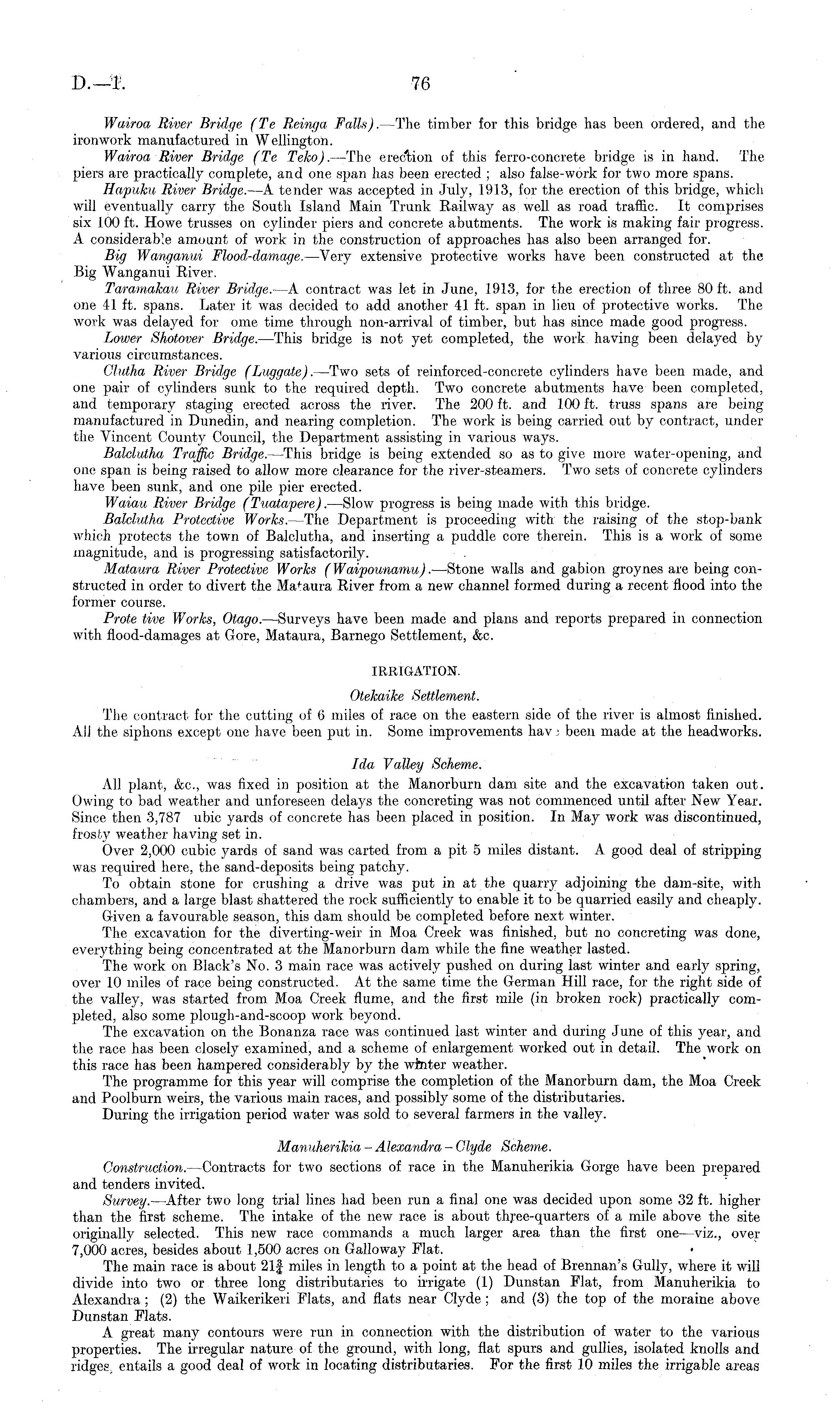 Wairoa River Bridge (Te Reinga Falls).— -The timber for this bridge has been ordered, and the ironwork manufactured in Wellington. Wairoa River Bridge (Te Teko). —The erection of this ferro-concrete bridge is in hand. The piers are practically complete, and one span has been erected ; also false-work for two more spans. Hapuku River Bridge. —A tender was accepted in July, 1913, for the erection of this bridge, which will eventually carry the South Island Main Trunk Railway as well as road traffic. It comprises six 100 ft. Howe trusses on cylinder piers and concrete abutments. The work is making fair progress. A considerable amount of work in the construction of approaches has also been arranged for. Big Wanganui Flood-damage. —Very extensive protective works have been constructed at the Big Wanganui River. Taramakait River Bridge. —A contract was let in June, 1913, for the erection of three 80 ft. and one 4-1 ft. spans. Later it was decided to add another 41 ft. span in lieu of protective works. The work was delayed for ome time through non-arrival of timber, but has since made good progress. Lower Shotover Bridge. —This bridge is not yet completed, the work having been delayed by various circumstances. Clutha River Bridge (Luggate). —Two sets of reinforced-concrete cylinders have been made, and one pair of cylinders sunk to the required depth. Two concrete abutments have been completed, and temporary staging erected across the river. The 200 ft. and 100 ft. truss spans are being manufactured in Dunedin, and nearing completion. The work is being carried out by contract, under the Vincent County Council, the Department assisting in various ways. Balclutha Traffic Bridge. —This bridge is being extended so as to give more water-opening, and one span is being raised to allow more clearance for the river-steamers. Two sets of concrete cylinders have been sunk, and one pile pier erected. Waiau River Bridge (Tuatapere). —Slow progress is being made with this bridge. Balclutha Protective Works. —The Department is proceeding with the raising of the stop-bank which protects the town of Balclutha, and inserting a puddle core therein. This is a work of some magnitude, and is progressing satisfactorily. Mataura River Protective Works (Waipounamu). —Stone walls and gabion groynes are being constructed in order to divert the Mataura River from a new channel formed during a recent flood into the former course. Prote five Works, Otago. —Surveys have been made and plans and reports prepared in connection with flood-damages at Gore, Mataura, Barnego Settlement, &c. IRRIGATION. Otekaike Settlement. The contract for the cutting of (5 miles of race on the eastern side of the river is almost finished. All the siphons except one have been put in. Some improvements hay; been made at the headworks. Ida Valley Scheme. All plant, &c, was fixed in position at the Manorburn dam site and the excavation taken out. Owing to bad weather and unforeseen delays the concreting was not commenced until after New Year. Since then 3,787 übic yards of concrete has been placed in position. In May work was discontinued, frosty weather having set in. Over 2,000 cubic yards of sand was carted from a pit 5 miles distant. A good deal of stripping was required here, the sand-deposits being patchy. To obtain stone for crushing a drive was put in at the quarry adjoining the dam-site, with chambers, and a large blast shattered the rock sufficiently to enable it to be quarried easily and cheaply. Given a favourable season, this dam should be completed before next winter. The excavation for the diverting-weir in Moa Creek was finished, but no concreting was done, everything being concentrated at the Manorburn dam. while the fine weather lasted. The work on Black's No. 3 main race was actively pushed on during last winter and early spring, over 10 miles of race being constructed. At the same time the German Hill race, for the right side of the valley, was started from Moa Creek flume, and the first mile (in broken rock) practically completed, also some plough-and-scoop work beyond. The excavation on the Bonanza race was continued last winter and during June of this year, and the race has been closely examined, and a scheme of enlargement worked out in detail. The work on this race has been hampered considerably by the winter weather. The programme for this year will comprise the completion of the Manorburn dam, the Moa Creek and Poolburn weirs, the various main races, and possibly some of the distributaries. During the irrigation period water was sold to several farmers in the valley. Manuherihia -Alexandra - Clyde Scheme. Construction. —Contracts for two sections of race in the Manuherikia Gorge have been prepared and tenders invited. Survey. —After two long trial lines had been run a final one was decided upon some 32 ft. higher than the first scheme. The intake of the new race is about three-quarters of a mile above the site originally selected. This new race commands a much larger area than the first one —viz., over 7,000 acres, besides about 1,500 acres on Galloway Flat. The main race is about 21| miles in length to a point at the head of Brennan's Gully, where it will divide into two or three long distributaries to irrigate (1) Dunstan Flat, from Manuherikia to Alexandra ; (2) the Waikerikeri Flats, and flats near Clyde ; and (3) the top of the moraine above Dunstan Flats. A great many contours were run in connection with the distribution of water to the various properties. The irregular nature of the ground, with long, flat spurs and gullies, isolated knolls and ridges, entails a good deal of work in locating distributaries. For the first 10 miles the irrigable areas