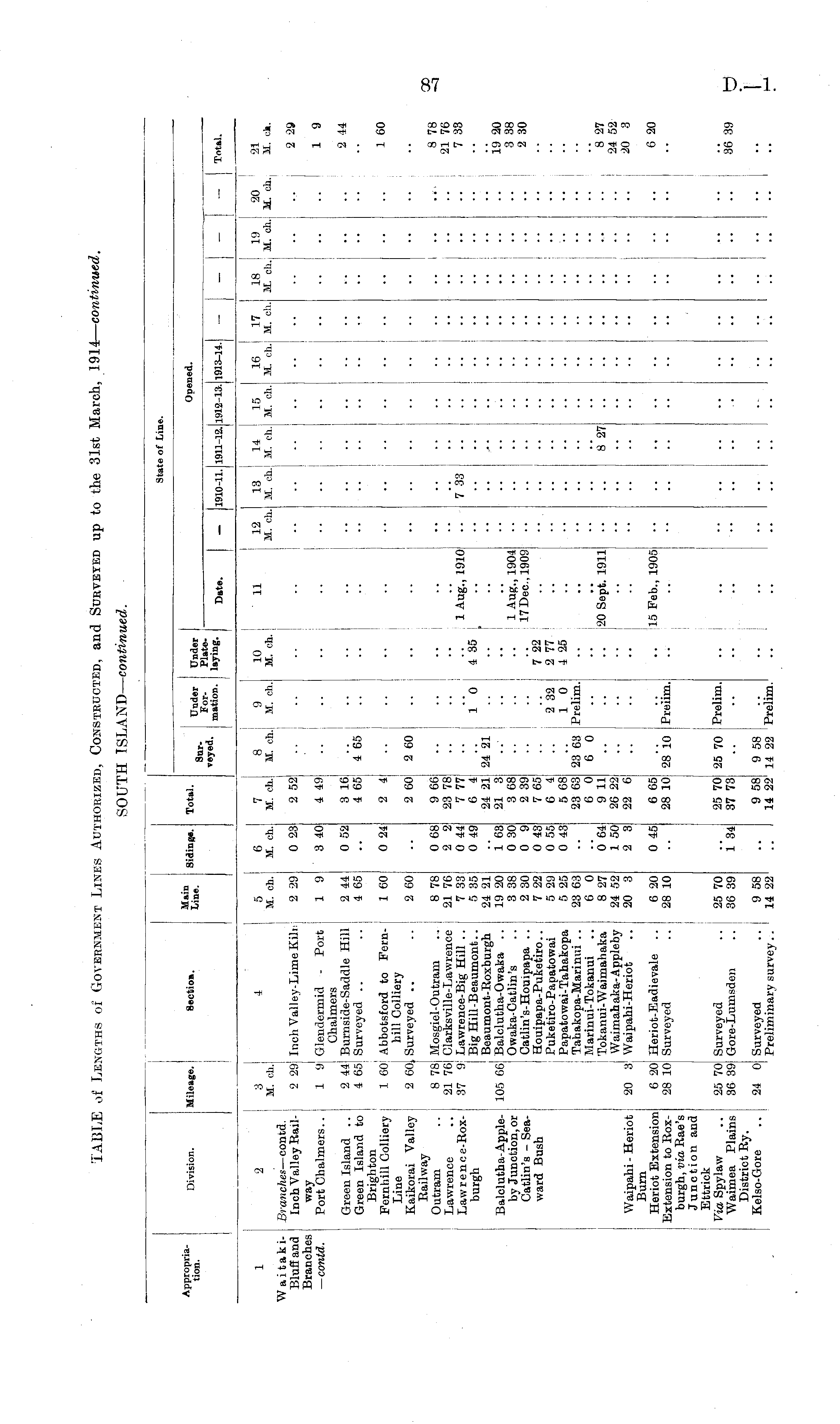 TABLE of Lengths of Government Lines Authorized, Constructed, and Surveyed up to the 31st March, 1914— continued. SOUTH ISLAND— continued.