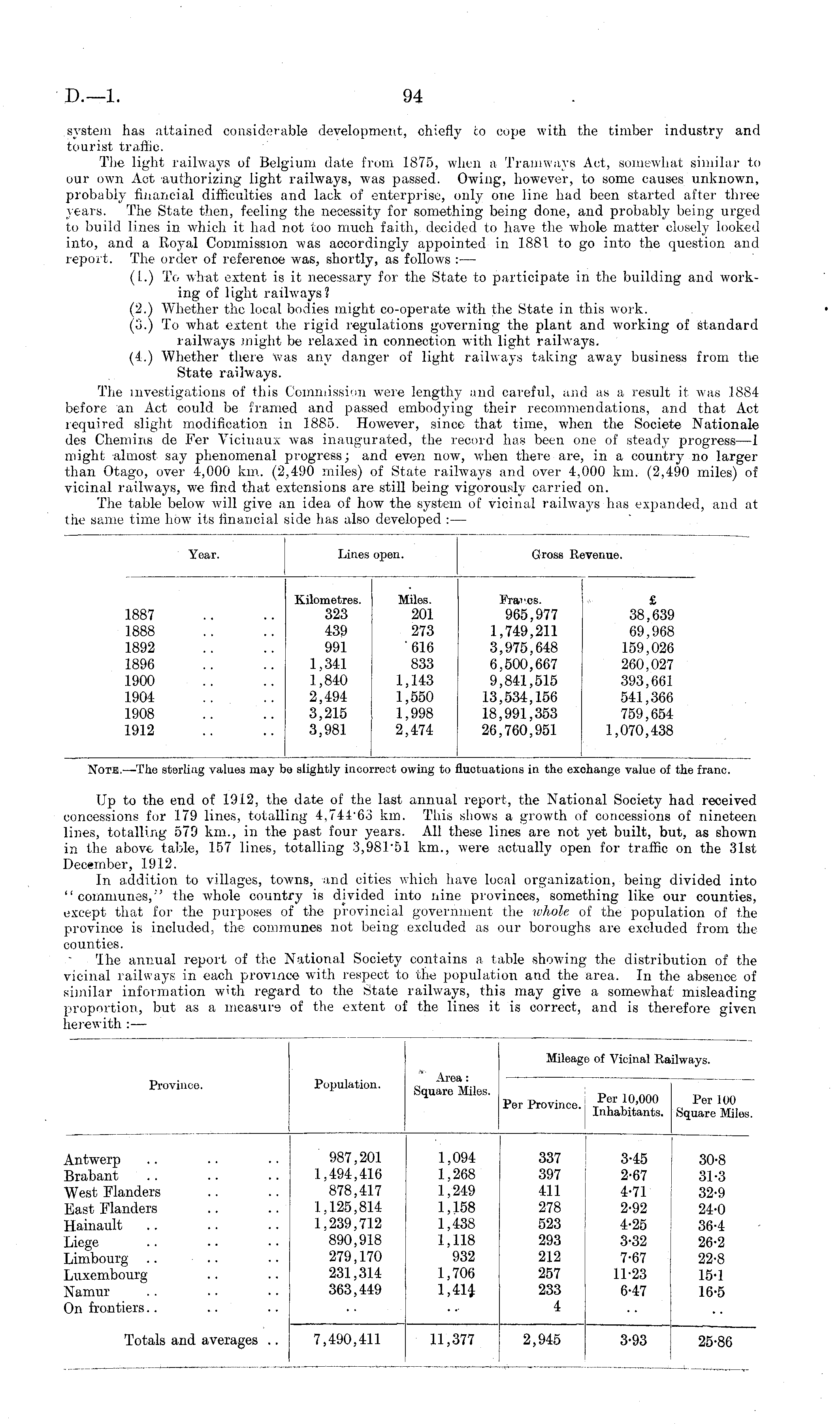 Note.—The sterliug values may be slightly incorrect owing to fluctuations in the exchange value of the franc. Up to the end of 1912, the date of the last annual report, the National Society had received concessions for 179 lines, totalling 4,74463 km. This shows a growth of concessions of nineteen lines, totalling 579 km., in the past four years. All these lines are not yet built, but, as shown in the above table, 157 lines, totalling 3,981-51 km., were actually open for traffic on the 31st December, 1912. In addition to villages, towns, and cities which have local organization, being divided into "communes,'' , the whole country is divided into nine provinces, something like our counties, except that for the purposes of the provincial government the whole of the population of the province is included, the communes not being excluded as our boroughs are excluded from the counties. The annual report of the National Society contains a table showing the distribution of the vicinal railways in each province with respect to the population and the area. In the absence of similar information with regard to the State railways, this may give a somewhat misleading proportion, but as a measure of the extent of the lines it is correct, and is therefore given herewith :—